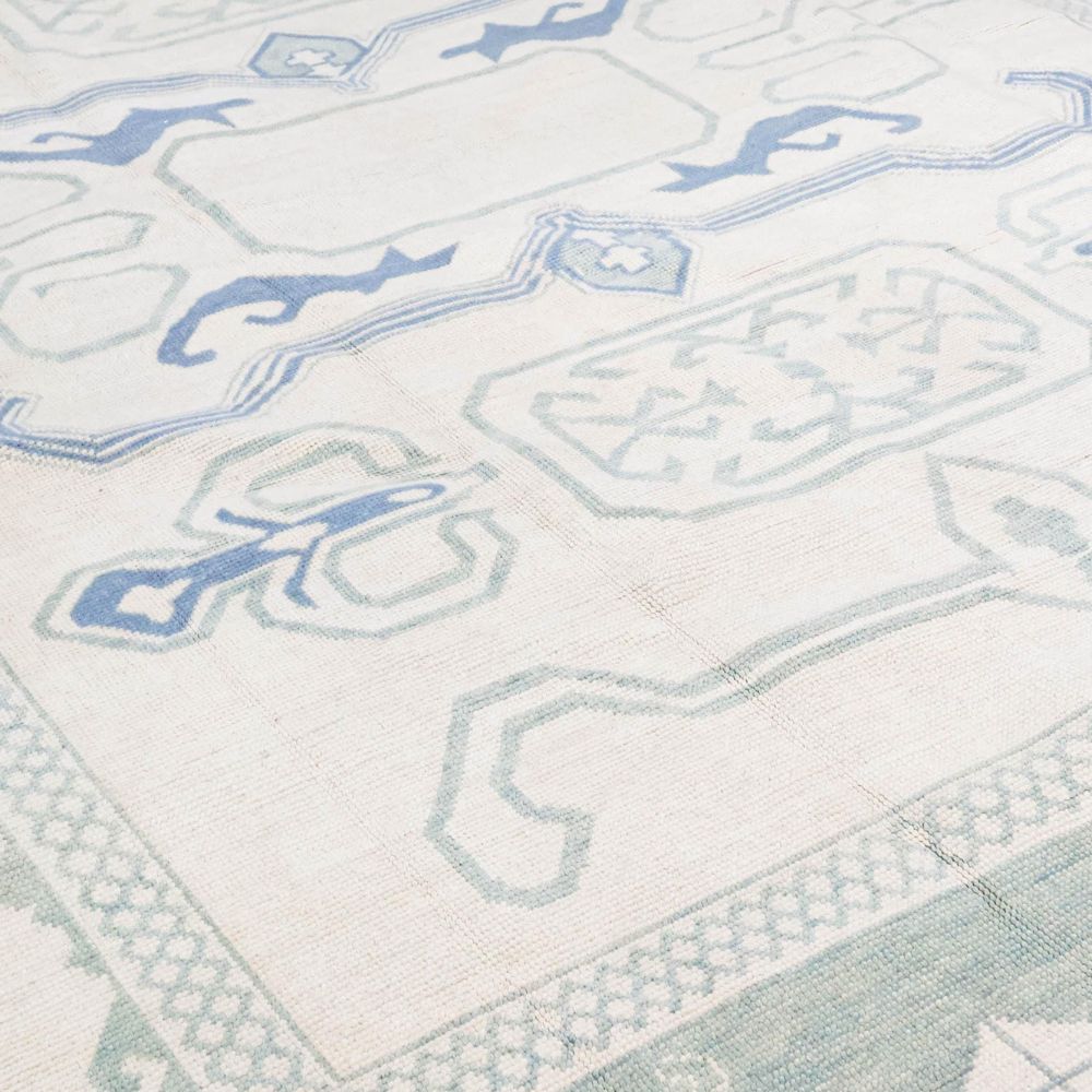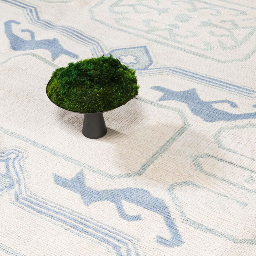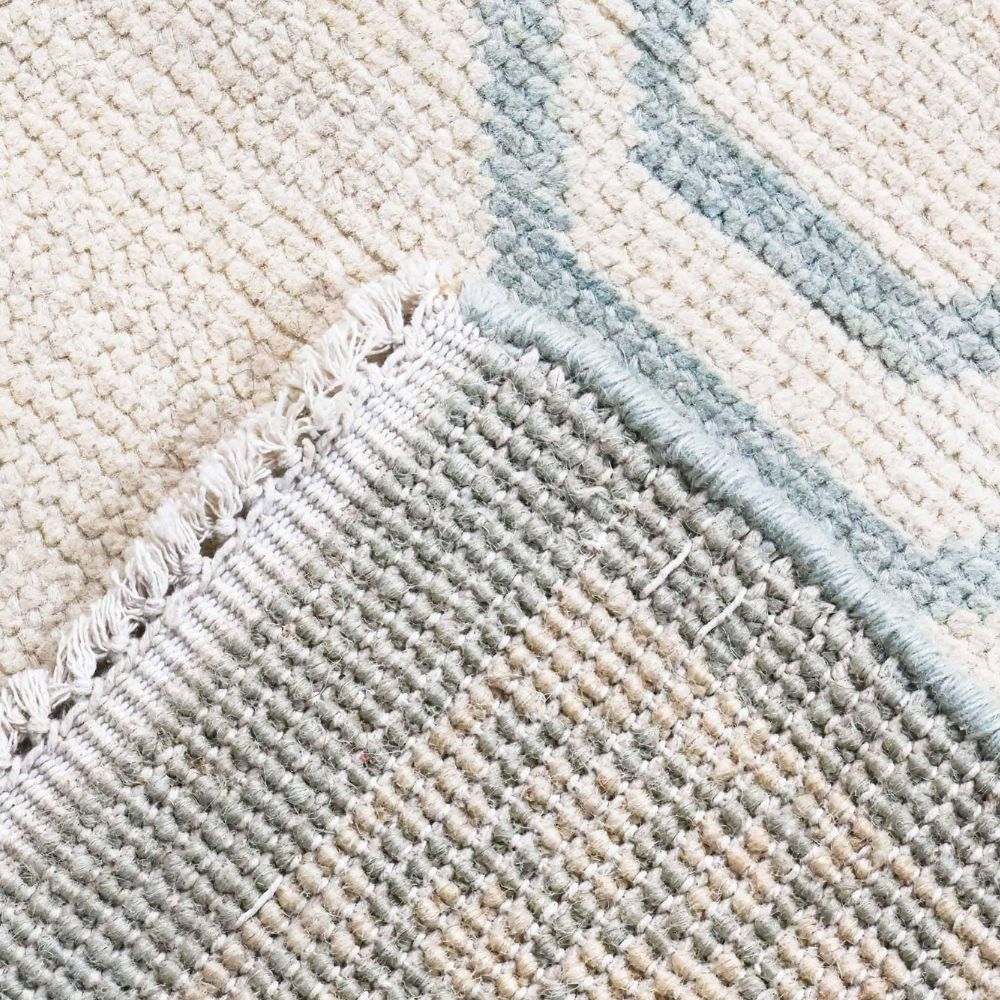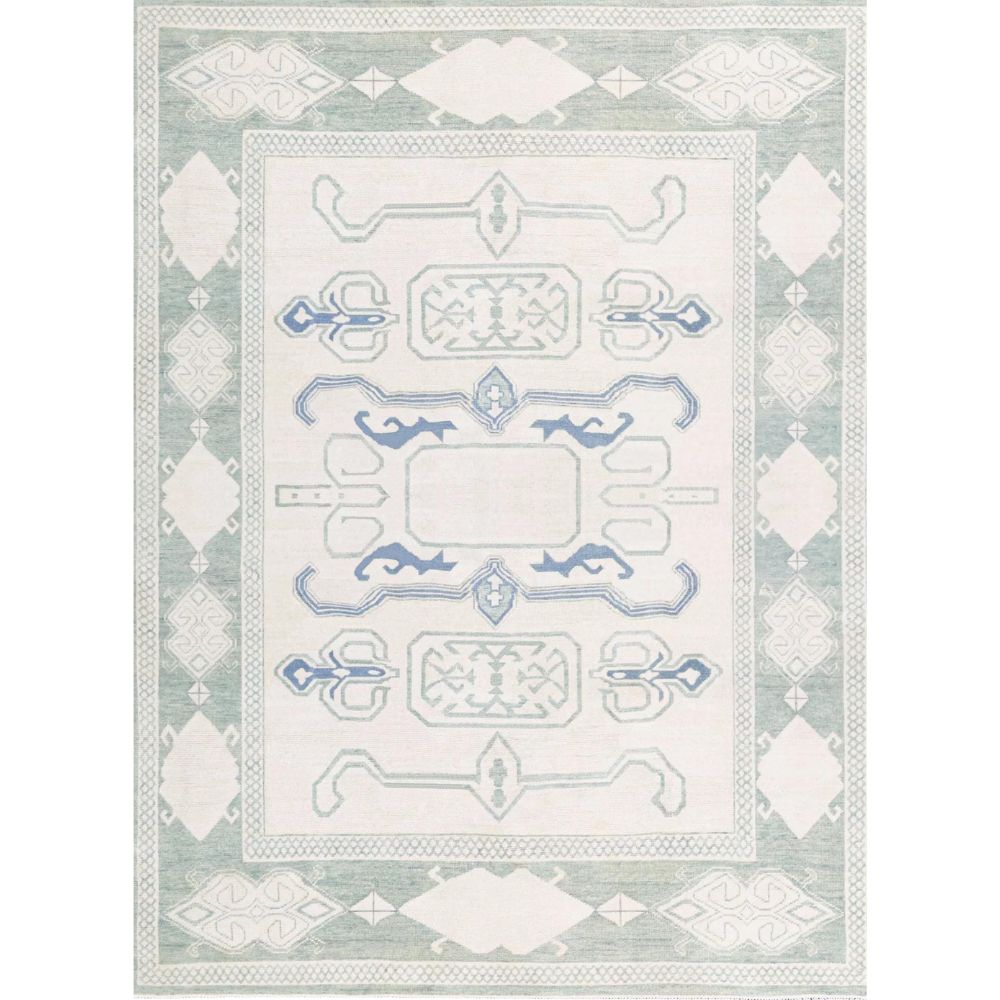 Softness in color. Strength in heritage. The Whisper Weave Rug by AnsariRugDesign brings a quiet grace to your home with its airy color palette and traditional tribal detailing. Inspired by Turkish kilims and reimagined in pastel tones, this hand-knotted wool rug is the embodiment of balance between past and present, design and stillness. Color Story: Delicate ivory forms the base, bordered with soft sage green and accented by muted periwinkle, powder blue, and faded teal. This refreshing, coastal-inspired palette pairs effortlessly with light-toned interiors, boho decor, or serene bedrooms. Design & Pattern: At its heart, this rug features a symmetrical tribal arrangement diamond shapes, stylized hooks, and abstract totem-like forms repeat in an elegant rhythm. The faded effect mimics timeworn rugs, yet the layout remains sharp and balanced. The frame is finished with a beautiful multi-layered border, combining classic motifs with a modern pastel execution. Colors may look different depending on your device screen. We try to represent each rug as accurately as possible. As it Appears Pack of One Piece.