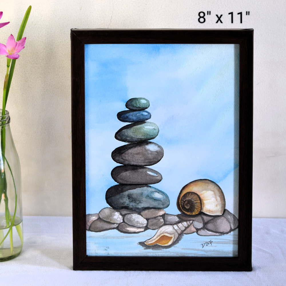 A calming and hyper-realistic watercolor painting titled “Balanced Pebbles,†portraying a stack of smooth stones delicately balanced beside a seashell on a bed of rocks. The soft gradients of the blue sky and gentle water reflections evoke peace, clarity, and mindfulness. With detailed texture and natural tones, this artwork brings the essence of zen and harmony into any space, ideal for meditation corners, spa decor, or minimalist interiors.