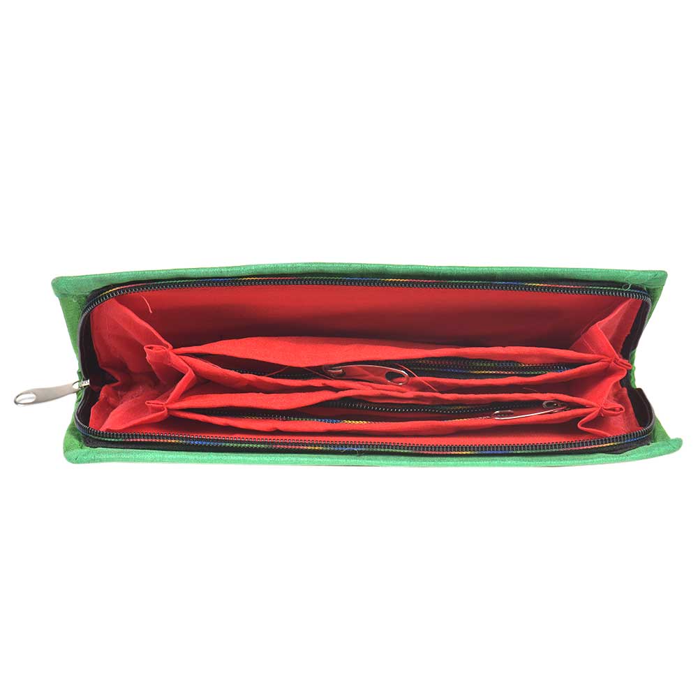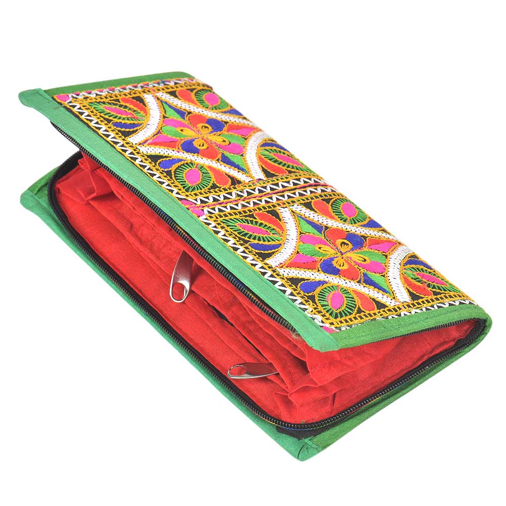 This is a beautiful clutch with mint condition, embroidered fabric on front and imitation raw silk on back, trims and inside. 3 silk section dividers inside the clutch purse. One zippered pocket inside. Two open pockets inside. This beautiful yet functional clutch purse would be ideal for formal or informal occasions.