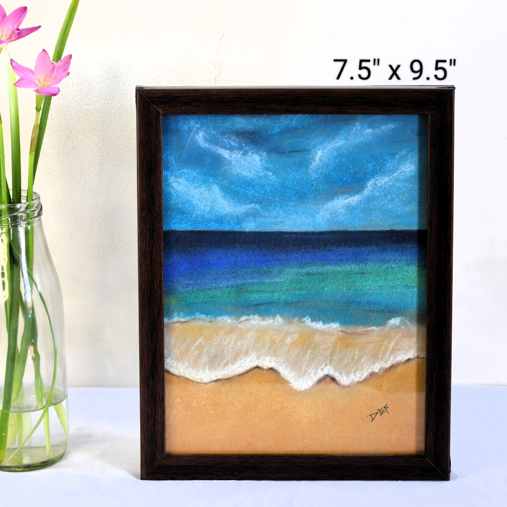 A captivating soft pastels artwork titled “Beach Art†showcasing a tranquil shoreline where soft waves kiss the warm sandy beach. With a seamless blend of ocean blues, seafoam whites, and golden sand, the piece beautifully captures the calm essence of a tropical seascape. This serene beach composition brings a touch of coastal charm and relaxation, perfect for beach lovers and peaceful interiors.