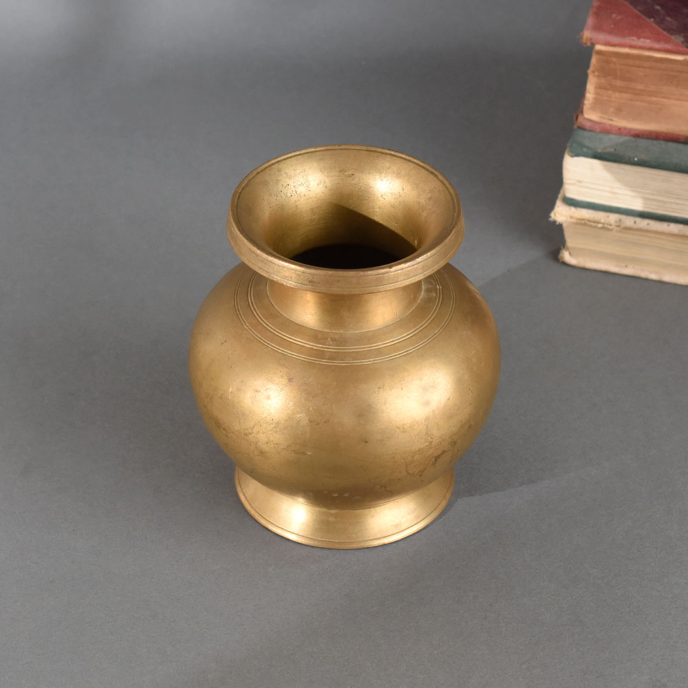 This antique brass holy water pot is a beautifully handcrafted piece inspired by traditional Indian design. Known as a “Lota,†it has been used for centuries in religious ceremonies, daily puja, and temple rituals to hold sacred water. The pot features a rounded belly, narrow neck, and wide flared mouth, giving it a graceful yet functional shape. Crafted from solid brass, this pot not only carries cultural and spiritual significance but also exudes a warm golden sheen that adds elegance to any space. Its smooth surface and vintage finish make it a collectible item for antique lovers and a perfect addition to home décor or sacred altars. Whether used for rituals, as a decorative artifact, or as a heritage collectible, this brass pot reflects timeless tradition and craftsmanship.