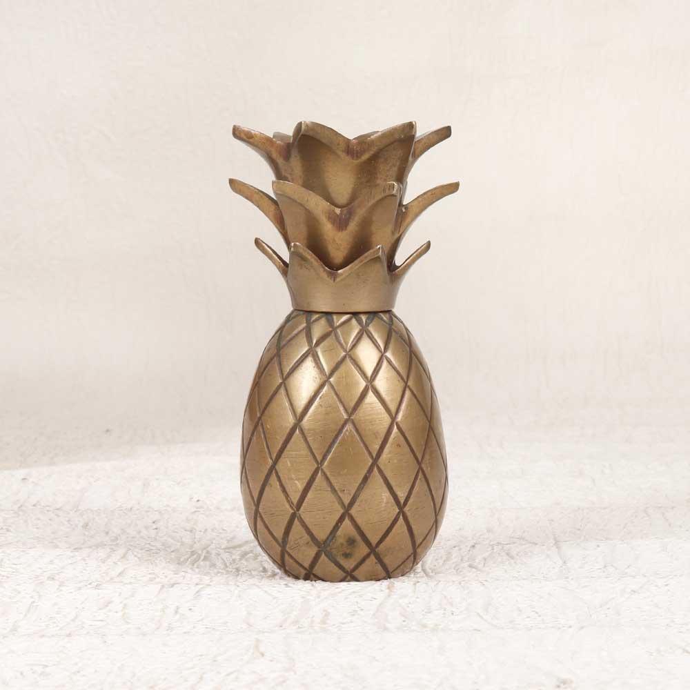 Make every evening an escape to the tropics with the Vintage Brass Pineapple Candle Holder. This showstopping accent piece brings handcrafted artistry and vintage styling to your home decor. Molded from solid brass, intricate detailing reflects the ridges and leaves of a pineapple. Place a taper or pillar candle in the base and let the flickering light transport you. For those looking to add a touch of island paradise to their home, this candle holder is sure to delight. The vintage styling and handcrafted look provide exotic, faraway feels with artisanal charm. Illuminating this brass pineapple creates a warm, tropical glow for relaxing evenings at home. Use it to infuse any space with a sense of character and whimsy. This sculptural accent piece makes a stunning statement on console tables, mantels, shelves or dining tables. Let your home decor reflect the beauty of exotic destinations and channel a sense of paradise with this gorgeous pineapple candle holder.
