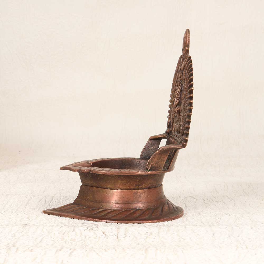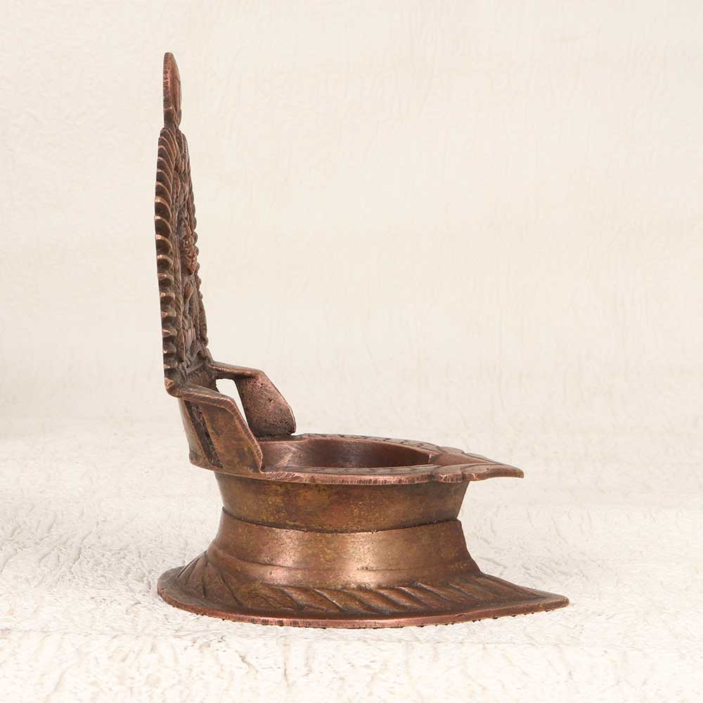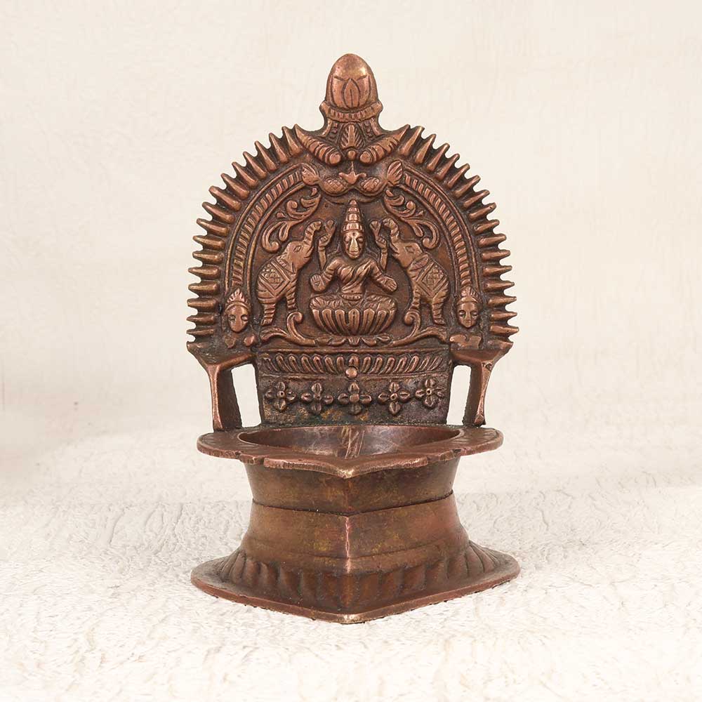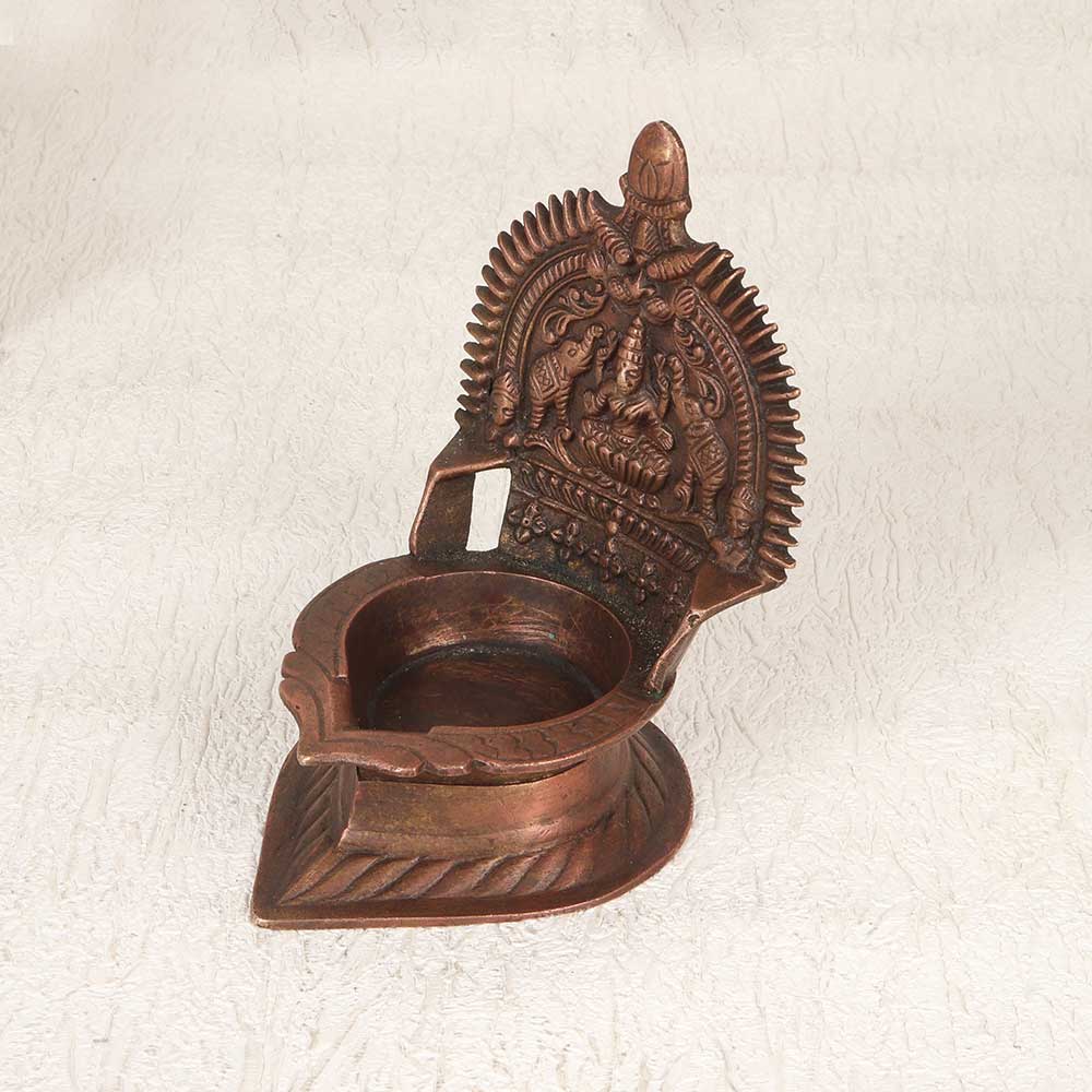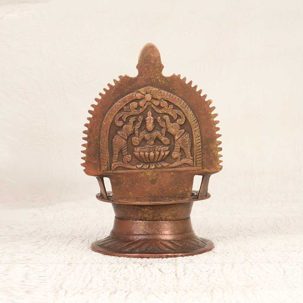 Welcome auspicious energy into your home with this antique South Indian brass Gajlakshmi Oil Lamp. Showcasing traditional Indian craftsmanship, this beautiful lamp depicts the goddess Gajlakshmi, revered as the giver of prosperity and good luck. Her graceful form is surrounded by elephants bathing her in abhisheka water. The intricate cutwork design allows the lamp's light to shine through when lit, creating a serene glow. Place this lamp on your altar to focus your meditations, in your workspace to invite success, or anywhere you wish to cultivate tranquility. An heirloom-quality piece, this handcrafted brass lamp adds spiritual meaning and timeless elegance. Let its light fill your home with blessings and peace.