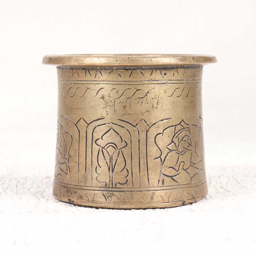 Sanctify your home with this antique engraved brass panchpatra holy water pot. Featuring the divine five-leaf shape and intricate motifs, this pot brings an aura of purity and blessings into your space. Bring the essence of the gods into your home with this special panchpatra pot. Lovingly shaped and engraved by skilled artisans, it makes the ideal vessel for sacred water from the Ganges. Place pride of place in your shrine as a meaningful symbol of your faith and spirituality. Its intricate brasswork and vintage patina make it a decorative accent on its own too. A thoughtful gift for devotees who will cherish its spiritual significance. For seekers wanting an authentic, handmade brass pot that connects with ancient culture, this engraved panchpatra pot is perfect. Let its divine form and aura uplift your space and environment with its sacred presence.