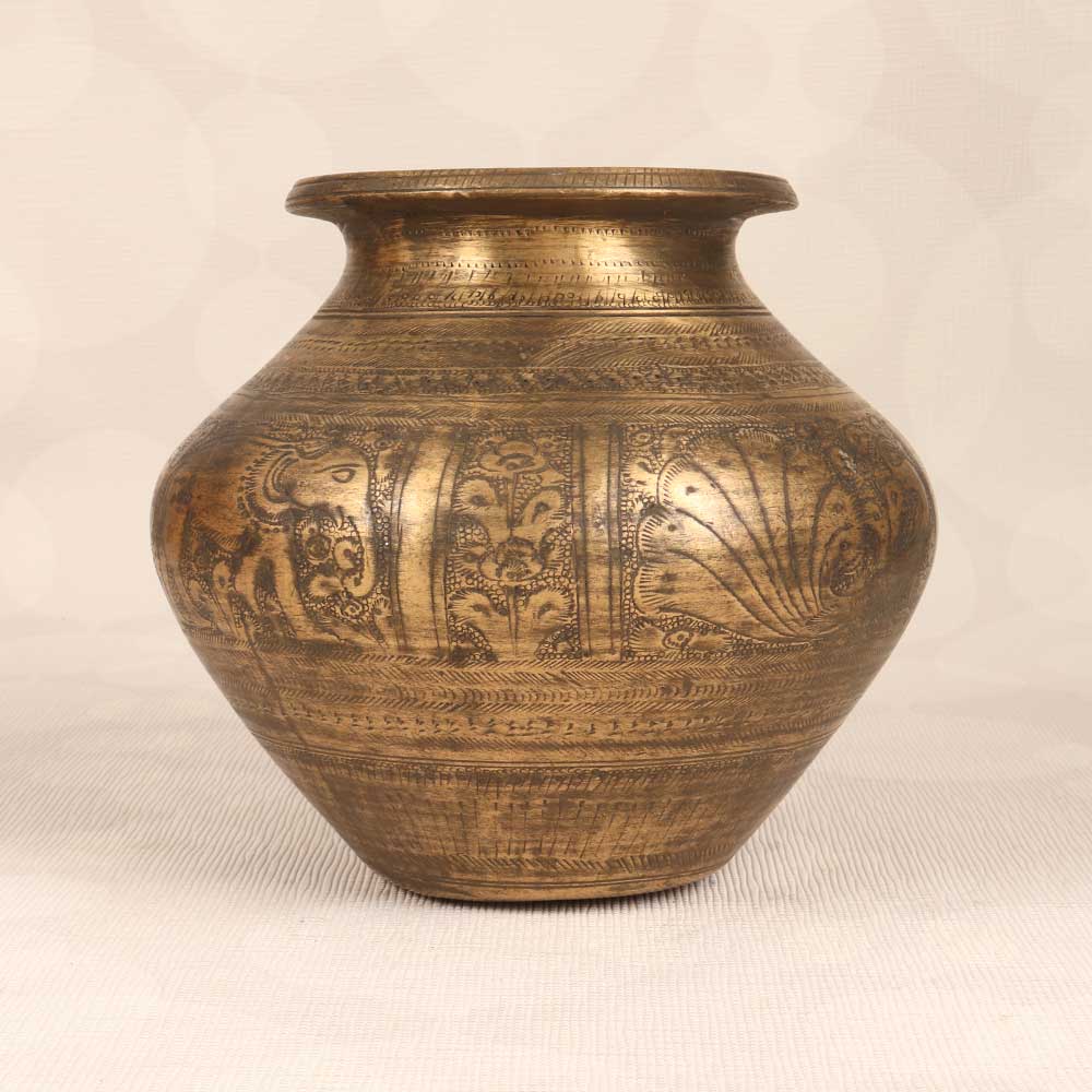 - Vintage brass pot with engraved floral motifs