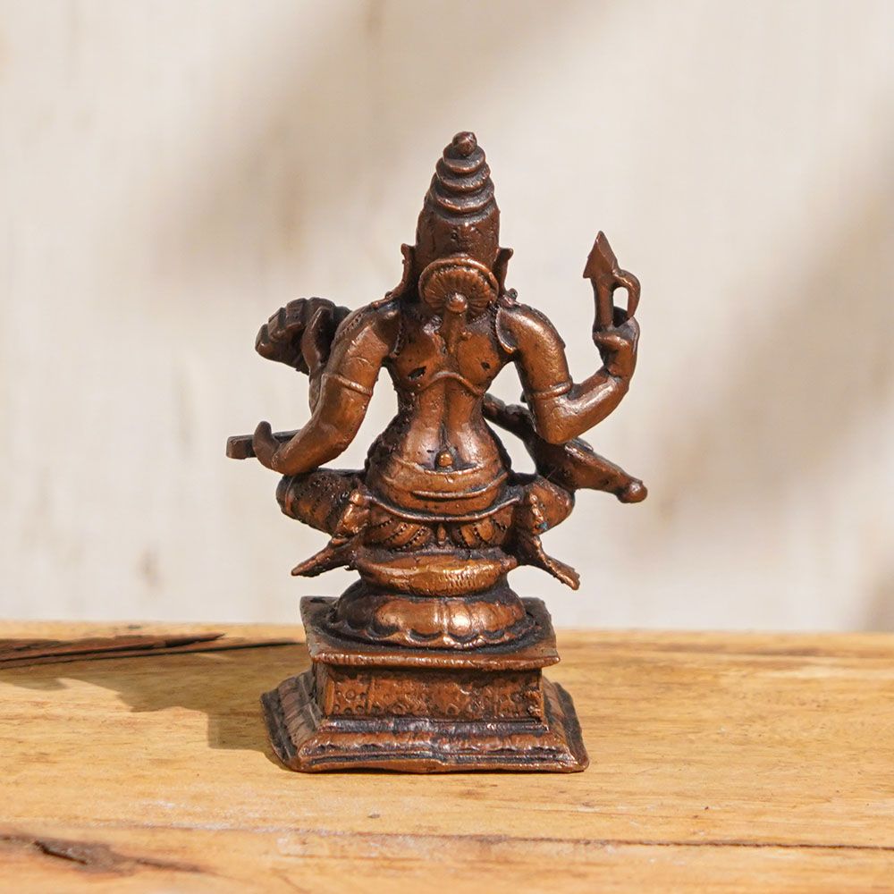 An exquisite copper statue that depicts the Hindu goddess Saraswati, the patroness of knowledge, arts, and music. Seated with her veena in hand, this stunning statue is a symbol of creativity, learning, and inspiration. Handcrafted by skilled Indian craftsmen, this statue is made of copper, which is considered to be an auspicious metal in Hindu mythology. The intricate details of the goddess statue nd the delicate curves of the veena are all testament to the dedication and skill of the artisans who created it. This beautiful Saraswati copper statue is perfect for use as a Hindu god idol in your prayer room, or as a decorative item in your home, office, restaurant, hotel or shop. Its elegance and craftsmanship make it an ideal gift for special or festive occasions, such as weddings, housewarming ceremonies, or religious festivals. If you're looking to buy a Goddess Saraswati idol online, this copper statue is an excellent choice.