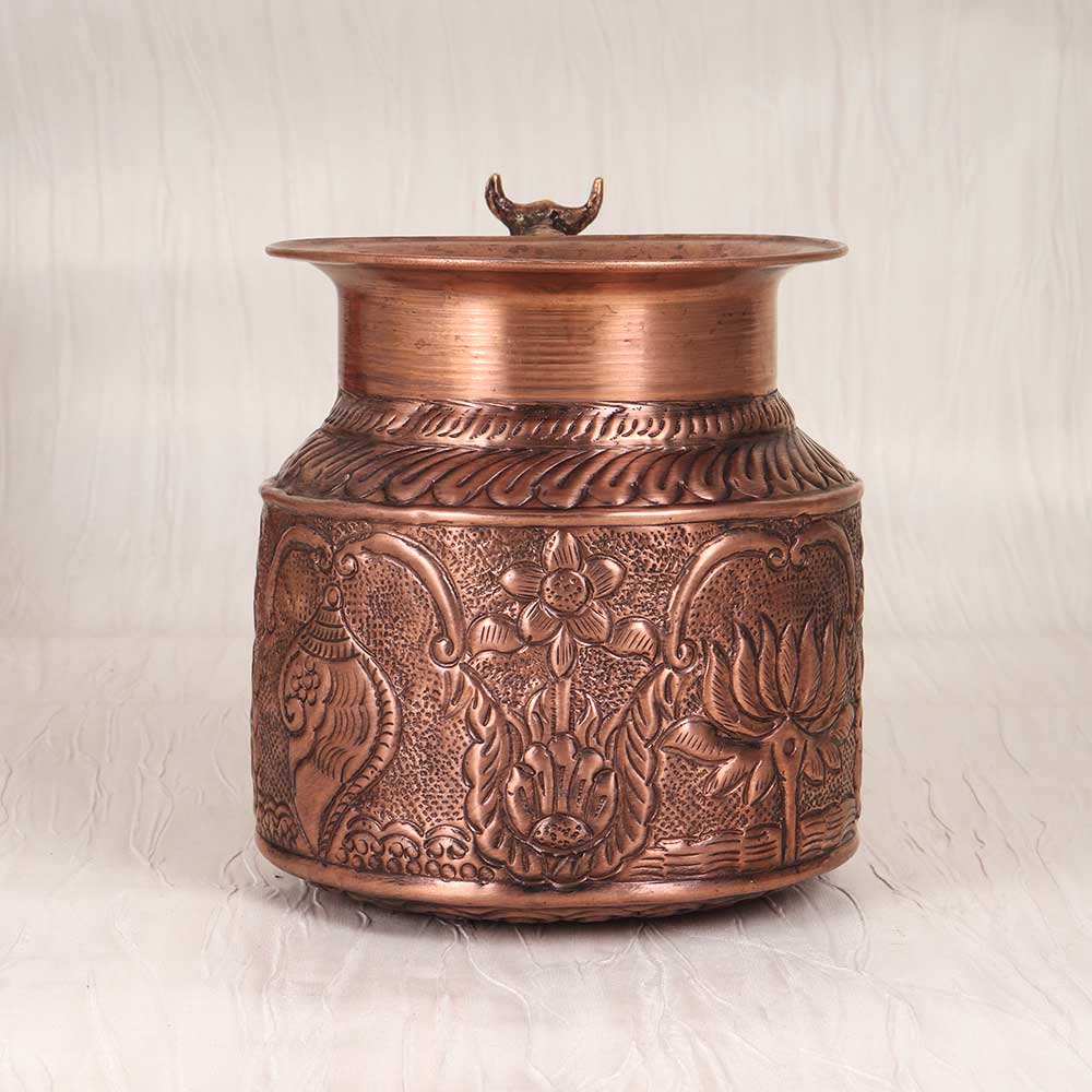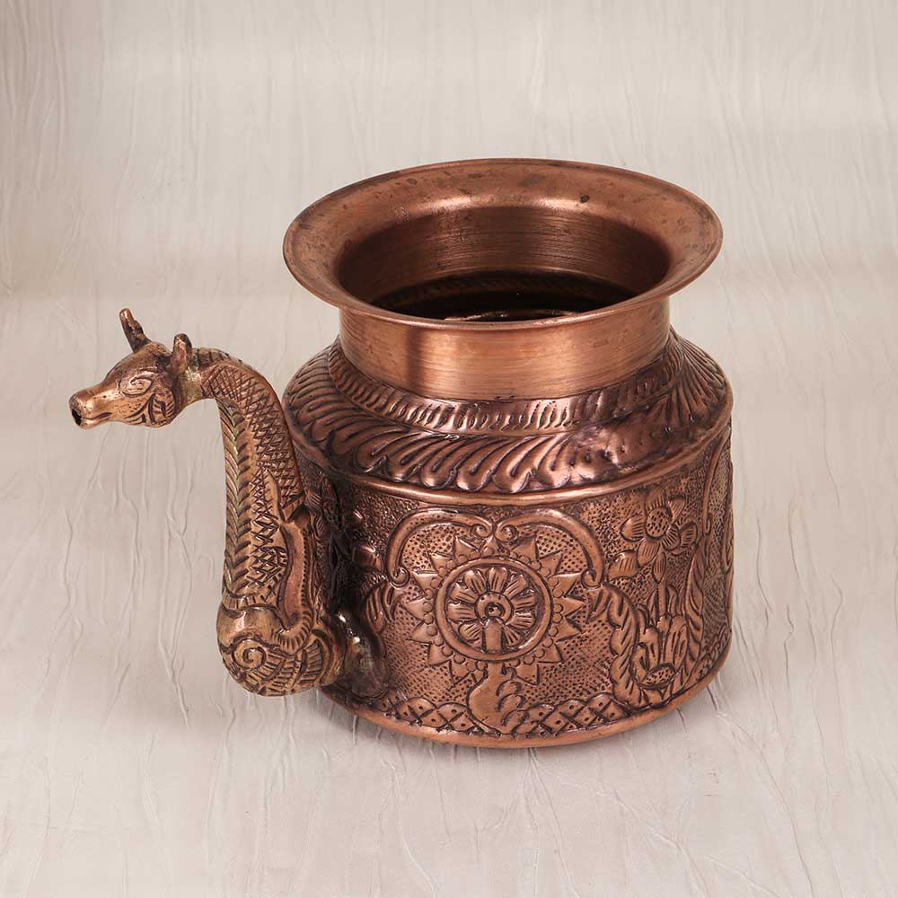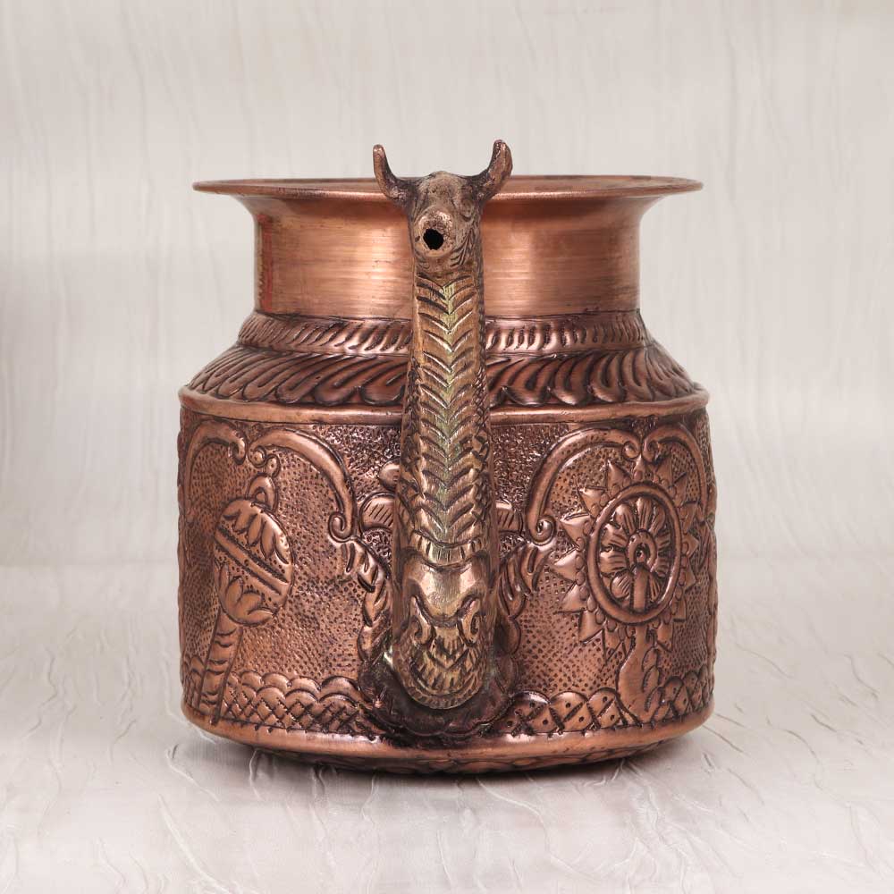 Make a stylish statement while boiling water with this artistic copper water pot. The pot features a traditional Nandi spout and a hand-engraved design of intricate floral motifs. This pot doesn't just look beautiful - it functions beautifully too. The thick copper construction conducts heat rapidly and evenly. The copper also retains heat effectively so boiled water stays hotter for longer. This pot is perfect for anyone who appreciates the artistic as well as the practical. The graceful silhouette and engraved motifs are a gorgeous decorative accent in any kitchen. And the copper material provides fast, efficient heating that any cooking enthusiast will love. Elevate your kitchen with this copper water pot that combines striking Indian-inspired design with high performance. An elegant yet functional pot no home should be without.