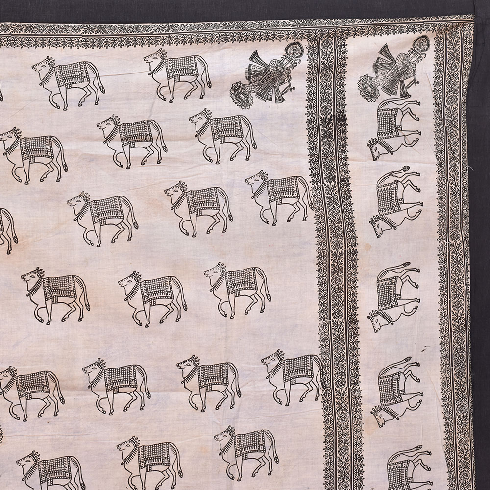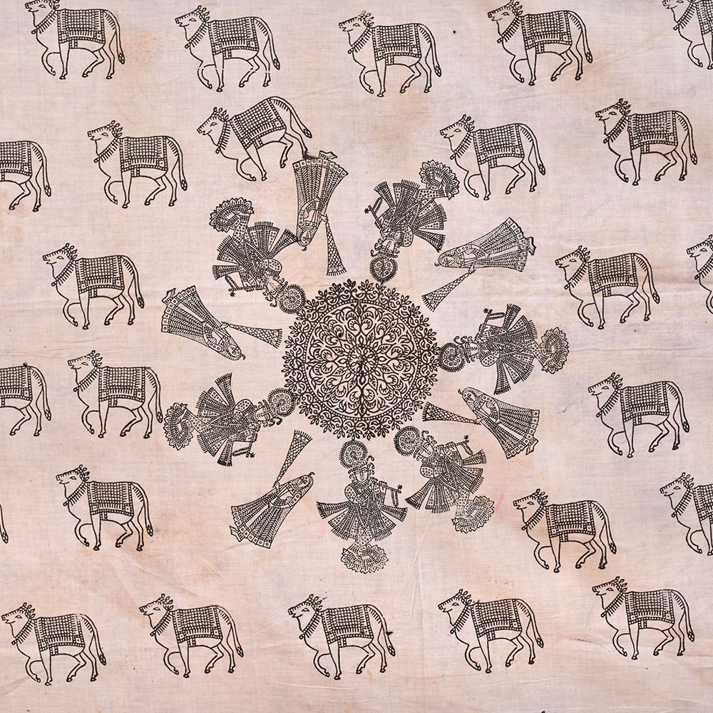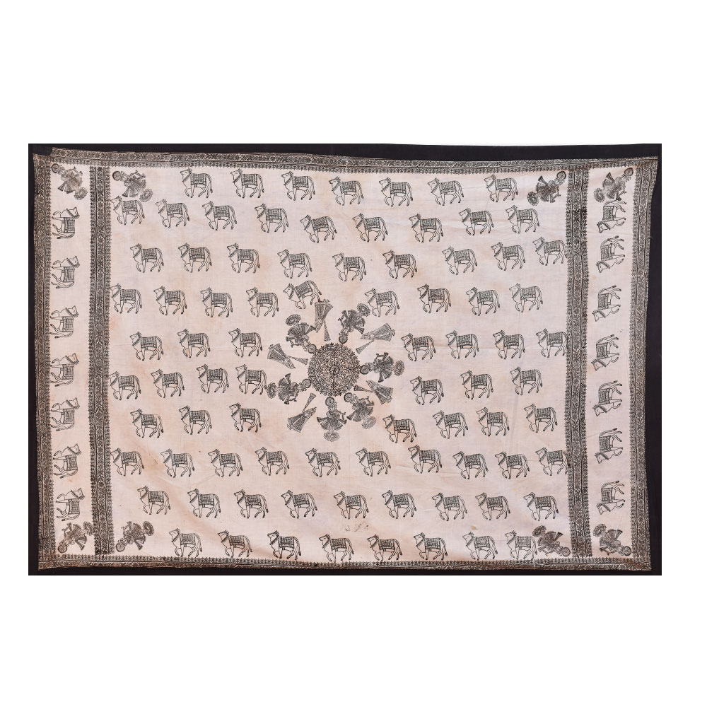 The Pichwai painting on fabric cloth is a masterpiece of Indian art that captures the essence of traditional Indian culture. This painting depicts a beautiful pattern in the centre, surrounded by male and female figures playing musical instruments. The intricate details and vibrant colours used by the professional Indian artists make this painting an exquisite piece of art. One of the most striking features of this Pichwai painting is the depiction of cows throughout the whole cloth. Cows are considered sacred in Indian culture and are believed to bring good fortune and prosperity. This painting is perfect for adorning your prayer room or temple as it represents the divine and invokes a feeling of spirituality. It can also be hung in the living room as a decorative piece to add a touch of Indian heritage to your home. This Pichwai painting on fabric cloth is an ideal gift for your family, friends, or relatives on special or festive occasions. The intricate details and multi-colours of this painting make it a timeless piece of art that will be treasured for years to come.