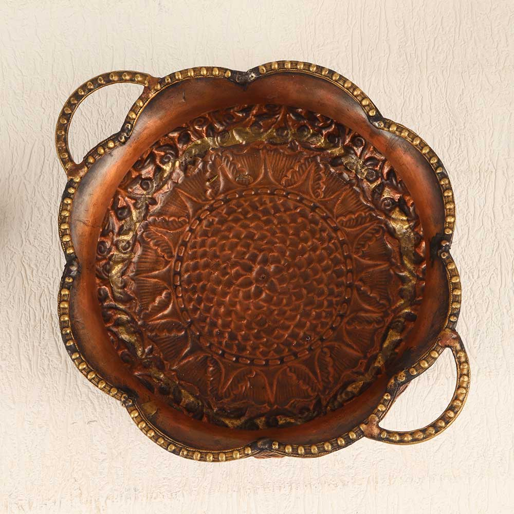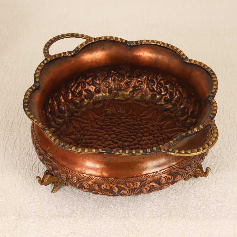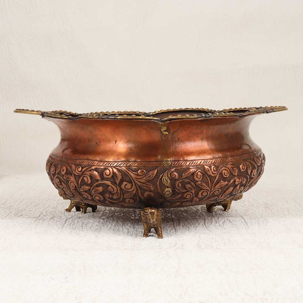 This Vintage Copper Brass Round Urli Pot is a timeless piece of artistry that seamlessly combines craftsmanship and elegance. Handmade by highly talented artisans, this urli pot boasts intricate engravings that tell a story of tradition and cultural richness. The round shape, coupled with four stands in the form of majestic elephants, adds a touch of regality to its design. Crafted from high-quality copper brass, the urli pot features a warm antique brown finish, providing it with a distinctive vintage charm. The attention to detail is evident in every curve and pattern, making it a captivating addition to any space. Its versatile nature allows it to grace the interiors of homes, offices, restaurants, hotels, or cafes with equal grace, becoming a focal point of admiration. This urli pot not only serves as a unique decorative piece but also holds sentimental value as it can be added to your vintage collection. Furthermore, it makes for an extraordinary gift, elevating the spirit of special, festive, or auspicious occasions.