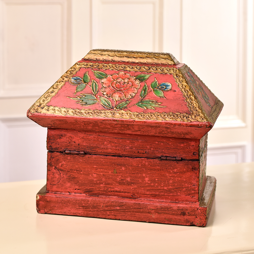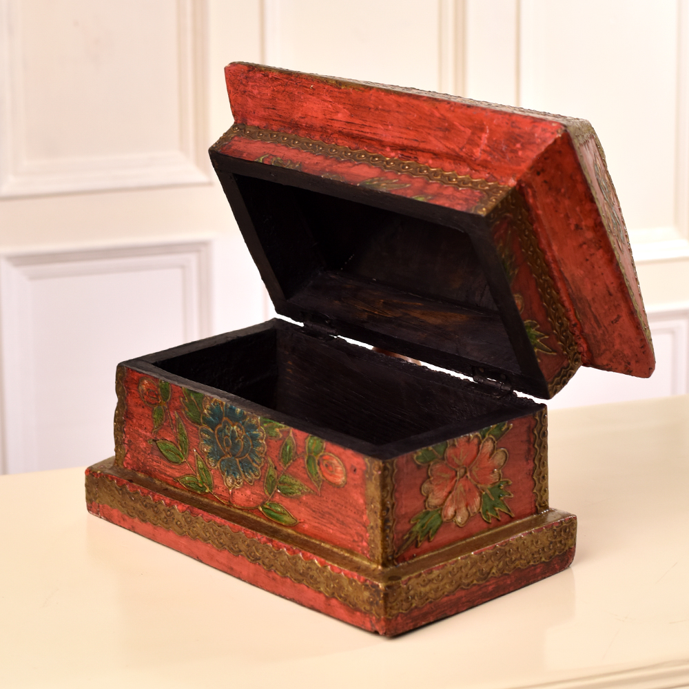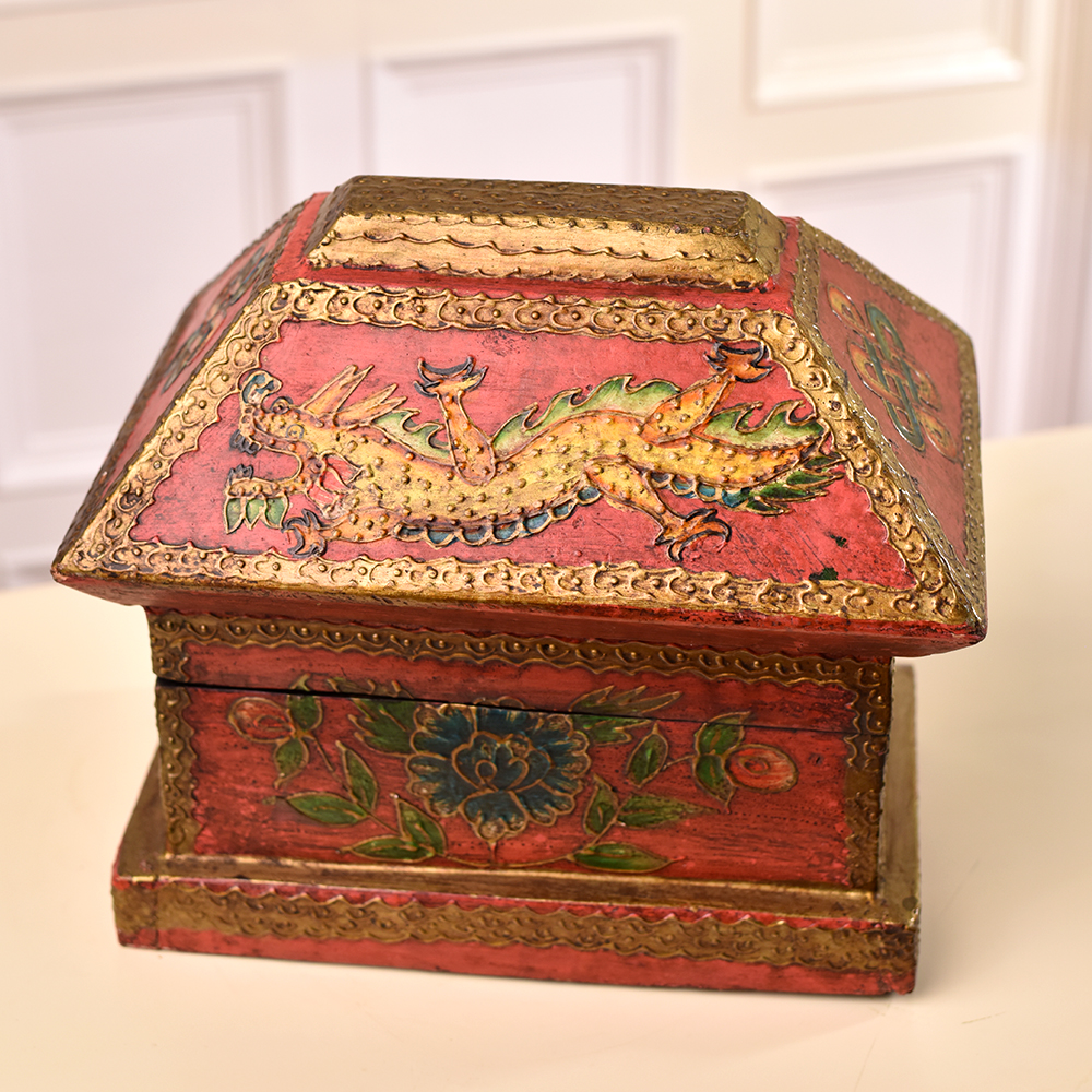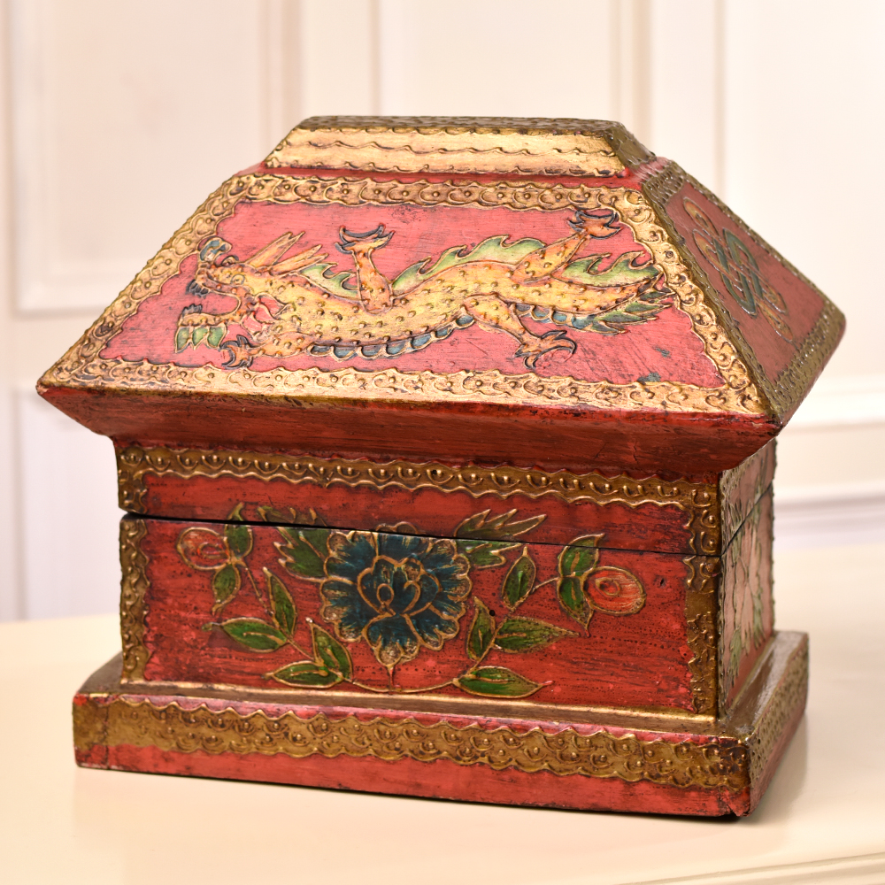 Unveil the mystique of our crafted wooden box adorned with captivating dragon and floral engravings. Handcrafted by highly skilled Indian artisans, this masterpiece is a testament to their expertise and dedication. Fashioned from high-quality wood, the box is a canvas of vibrant hues, a celebration of traditional artistry. Equipped with a secure latch, this multifunctional box is perfect for safeguarding your precious jewelry or cherished small items. Its versatility extends beyond utility - it's a piece of art that begs to be displayed. Imagine it gracing the center stage at an exhibition, commanding attention with its intricate designs and rich colours. Beyond personal use, this box makes for an enchanting gift, a token of love on special or festive occasions. Each stroke, each colour, and every curve tell a story of culture, skill, and the timeless beauty of handmade craftsmanship.