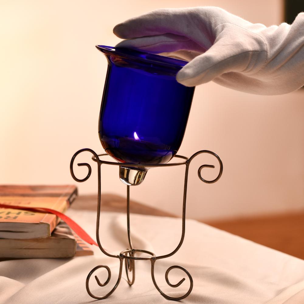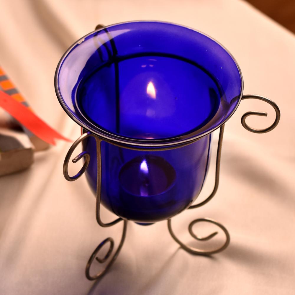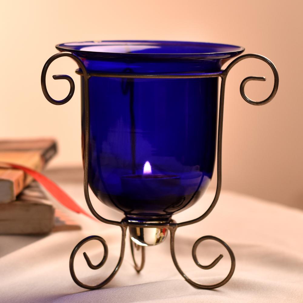 Buy a handmade glass tea light holder in a captivating blue shade that is expertly crafted by highly talented Indian artisans using premium quality glass. This decorative candle holder features transparent glass that radiates a soothing glow when the tea light is illuminated. The elegant black stand adds a touch of modern sophistication, creating a striking contrast that enhances any space. Designed for versatility, this beautiful candle holder seamlessly complements various settings, making it a perfect addition to your home, office, restaurant, hotel, or cafe. Elevate your dining experience with its enchanting ambiance, setting the stage for memorable moments on special occasions. The intricate craftsmanship and attention to detail make this piece a unique and stylish choice for enhancing interiors. Gift your family, friends or relatives a touch of elegance with this modern candle holder, an ideal present for special, festive, or auspicious occasions. Whether adorning your space or shared as a thoughtful gift, this glass tea light holder is a symbol of craftsmanship, beauty, and the warmth of shared moments.
