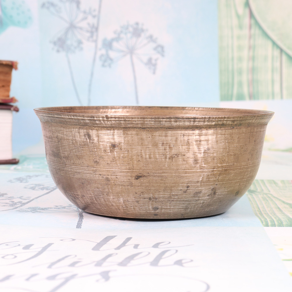In the serene monasteries of Nepal, Himalayan singing bowls have long been revered as tools for spiritual enlightenment and inner peace. This vintage bell metal bowl, crafted in the traditional Nepalese style, allows you to bring the transformative power of this ancient practice into your own home. Unlike mass-produced metal bowls, this piece is made entirely by hand using time-honored techniques passed down through generations of skilled artisans. The plain brown finish lends it a rustic, earthy elegance that complements any décor. But the real magic lies in its rich, resonant tone, which can be easily activated with the included wooden striker. As the soothing vibrations fill the air, you'll feel your mind quieting, your breath deepening, and your body entering a blissful state of relaxation. Whether you're an experienced meditator or simply seeking a moment of peace in your day, this singing bowl is a gateway to profound inner harmony. Elevate your meditation practice and unlock the secrets of the Himalayas with this timeless Nepalese treasure.