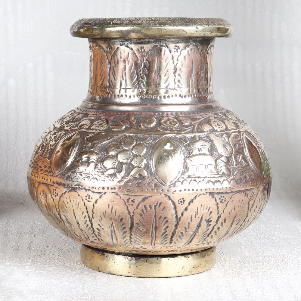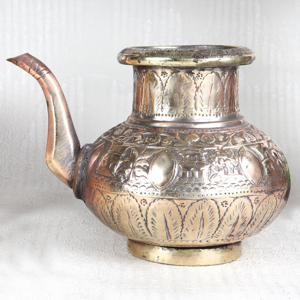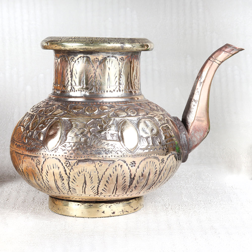 A Vintage Copper Water Pot with Spout which is a true masterpiece that encapsulates the rich heritage of Islamic Art from Hyderabad. Handcrafted with precision by highly skilled Indian craftsmen, this timeless piece is a testament to their craftsmanship. Crafted from high-quality copper, this pot boasts an antique brown finish that adds a touch of elegance to any setting. What sets it apart are the intricate engravings, showcasing beautiful designs inspired by Islamic motifs, making it a work of art in itself. Versatile in its use, this water pot can grace your home, office, restaurant, hotel, or cafe's prayer room, elevating the ambiance with its aesthetic charm. It's equally fitting for temple rituals, adding a touch of tradition to your spiritual practices. For vintage collectors, it's a rare find that's bound to be a cherished addition to your collection. Display it proudly at exhibitions or use it as a unique gift to delight your family, friends or relatives on special, festive, or auspicious occasions.