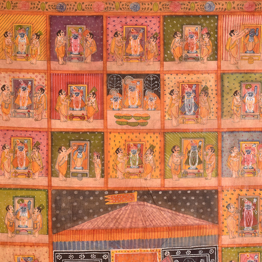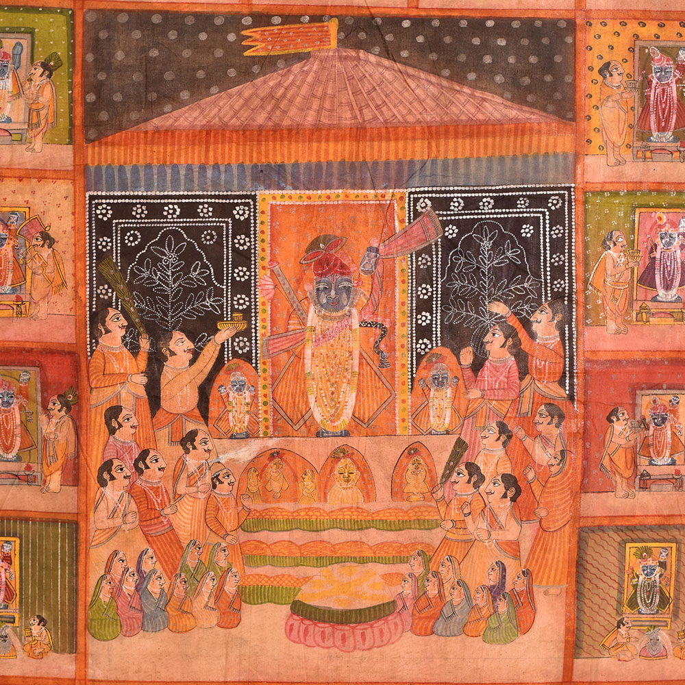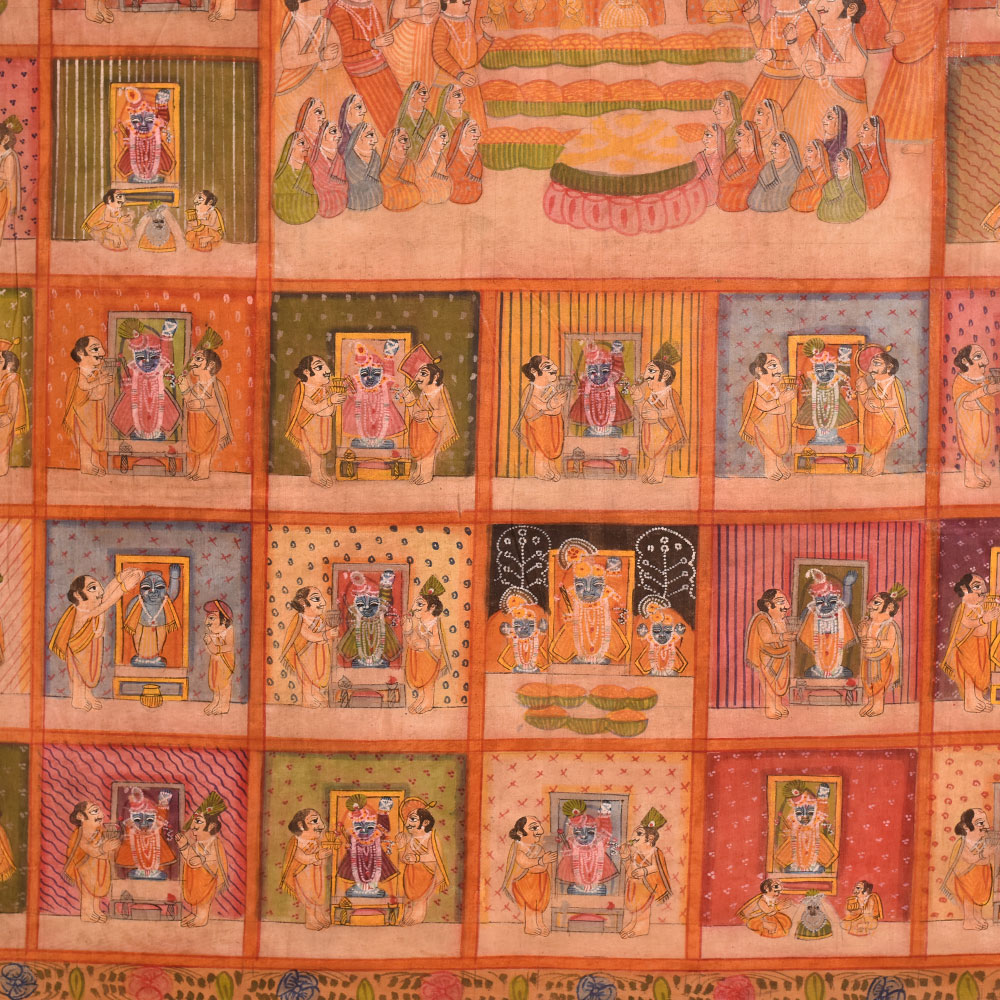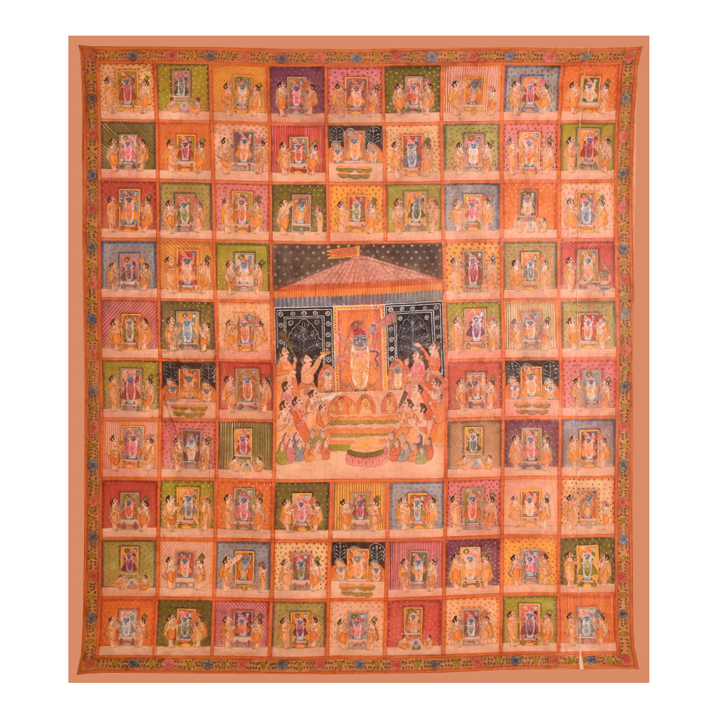 A pichwai painting is a vibrant, highly detailed artwork that has its roots in Indian culture and Hindu mythology. Typically painted on cloth, this particular pichwai painting features a magnificent temple at the center with devotees offering prayers and performing various rituals. Surrounding the temple are 78 different scenes depicting Hindu deity with devotees offering their prayers. The painting is created by professional Indian artists, who are renowned for their intricate and skillful artwork. The multi-coloured painting is richly detailed, featuring intricate patterns and designs that bring the painting to life. This pichwai painting is perfect for displaying in a prayer room or at a temple, where it can inspire devotion and provide a focal point for meditation and worship. It is also an excellent gift choice for special, festive, or auspicious occasions, allowing you to share the beauty and symbolism of Hindu mythology with your loved ones. Whether displayed in a private home or a public space, this pichwai painting is a stunning work of art that celebrates the rich cultural heritage of India.