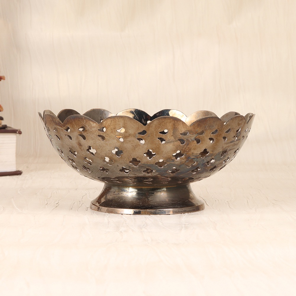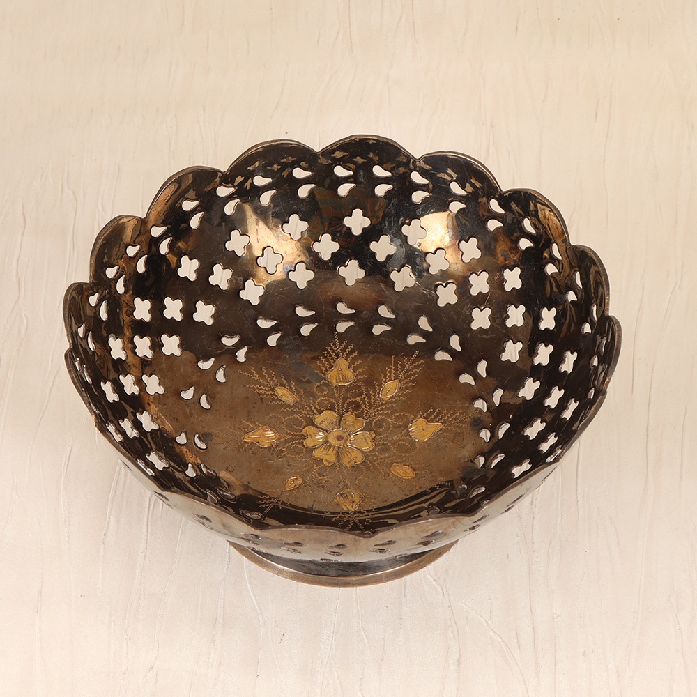 This exquisite vintage brass fruit bowl is a true work of art, infusing any space with a sense of refined sophistication. Masterfully crafted from solid brass, it features intricate jali work - a traditional Indian metalworking technique that creates a stunning perforated pattern. Complementing the jali detailing are delicate engraved flourishes that add depth and visual interest to the bowl's surface. Beyond its captivating aesthetic, this fruit bowl is also highly functional. The generous size allows you to beautifully display an abundance of fresh fruits, vegetables, or even decorative items. Its durable construction ensures it will maintain its gleaming beauty through years of daily use. Whether placed on your kitchen counter, dining table, or entryway console, this brass bowl will instantly elevate the look and feel of any space. If you're seeking a timeless piece that seamlessly blends form and function, this vintage brass fruit bowl is the perfect choice. It makes a striking statement on its own, while also serving as a practical and elegant solution for showcasing your seasonal produce. Treat yourself or gift it to a loved one who appreciates exceptional craftsmanship and enduring style.