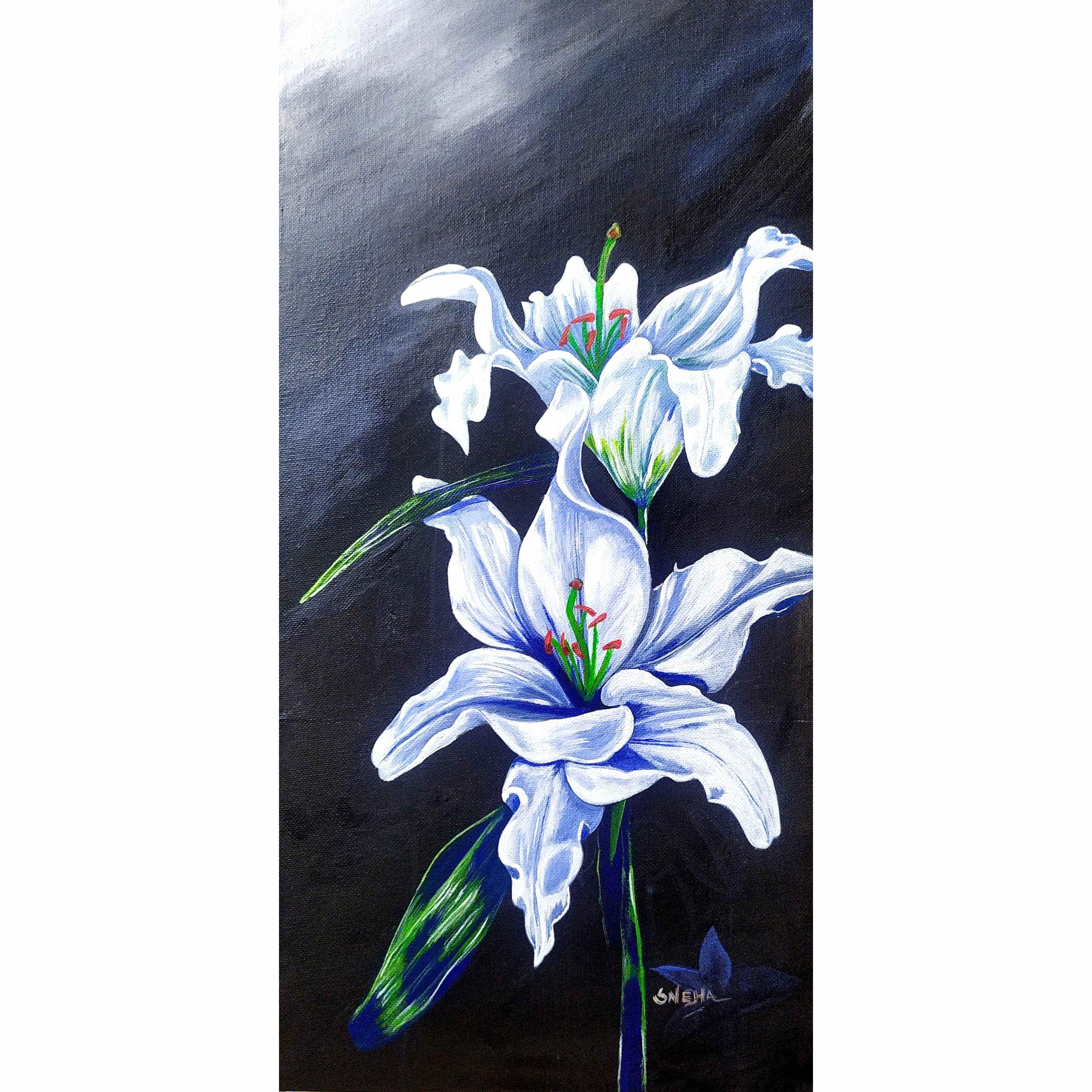 Striking black and white, the resurrection lilies unfold with sculptural precision—every petal a study in light and shadow. Their soft curves emerge from the grayscale with haunting grace, embodying purity without the need for color. This painting speaks of timeless renewal, where contrast becomes the language of hope and rebirth.