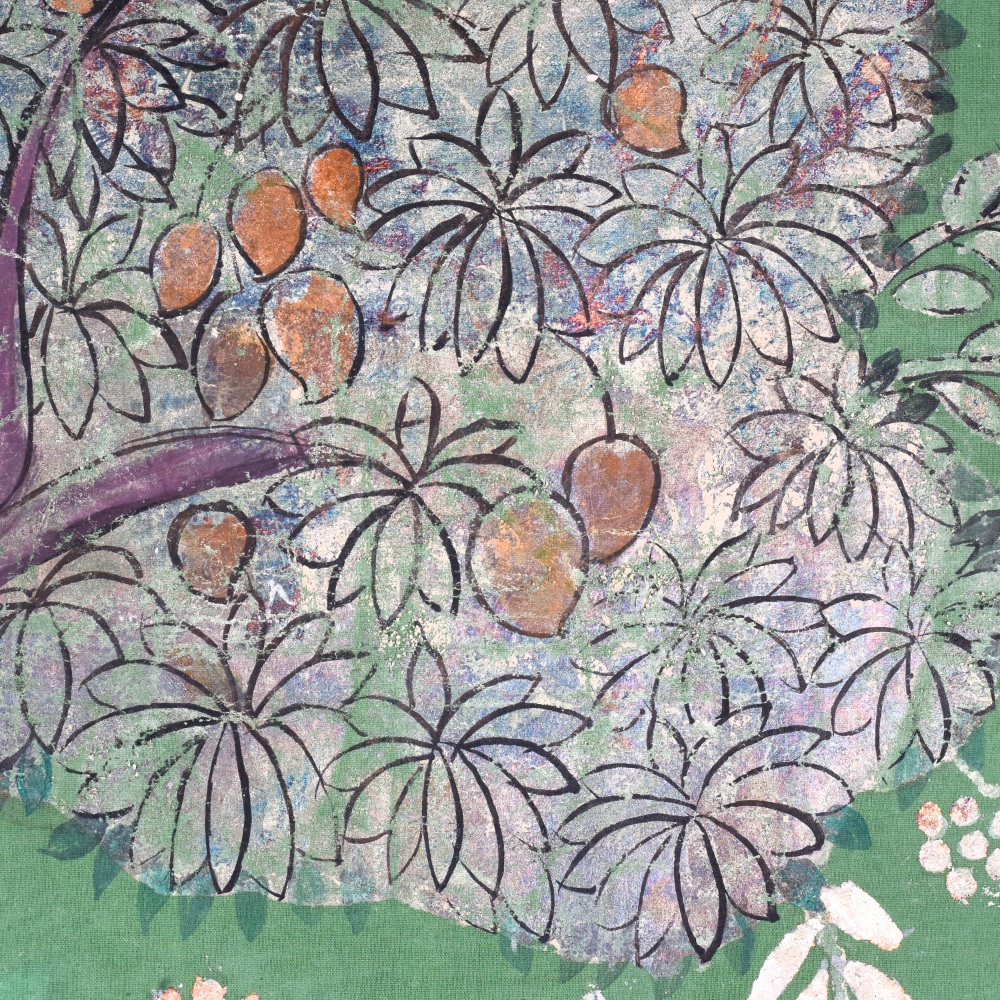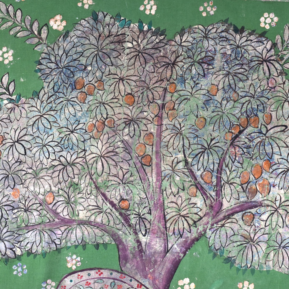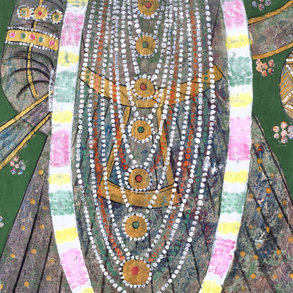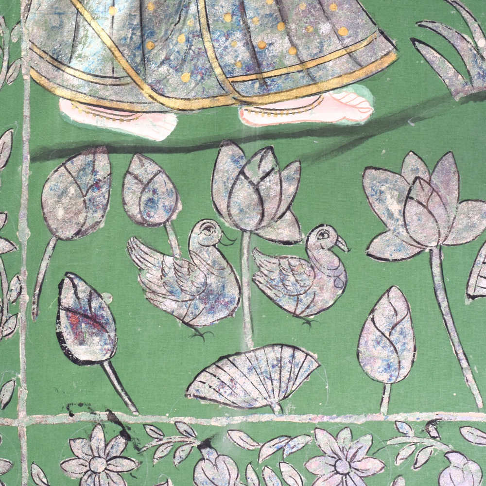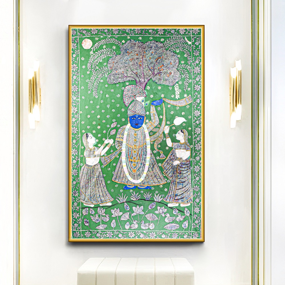 This breathtaking cloth pichwai painting transports you to the enchanting world of Lord Krishna without frame, the beloved deity celebrated for his divine love and playful spirit. Rendered in vivid hues and exquisite detail, the central scene depicts Krishna standing gracefully with two gopis, his beloved cowherd companions, as they sway to the rhythm of his enchanting flute. Framing this sacred tableau is an ornate floral border, a testament to the skill and artistry of the master craftsmen who created this piece. More than just a work of art, this pichwai painting is imbued with deep spiritual significance. As a symbol of Krishna's eternal love and the devotion of his followers, it serves as a focal point for meditation and worship, inviting you to connect with the divine and find solace in the timeless beauty of Hindu spirituality. Whether displayed in your home, office, or place of worship, this exquisite painting is sure to captivate all who behold it, serving as a constant reminder of the transcendent power of faith and devotion.