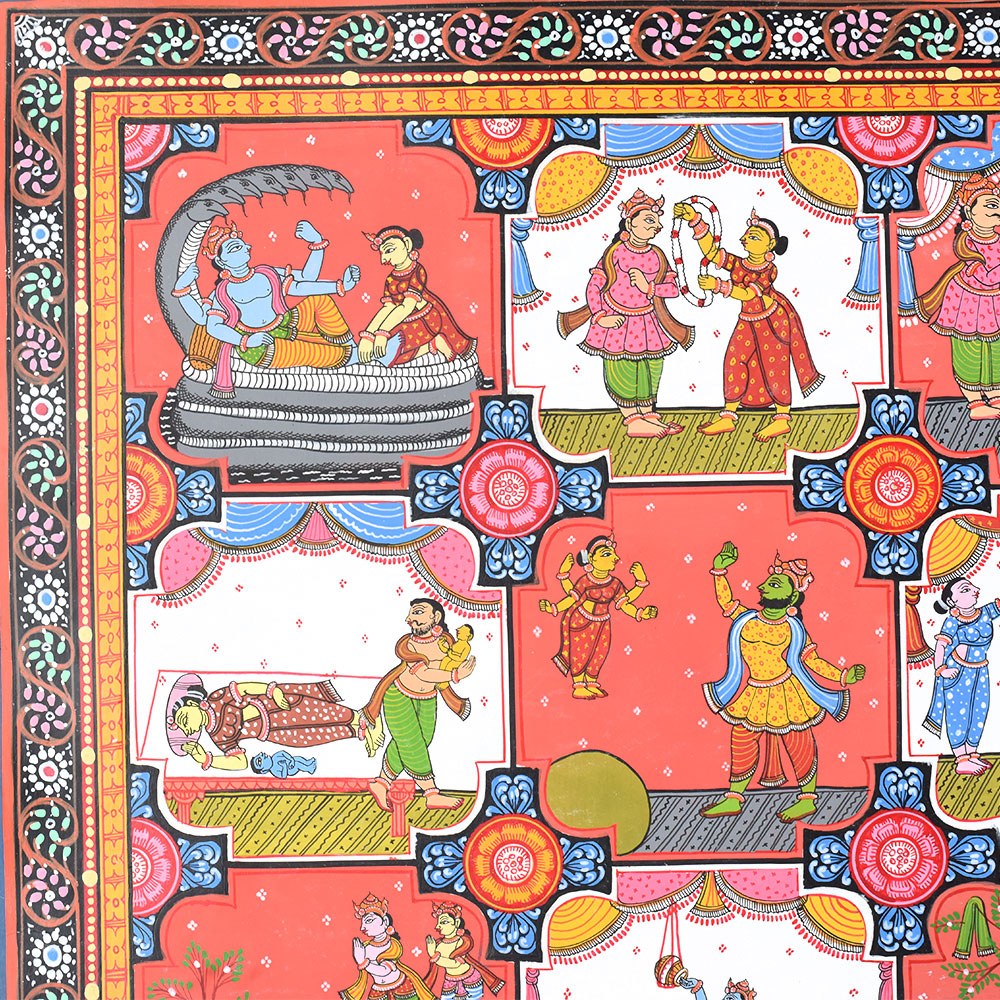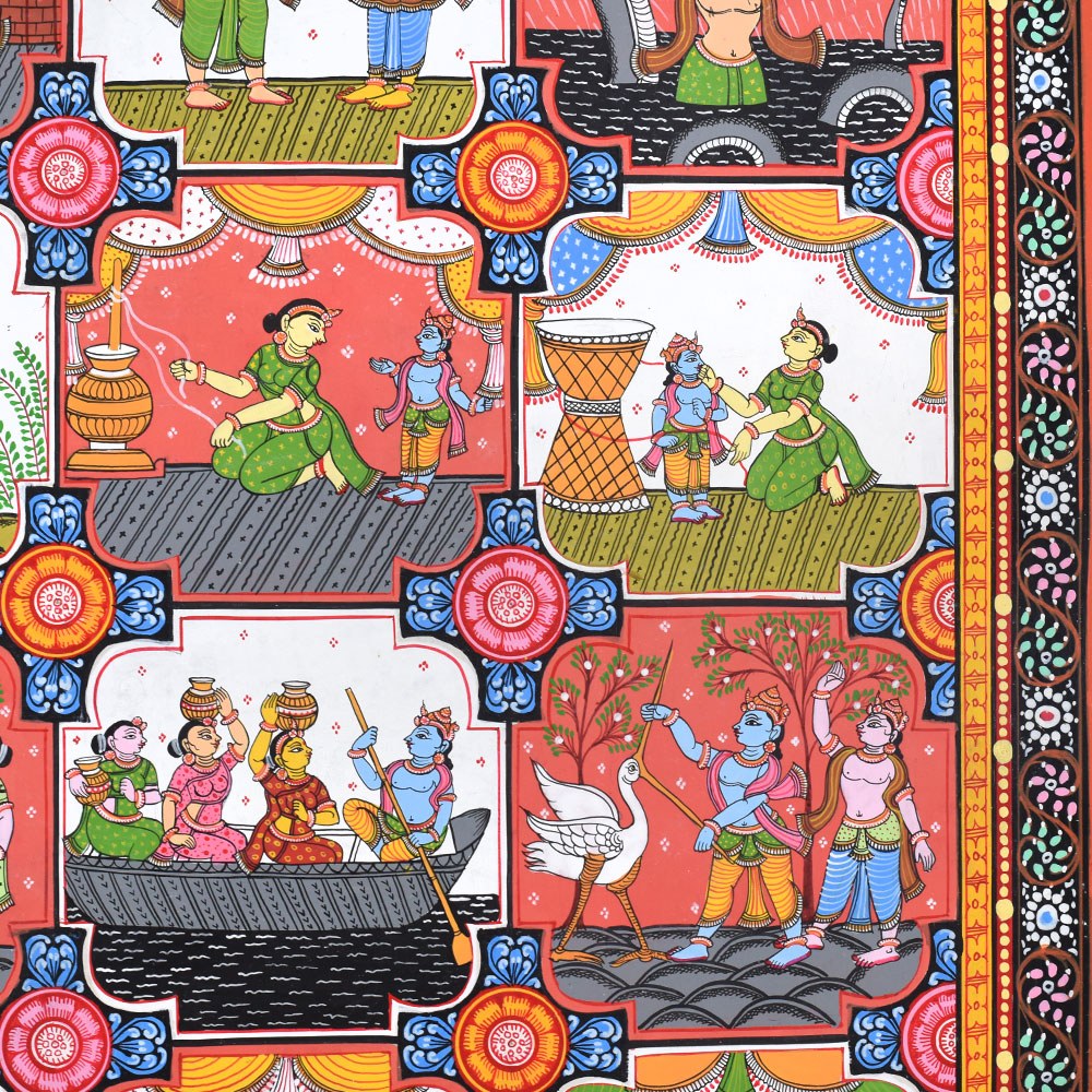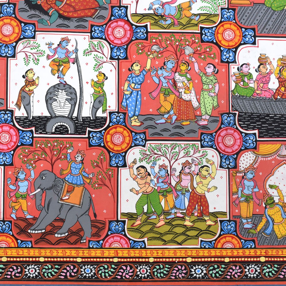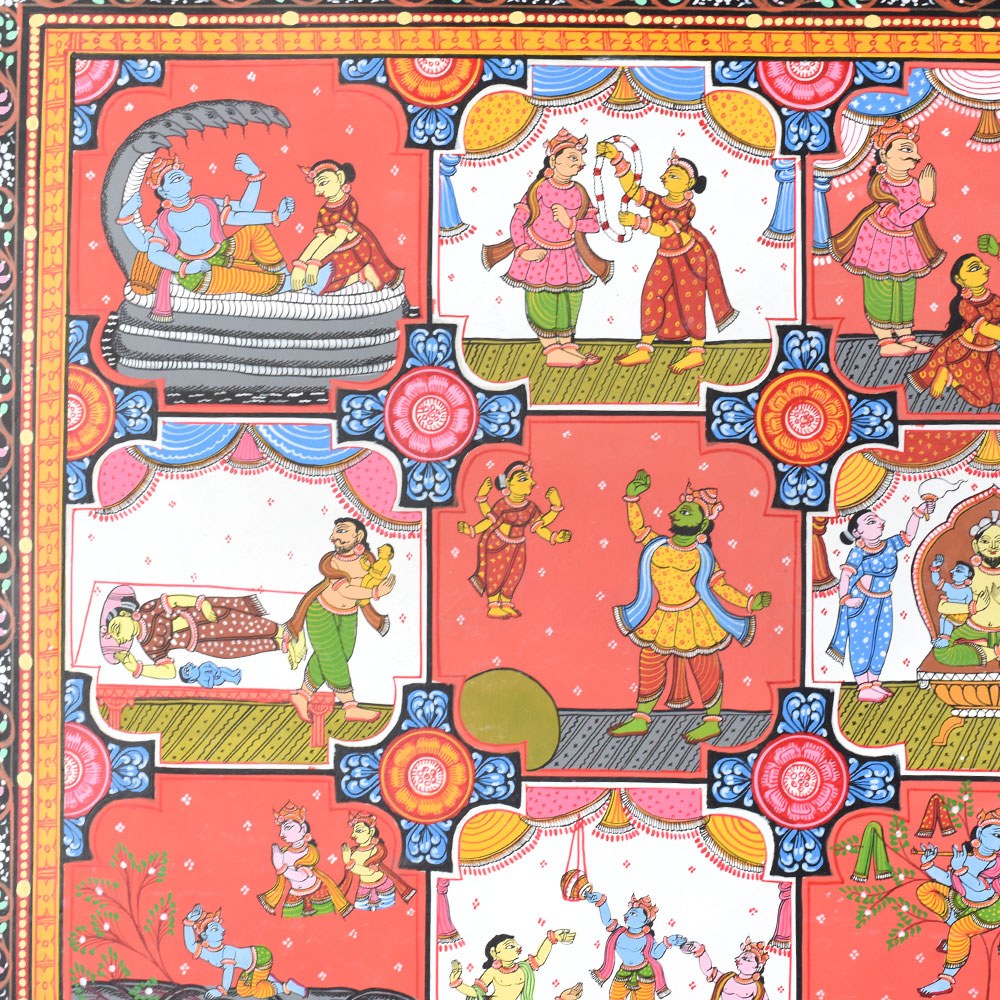 This Pattachitra painting vividly depicts various episodes from the life of Lord Krishna, illustrating his childhood and divine actions, presented in a series of colorful panels. Pattachitra, a traditional Indian art form originating from Odisha, is known for its intricate detailing, and this painting is no exception. The entire composition is framed with vibrant, rich colors, with Krishna's divine plays (Leela) showcased across multiple scenes. In the painting, Krishna's early life is highlighted in several panels, including his mischievous acts as a child. For instance, his playful stealing of butter from the homes of the gopis (milkmaids) is a recurring theme, emphasizing his love for simplicity and joy. The vivid colors used, such as the bright reds, yellows, and greens, enhance the energetic nature of Krishna's leelas. These colors symbolize purity, life, and the divine essence of Krishna's character. This event signifies Krishna's divine intervention to save his devotees from disaster. The artist uses bold lines and dramatic contrasts to portray the massive hill being held aloft, while the villagers take refuge under it, symbolizing Krishna's role as a protector and savior. Further panels capture other aspects of Krishna's life, such as his interactions with animals, particularly the cows, and his flute-playing. These elements represent Krishna’s deep connection to nature and his nurturing spirit. The presence of peacocks, cows, and trees in the artwork creates a sense of harmony with the environment, which is a significant theme in Krishna's teachings. The lower panels depict Krishna's relationships with his devotees, particularly his bond with Radha. Their love is a central motif in many of Krishna's stories, representing divine love and devotion. The gopis' adoration and Krishna's transcendental love for them are reflected in the painting's narrative and artistic style. The intricate details and the vivid storytelling make this Pattachitra painting a timeless and beautiful representation of Lord Krishna's life, highlighting his divine qualities of love, mischief, wisdom, and protection. Each panel serves as a reminder of Krishna's teachings, offering spiritual insight and aesthetic pleasure through traditional art.