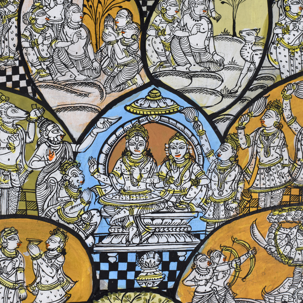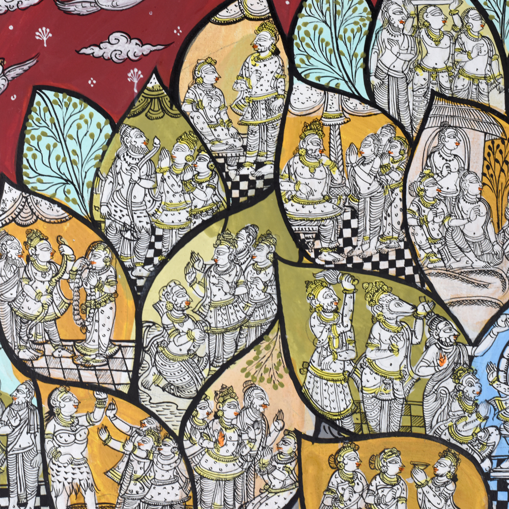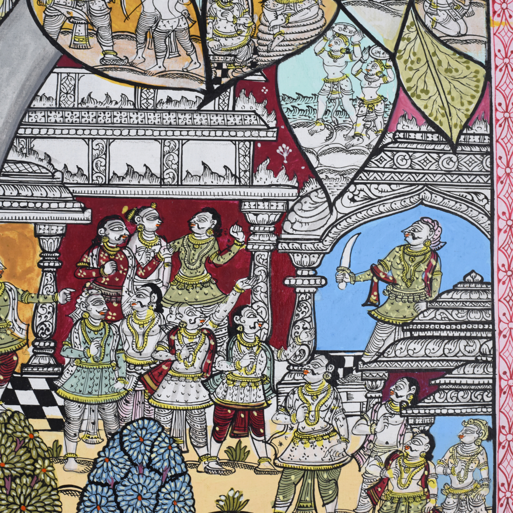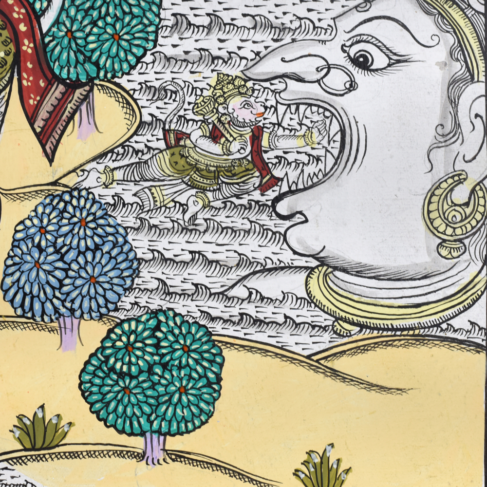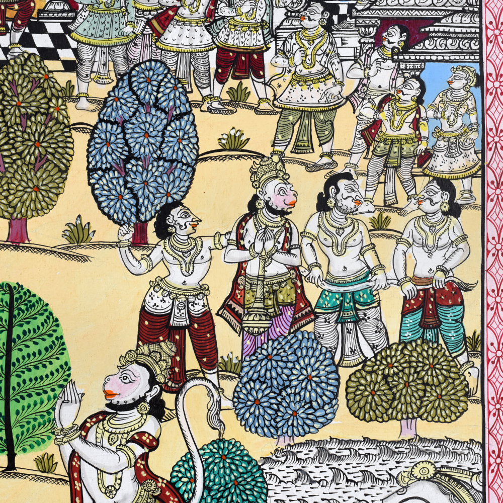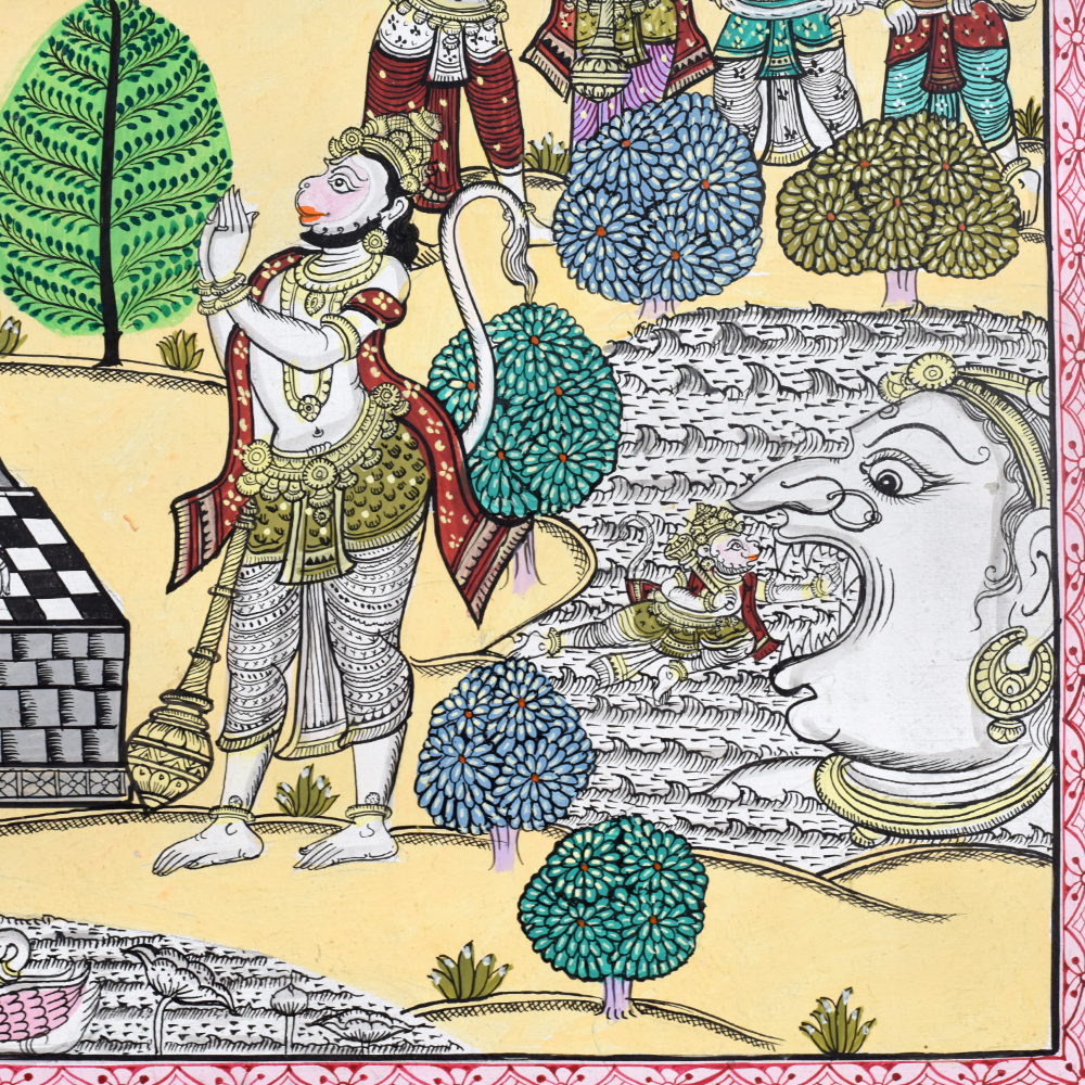 This stunning cloth paper Pattachitra painting beautifully depicts the Sundar Kand from the Ramcharitmanas, an important section of the epic Ramayana, written by the revered poet Tulsidas. The artwork masterfully incorporates intricate details and vibrant colors, characteristic of the traditional Pattachitra style, capturing a series of significant events from the Ramayana with a unique artistic approach. The painting centers around a tree whose leaves each contain a different scene from the epic, intertwining both natural elements and the divine narrative. At the heart of the painting, a large, central tree rises, its trunk sturdy and strong, while its expansive leaves unfold into detailed depictions of the Sundar Kand. The tree's roots are metaphorical, symbolizing the deep spiritual connection between nature and the divine. The leaves themselves represent individual moments from the Ramcharitmanas, each one encapsulating a powerful scene from the story of Lord Rama’s journey to rescue his wife, Sita, from the demon king Ravana. The uppermost leaves feature scenes from Hanuman’s heroic journey. The image of Hanuman leaping across the ocean, a feat of divine might, is a central symbol of devotion and bravery. As the painting progresses down, other leaves showcase Hanuman’s interaction with Sita, as he reassures her of Rama’s imminent arrival, carrying Rama’s ring to her as a token of hope. Further along the tree’s leaves, we see moments from the battle between Rama’s forces and Ravana’s army, symbolizing the triumph of good over evil. Each scene reflects the unity of the divine forces and the courage of the characters involved. The lower leaves of the tree depict the celebration of Rama’s victory, as the forces of righteousness emerge victorious, culminating in the joyous reunion of Rama and Sita. The entire painting is bordered by decorative motifs that represent the grandeur and spiritual essence of the narrative. The natural landscape, from the trees to the rivers and mountains, serves as a backdrop to the divine interactions that unfold, creating a harmonious blend of the human and divine realms. This Pattachitra painting, with its intricate leaf design and powerful imagery, not only represents the Sundar Kand in a visually engaging way but also serves as a spiritual homage to the tale of devotion, courage, and righteousness depicted in the Ramcharitmanas. It is a beautiful representation of Lord Rama’s divine journey, illustrating his triumph over adversity and his unwavering commitment to dharma (righteousness).
