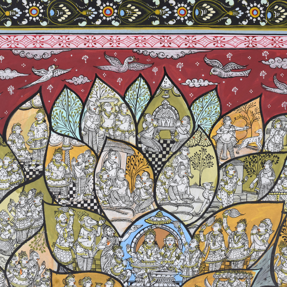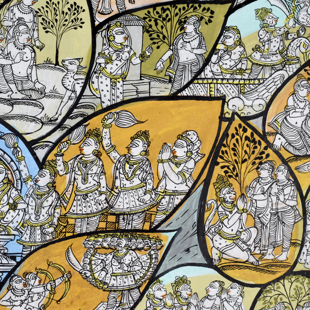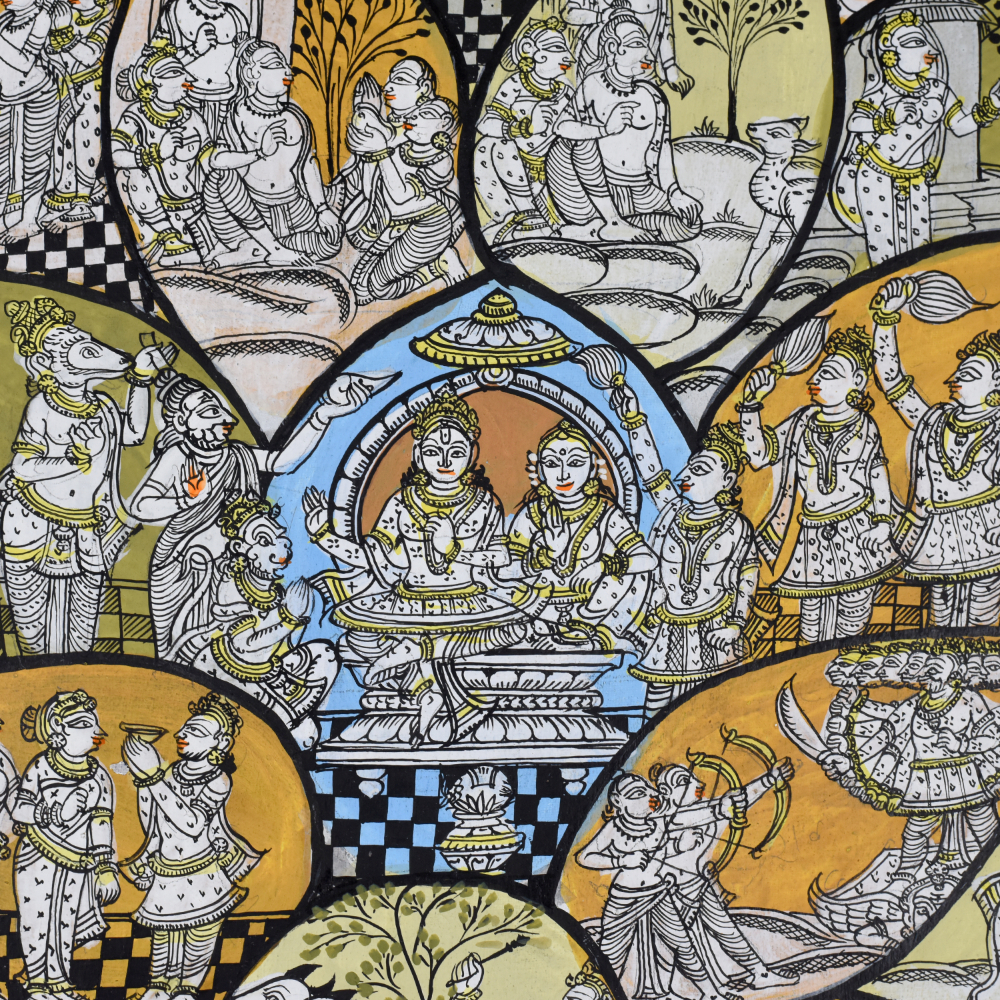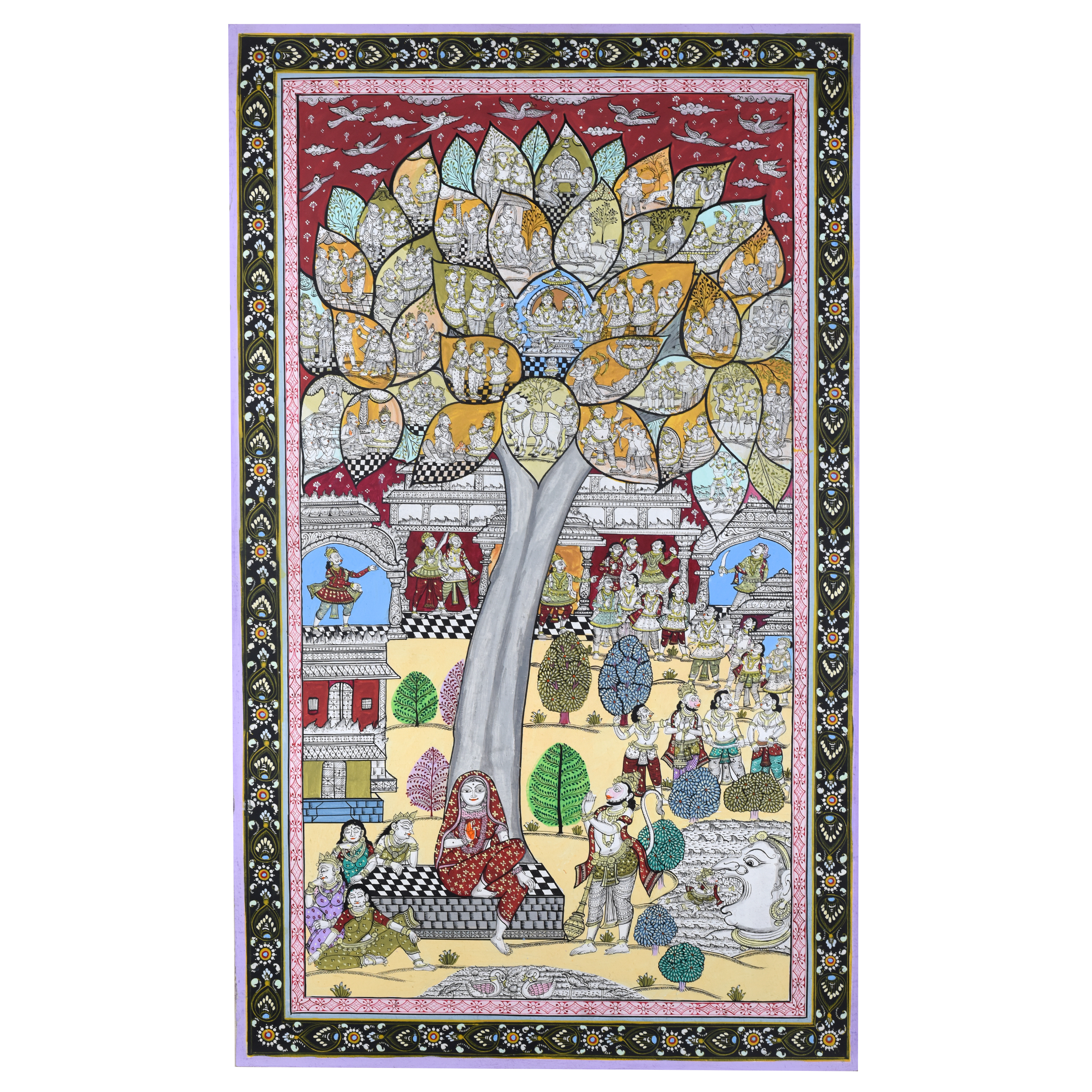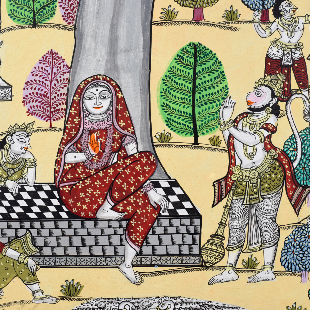 This stunning cloth paper Pattachitra painting beautifully depicts the Sundar Kand from the Ramcharitmanas, an important section of the epic Ramayana, written by the revered poet Tulsidas. The artwork masterfully incorporates intricate details and vibrant colors, characteristic of the traditional Pattachitra style, capturing a series of significant events from the Ramayana with a unique artistic approach. The painting centers around a tree whose leaves each contain a different scene from the epic, intertwining both natural elements and the divine narrative. At the heart of the painting, a large, central tree rises, its trunk sturdy and strong, while its expansive leaves unfold into detailed depictions of the Sundar Kand. The tree's roots are metaphorical, symbolizing the deep spiritual connection between nature and the divine. The leaves themselves represent individual moments from the Ramcharitmanas, each one encapsulating a powerful scene from the story of Lord Rama’s journey to rescue his wife, Sita, from the demon king Ravana. The uppermost leaves feature scenes from Hanuman’s heroic journey. The image of Hanuman leaping across the ocean, a feat of divine might, is a central symbol of devotion and bravery. As the painting progresses down, other leaves showcase Hanuman’s interaction with Sita, as he reassures her of Rama’s imminent arrival, carrying Rama’s ring to her as a token of hope. Further along the tree’s leaves, we see moments from the battle between Rama’s forces and Ravana’s army, symbolizing the triumph of good over evil. Each scene reflects the unity of the divine forces and the courage of the characters involved. The lower leaves of the tree depict the celebration of Rama’s victory, as the forces of righteousness emerge victorious, culminating in the joyous reunion of Rama and Sita. The entire painting is bordered by decorative motifs that represent the grandeur and spiritual essence of the narrative. The natural landscape, from the trees to the rivers and mountains, serves as a backdrop to the divine interactions that unfold, creating a harmonious blend of the human and divine realms. This Pattachitra painting, with its intricate leaf design and powerful imagery, not only represents the Sundar Kand in a visually engaging way but also serves as a spiritual homage to the tale of devotion, courage, and righteousness depicted in the Ramcharitmanas. It is a beautiful representation of Lord Rama’s divine journey, illustrating his triumph over adversity and his unwavering commitment to dharma (righteousness).