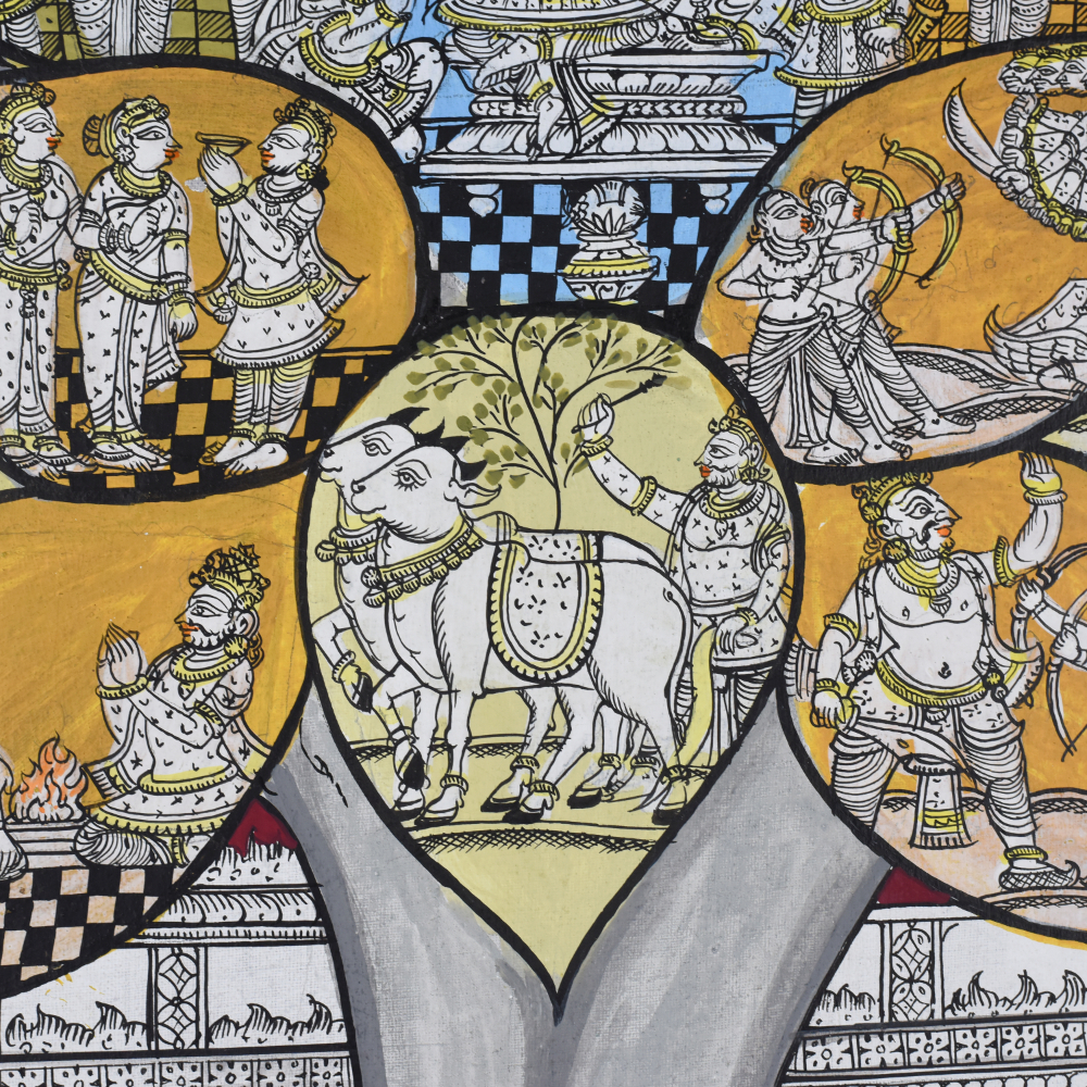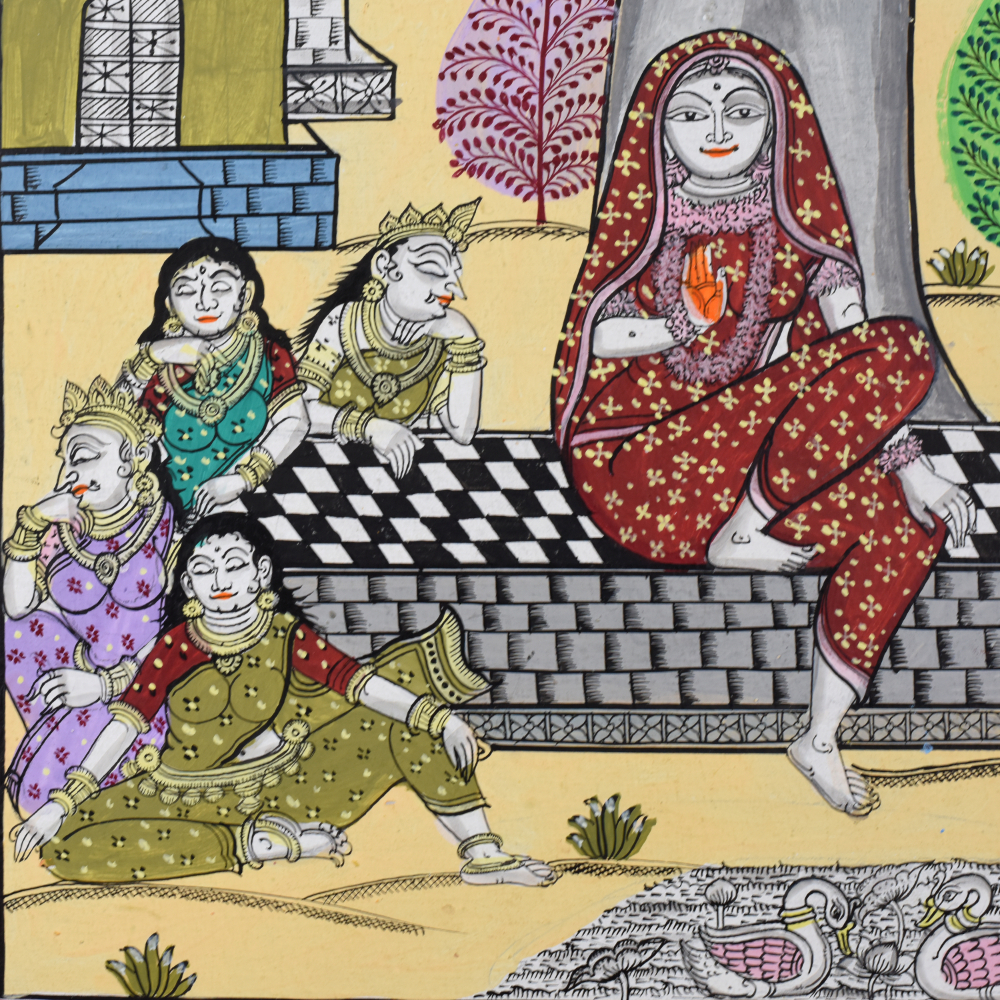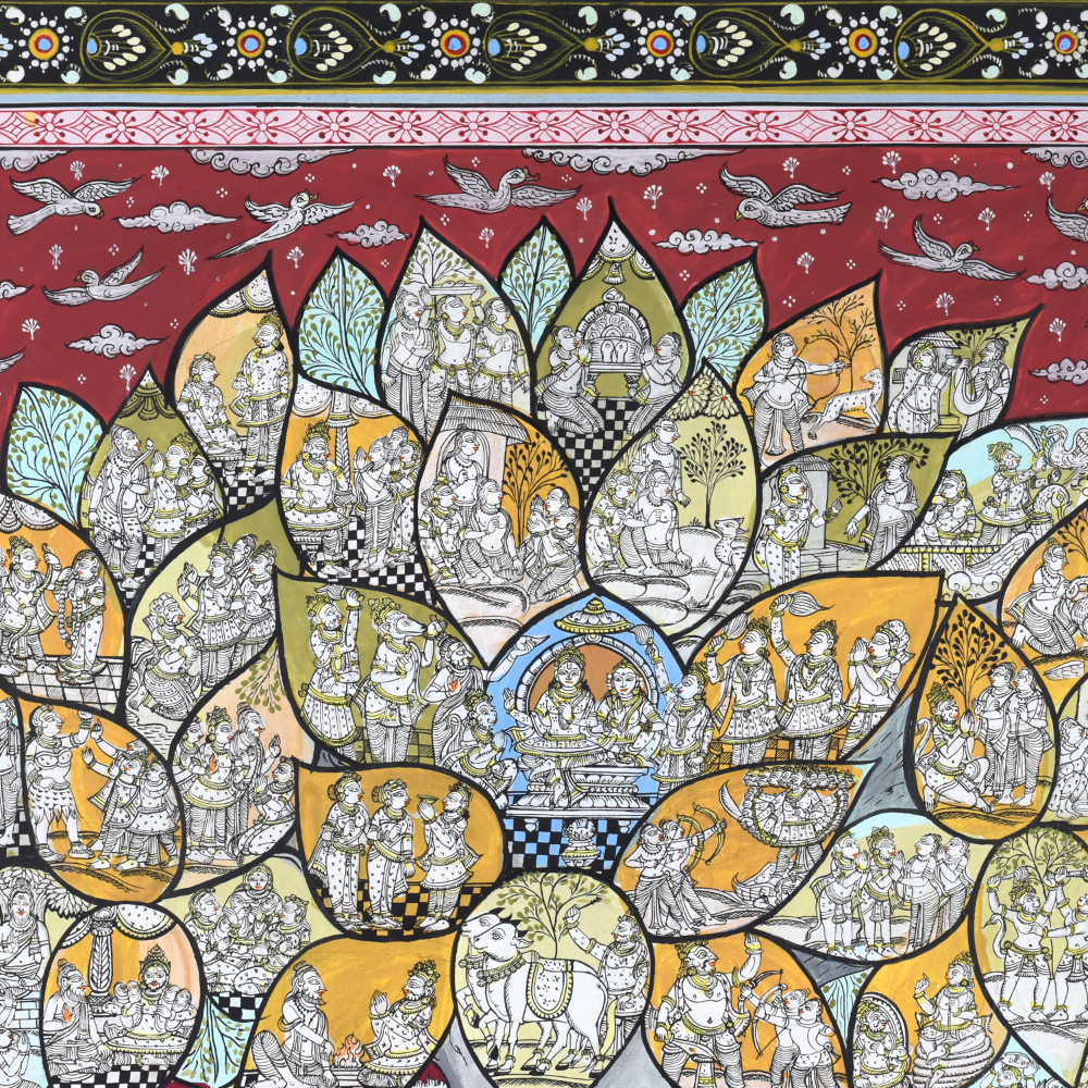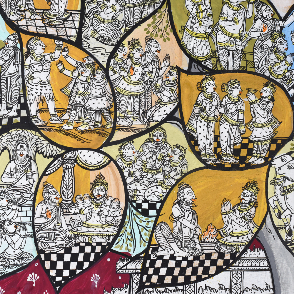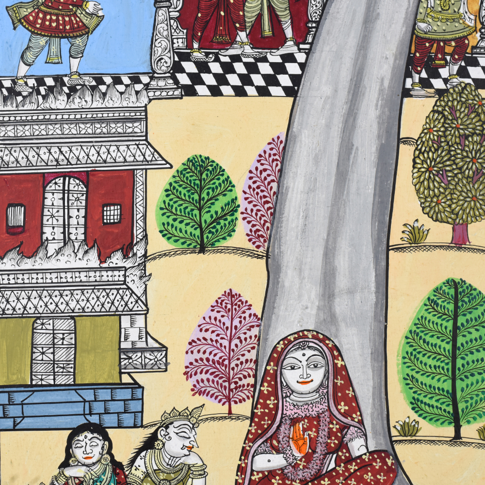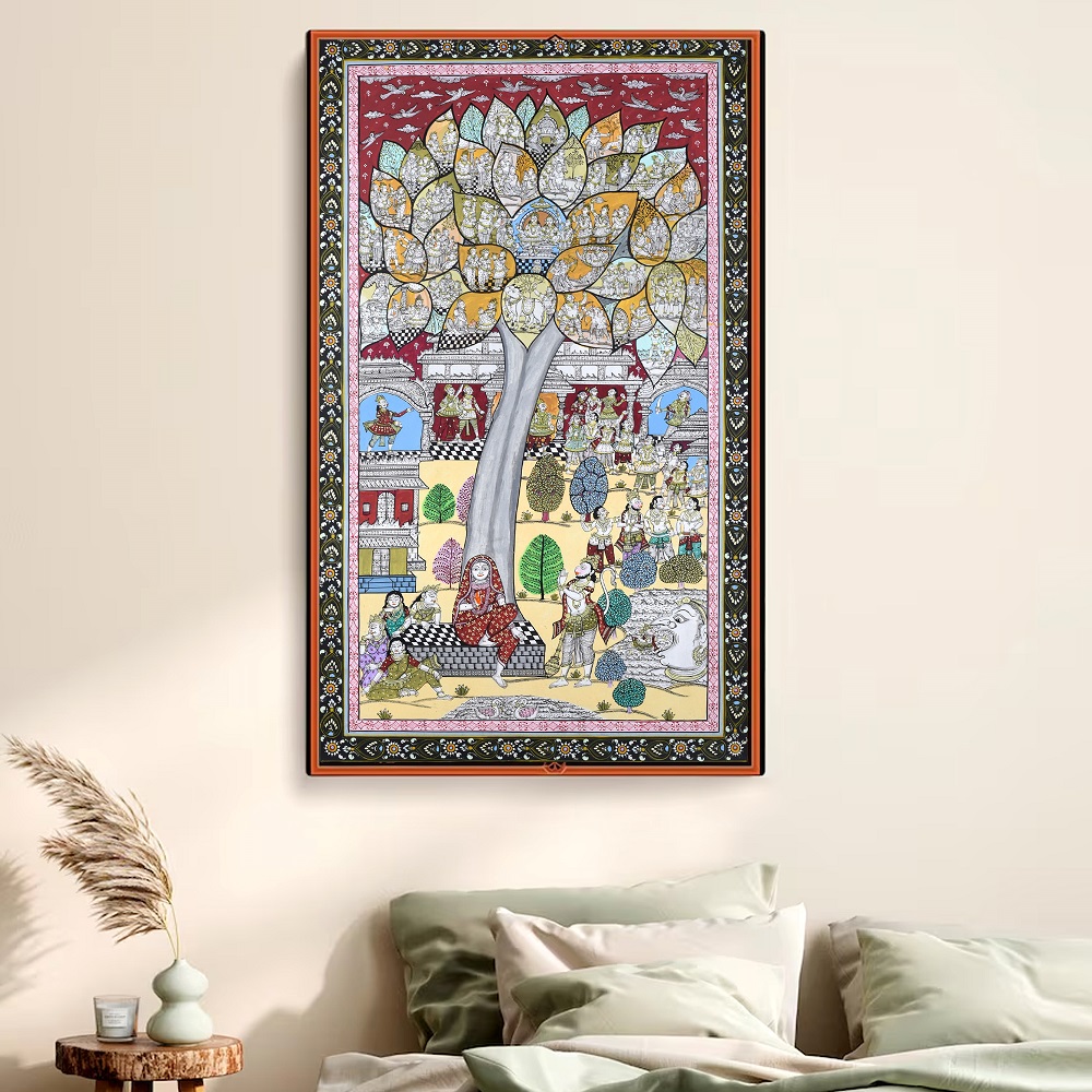 This stunning cloth paper Pattachitra painting beautifully depicts the Sundar Kand from the Ramcharitmanas, an important section of the epic Ramayana, written by the revered poet Tulsidas. The artwork masterfully incorporates intricate details and vibrant colors, characteristic of the traditional Pattachitra style, capturing a series of significant events from the Ramayana with a unique artistic approach. The painting centers around a tree whose leaves each contain a different scene from the epic, intertwining both natural elements and the divine narrative. At the heart of the painting, a large, central tree rises, its trunk sturdy and strong, while its expansive leaves unfold into detailed depictions of the Sundar Kand. The tree's roots are metaphorical, symbolizing the deep spiritual connection between nature and the divine. The leaves themselves represent individual moments from the Ramcharitmanas, each one encapsulating a powerful scene from the story of Lord Rama’s journey to rescue his wife, Sita, from the demon king Ravana. The uppermost leaves feature scenes from Hanuman’s heroic journey. The image of Hanuman leaping across the ocean, a feat of divine might, is a central symbol of devotion and bravery. As the painting progresses down, other leaves showcase Hanuman’s interaction with Sita, as he reassures her of Rama’s imminent arrival, carrying Rama’s ring to her as a token of hope. Further along the tree’s leaves, we see moments from the battle between Rama’s forces and Ravana’s army, symbolizing the triumph of good over evil. Each scene reflects the unity of the divine forces and the courage of the characters involved. The lower leaves of the tree depict the celebration of Rama’s victory, as the forces of righteousness emerge victorious, culminating in the joyous reunion of Rama and Sita. The entire painting is bordered by decorative motifs that represent the grandeur and spiritual essence of the narrative. The natural landscape, from the trees to the rivers and mountains, serves as a backdrop to the divine interactions that unfold, creating a harmonious blend of the human and divine realms. This Pattachitra painting, with its intricate leaf design and powerful imagery, not only represents the Sundar Kand in a visually engaging way but also serves as a spiritual homage to the tale of devotion, courage, and righteousness depicted in the Ramcharitmanas. It is a beautiful representation of Lord Rama’s divine journey, illustrating his triumph over adversity and his unwavering commitment to dharma (righteousness).