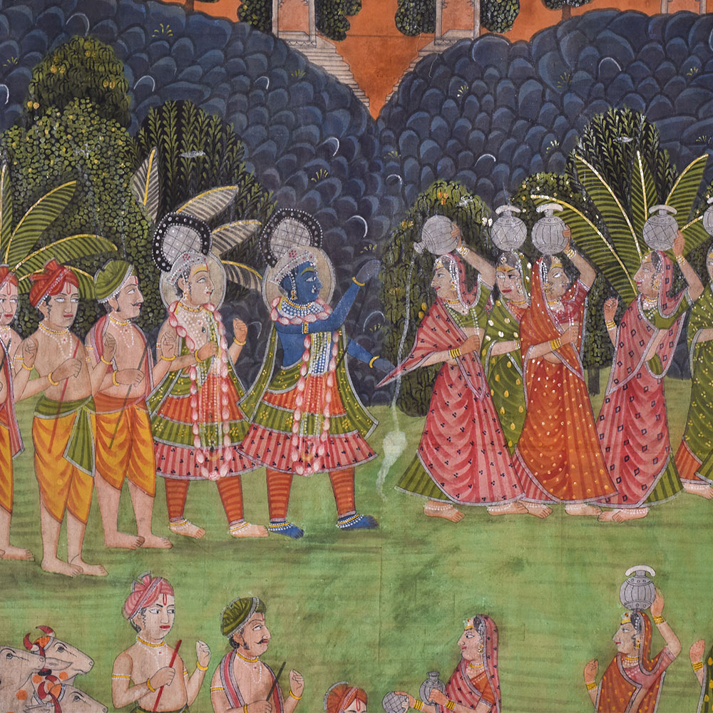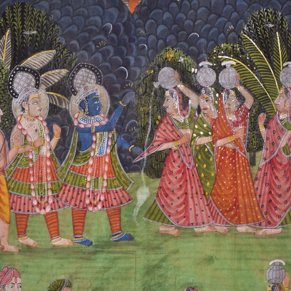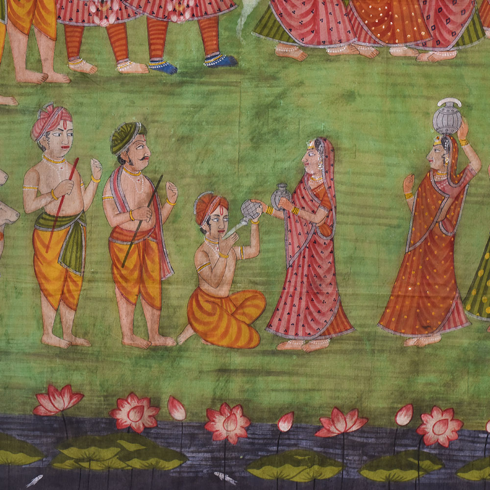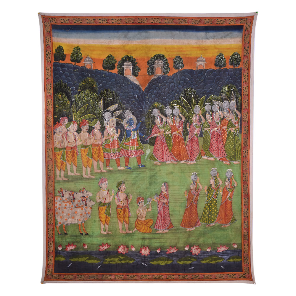 Immerse yourself in the enchanting world of Indian art with this exquisite Pichwai painting, painted by highly skilled and experienced Indian artisans. This vibrant artwork depicts the mischievous Lord Krishna teasing the Gopis, who elegantly balance pots on their heads while chasing after him. The richly detailed composition is adorned with delicate lotus flowers at the bottom, symbolizing purity and divine beauty. With its beautiful floral border and a multitude of vibrant hues, this Pichwai painting is a true masterpiece that captivates the viewer's attention. It is a versatile piece of art that can be proudly displayed in various settings, be it your home, office, art museum, restaurant, hotel, cafe, or exhibition. Its eye-catching allure will undoubtedly become a talking point for your guests, evoking a sense of wonder and admiration. Beyond its aesthetic appeal, this painting holds cultural significance and can be a thoughtful gift for your near and dear ones on special, festive, or auspicious occasions.