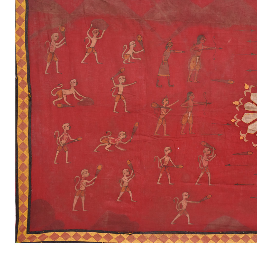 An incredible pichwai painting on fabric cloth that depicts a scene of a fierce war between tribal groups, with a stunning flower design at the center of the composition. The red background of the painting intensifies the drama of the battle, creating a sense of urgency and danger. The painting has been intricately painted by professional Indian artists in a variety of colours, creating a mesmerizing visual spectacle. This pichwai painting is perfect for adorning your prayer room or temple, adding an auspicious touch to your sacred space. It can also be an excellent gift for your family, friends, or relatives during special or festive occasions. Pichwai paintings are a unique and ancient art form that originated in the temples of Rajasthan, India. They are known for their intricate designs, vibrant colours, and spiritual themes. This painting, in particular, captures the essence of the tribal culture and their struggles, while also highlighting the beauty and power of nature through the central flower design. Overall, the pichwai painting on fabric cloth is a beautiful and meaningful addition to any home or sacred space, serving as a constant reminder of the rich artistic and cultural heritage of India.