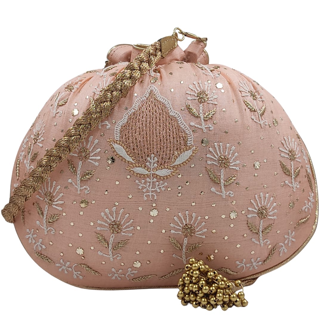 Add a touch of understated elegance to your ethnic ensemble with this charming handcrafted potli bag, made from luxurious tussar silk in a soft and soothing peach shade. Both sides of the bag are embellished with delicate Chikankari embroidery, enhanced with sparkling mukaish work that adds a graceful shimmer. The floral and central motif designs, done in white and gold thread, offer a refined and traditional aesthetic perfect for festive occasions. The potli features a golden braided handle and a traditional drawstring closure, finished with pearl bead tassels that enhance its ethnic appeal. Lightweight yet spacious enough for your essentials, this potli is ideal for weddings, poojas, or festive celebrations. Whether paired with a saree, salwar suit, or Indo-western outfit, this elegant accessory adds the perfect finishing touch to your look. A beautiful blend of heritage and modern design, it's a must-have addition to any ethnic wardrobe.
