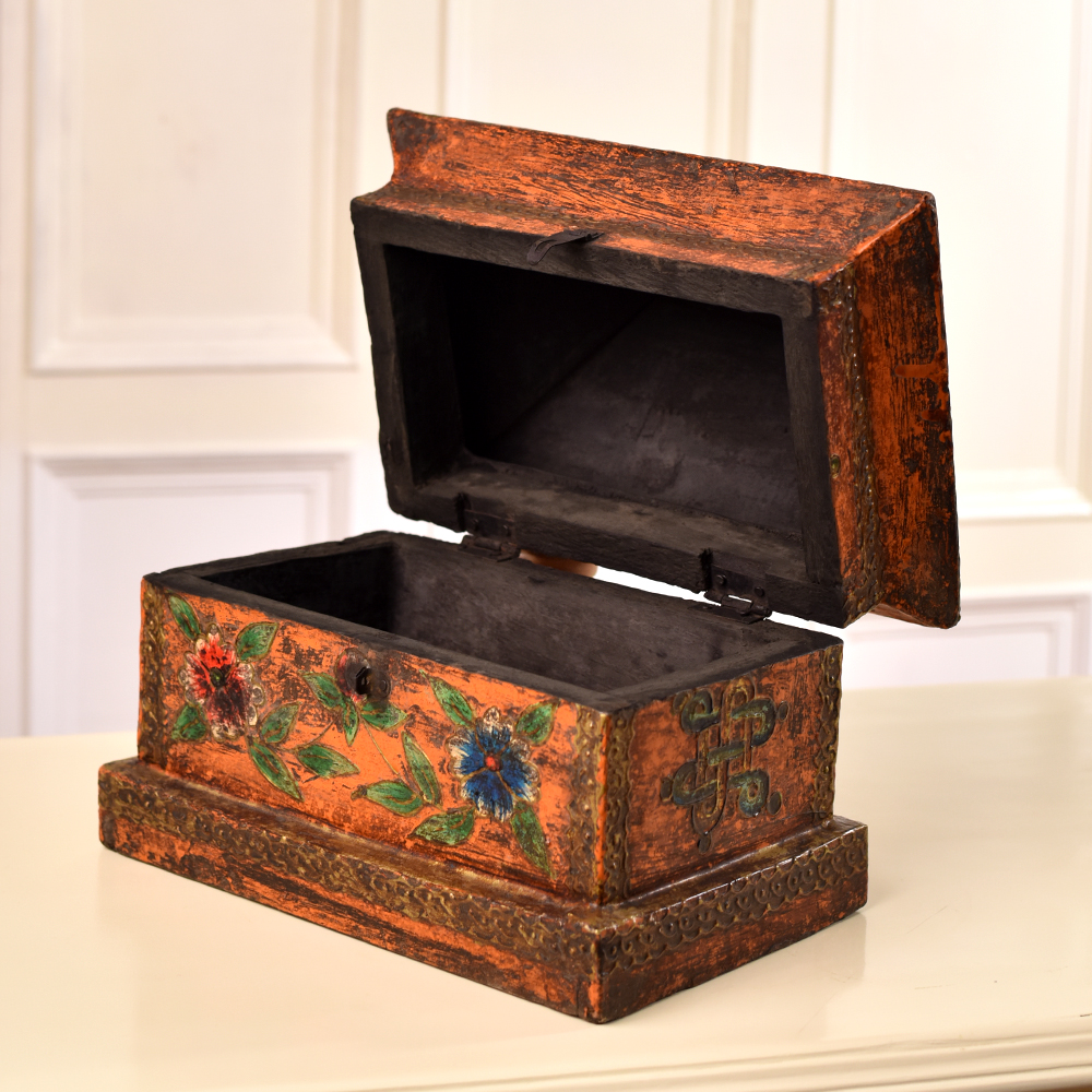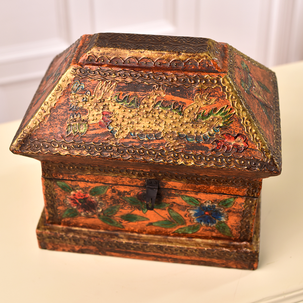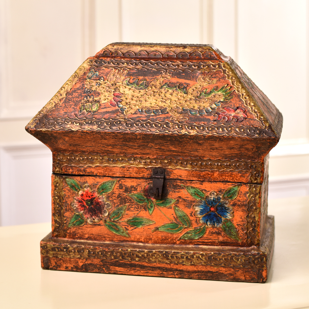 A Wooden Dragon and Floral Engraved Box which is a true masterpiece of craftsmanship created by skilled Indian craftsmen. This multi-coloured treasure chest is a testament to the artistry and dedication of these talented craftsmen, who have poured their heart and soul into every intricate detail. Crafted from high-quality wood, this handmade box showcases a stunning dragon and floral motif, painstakingly engraved on its surface. The intricate designs are a testament to the rich cultural heritage of India, and they add a touch of elegance and mystique to any space. With a secure latch, this box serves as a perfect repository for your cherished jewelry, keepsakes, or other small items. Its versatility knows no bounds, making it a stylish and functional addition to your home decor. You can even proudly display it at exhibitions to share its beauty with the world. This box is not just an accessory but also a meaningful gift. Share the beauty and artistry of Indian craftsmanship with your family, friends or relatives on special occasions or festive celebrations. Each box is a unique piece of art, a blend of tradition and contemporary utility, making it a remarkable and thoughtful present.