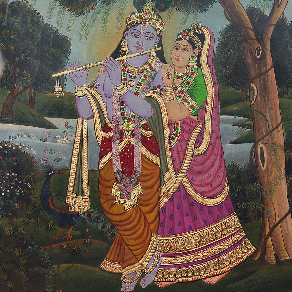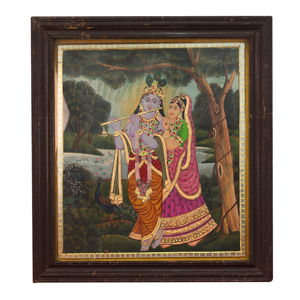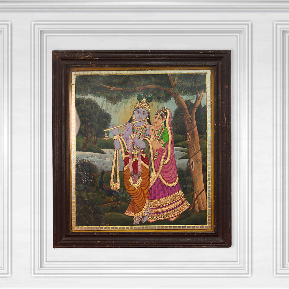 Immerse yourself in the captivating beauty of Indian art with this stunning Tanjore painting of Radha Krishna, masterfully crafted and preserved in a stunning frame. This exquisite work of art is a testament to the unparalleled skill and artistry of India's most revered painters, inviting you to explore the rich tapestry of Hindu mythology and elevate the ambiance of your space. The painting captures the divine love story of Radha and Krishna, the enchanting cowherd and the avatar of the god Vishnu. Radha's adoring gaze and Krishna's captivating charm create a mesmerizing visual that transports you to the enchanted realms of Hindu mythology. The rich hues and intricate details of this Tanjore painting will captivate your senses and ignite your imagination, inviting you to immerse yourself in the timeless beauty of this cultural heritage. Whether you're a collector of fine art, a devotee of Hindu culture, or simply someone who appreciates the beauty of timeless craftsmanship, this Tanjore painting is a must-have addition to your home or office. Display this stunning artwork and let it elevate the ambiance of your space, serving as a conversation piece that showcases your refined taste and appreciation for the arts. Surround yourself with the divine love story of Radha and Krishna and experience the transformative power of this exquisite Tanjore painting.