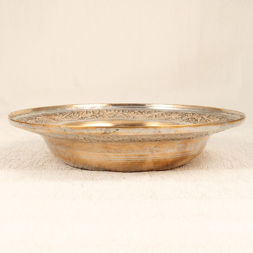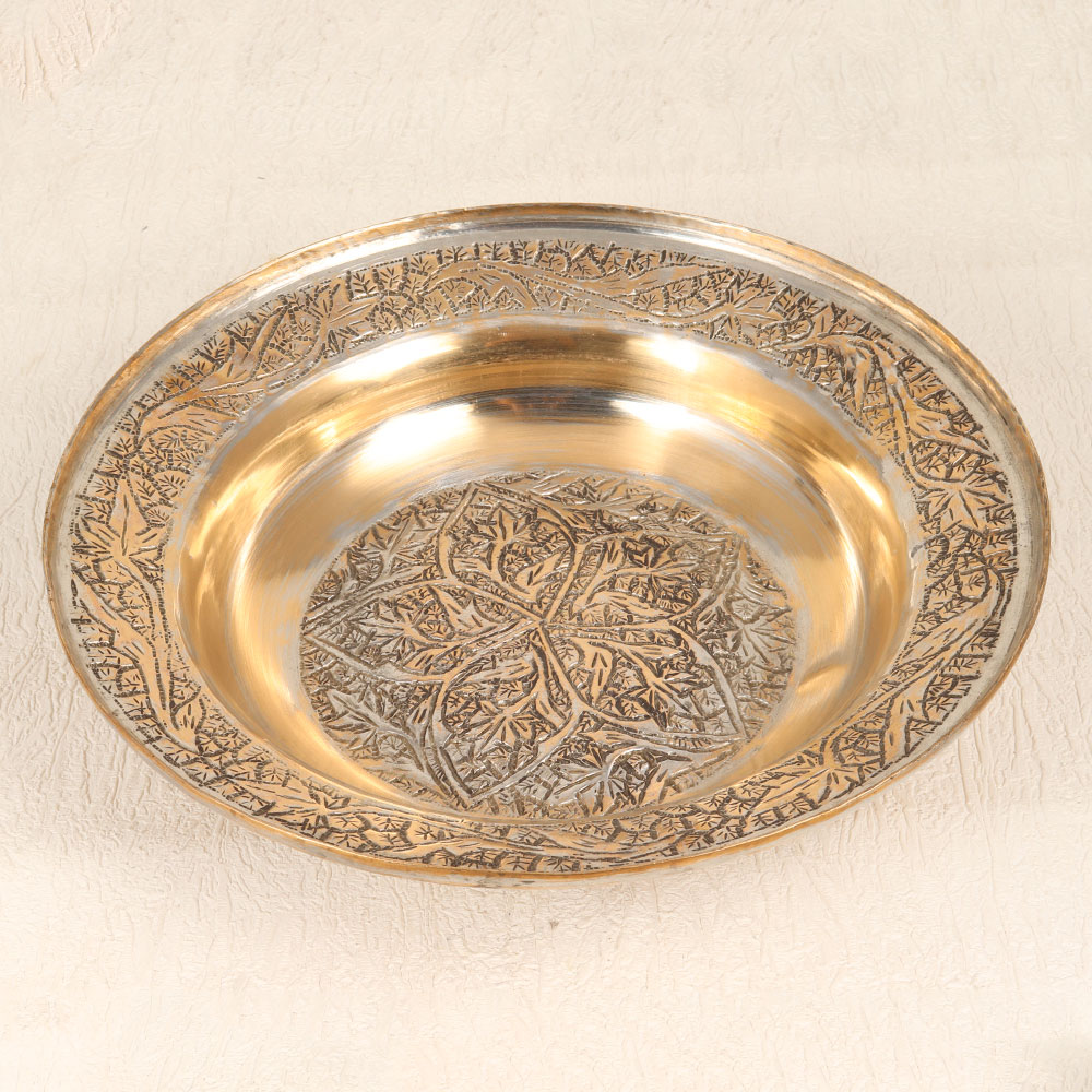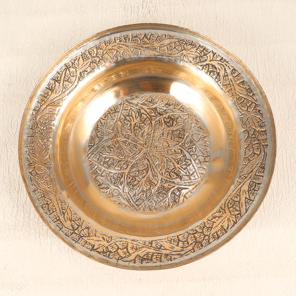 Show off your exquisite taste with this hand-engraved vintage brass plate. Featuring Kashmiri Art motifs, it makes a stunning decorative statement. This beautiful brass plate stands out with its ornate engraving and rich patina-like finish. The intricate Kashmiri Art motif pops against the plate's vintage brass base. With a large, impressive size, this plate is guaranteed to draw the eye wherever it's displayed. Perfect for instantly elevating your dining room, or anywhere your home needs an artistic focal point. The engraved brass artwork makes a sophisticated impression without saying a word. A gorgeous way to express your unique style!