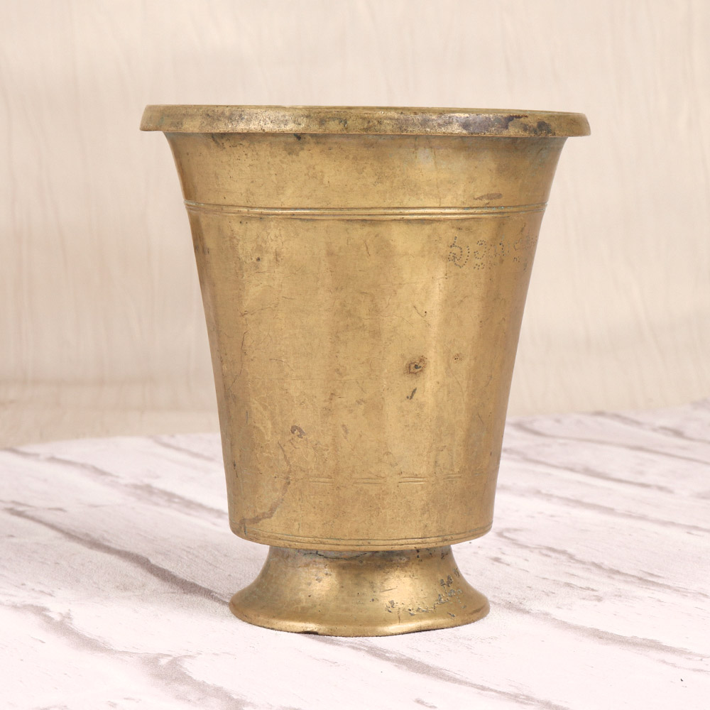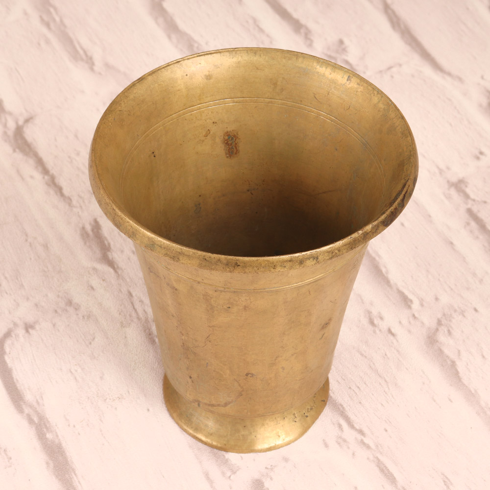 Bring the timeless elegance of South Indian tradition into your home with this captivating Vintage Brass Holy Water Cup. Crafted with meticulous attention to detail, this exquisite piece is a stunning fusion of form and function, perfect for adding a touch of spiritual ambiance to any space. Elevate your décor and connect with the timeless wisdom of South Indian culture by incorporating this Vintage Brass Holy Water Cup into your home. Its warm, earthy tones and captivating design will transform any room into a serene sanctuary, inviting you to pause, reflect, and embrace the beauty of tradition. Whether used for ceremonial purposes or simply as a stunning visual centerpiece, this cup will become a cherished heirloom that tells the story of your cultural heritage. Ideal for spiritual enthusiasts, interior design aficionados, and anyone seeking to infuse their living space with the enchanting essence of South India, this Vintage Brass Holy Water Cup is a must-have addition to any discerning collection. Elevate your rituals, enhance your décor, and connect with the timeless wisdom of the ages – all with the simple yet profound presence of this exquisite piece.