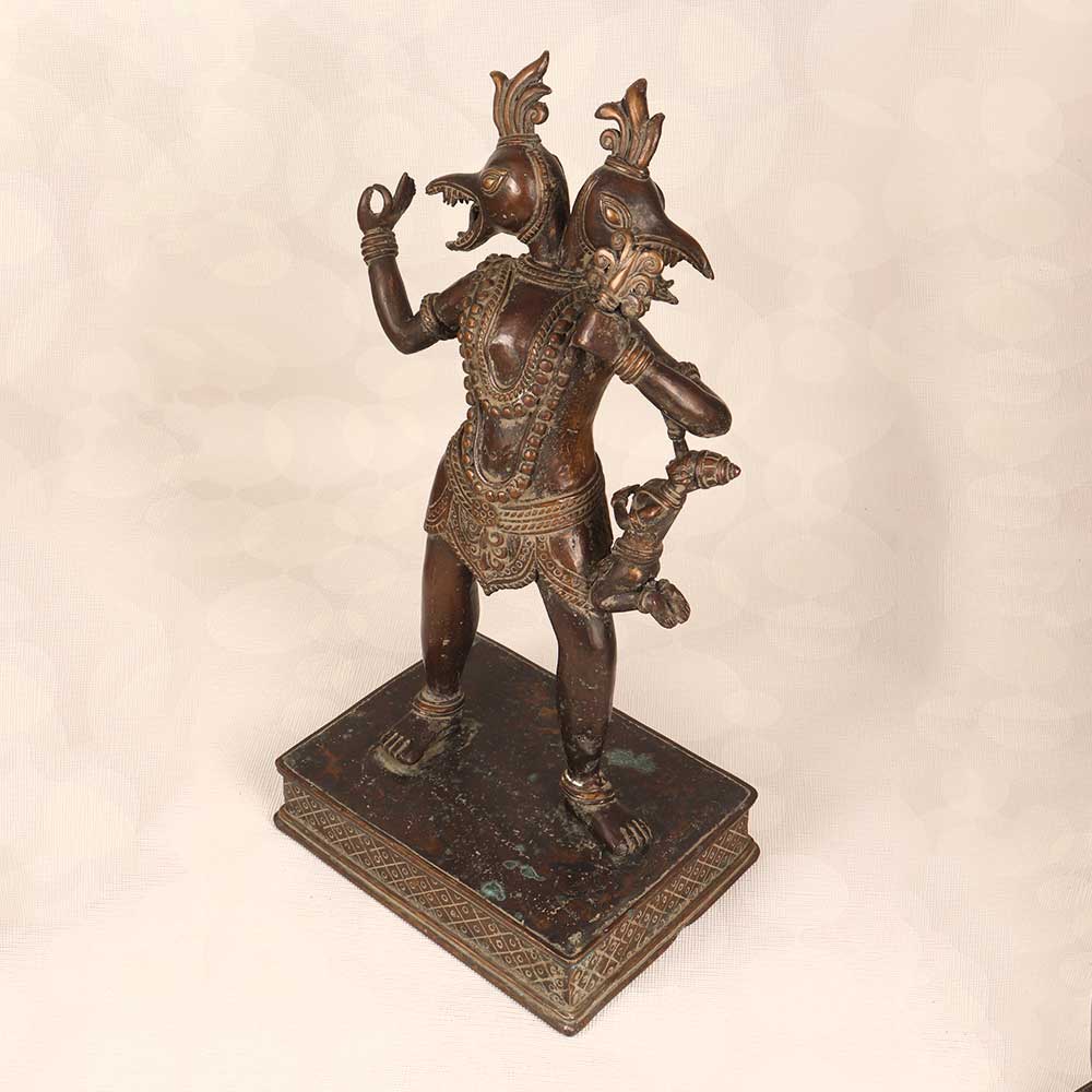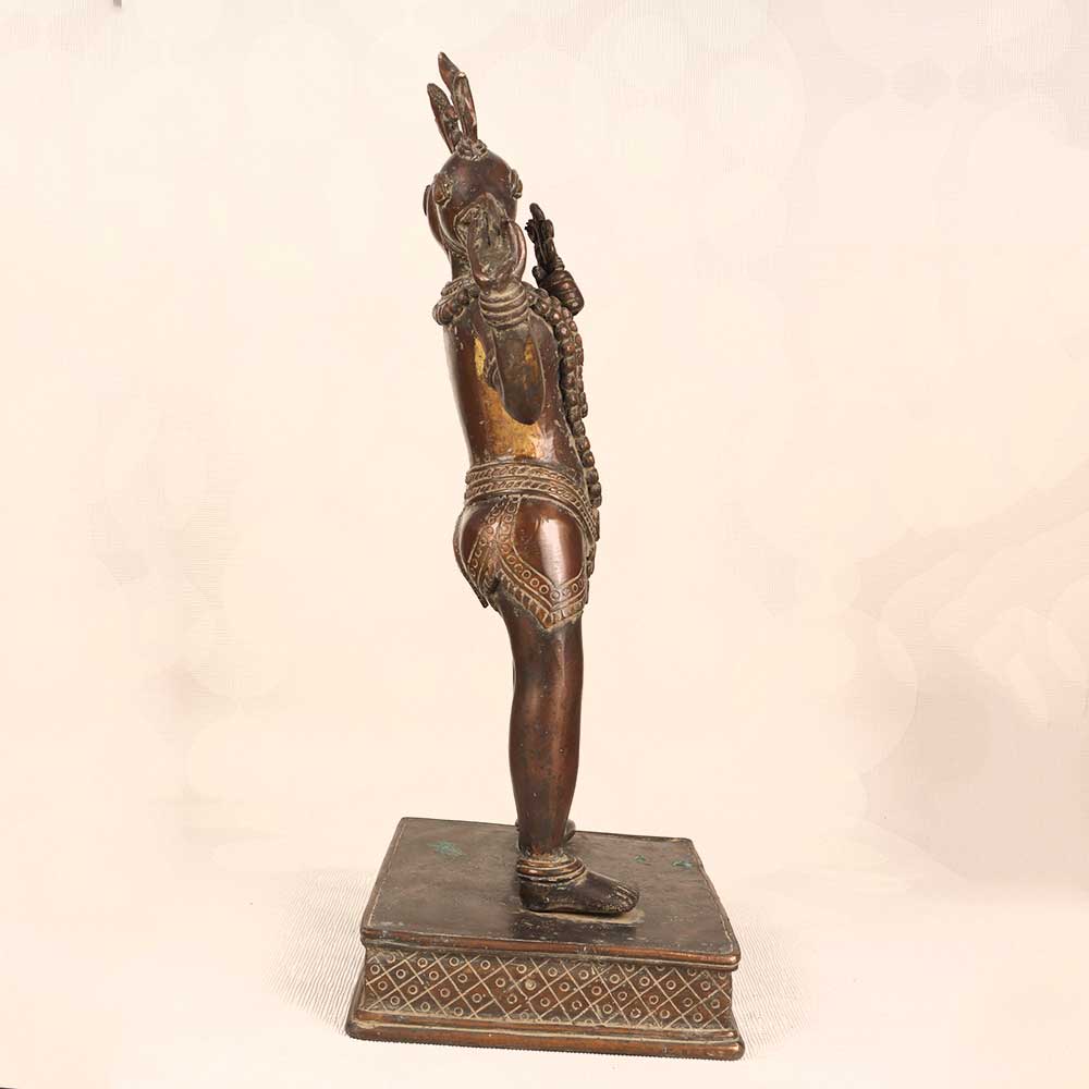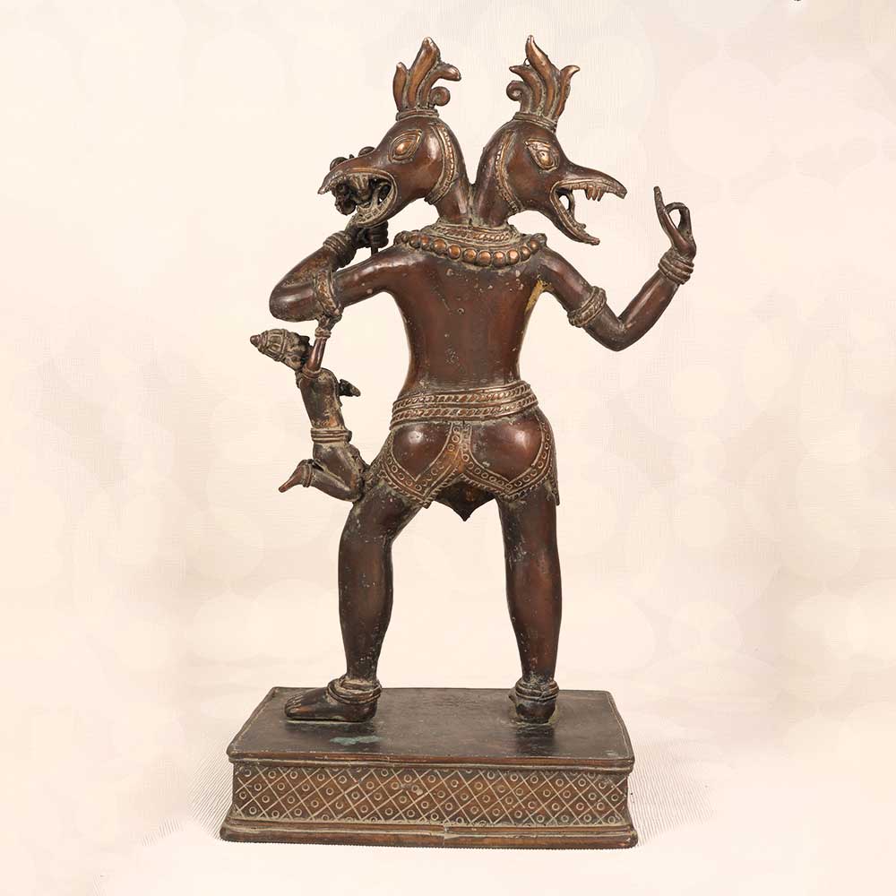 Behold the third avatar of Lord Vishnu with this antique brass God Varaha Statue. Showcasing the Himalayan Art style, it depicts the Lord as Varaha. This iconic scene from Hindu mythology comes alive in this brass sculpture. It captures the climatic moment when Lord Vishnu, incarnated as Varaha. The vintage brass finishing and carved details are remarkable. For devotees of Lord Vishnu, this Varaha statue will uplift your sacred space. Place it in your puja room to focus your meditation on the Lord's divine grace. Its presence will also accent your living room, office or any space with its divine aura. Bring home this antique Varaha statue today to immerse yourself in Hindu mythology and honor Lord Vishnu's protective powers. It's a must-have piece of Himalayan Art for collectors and spiritual seekers.