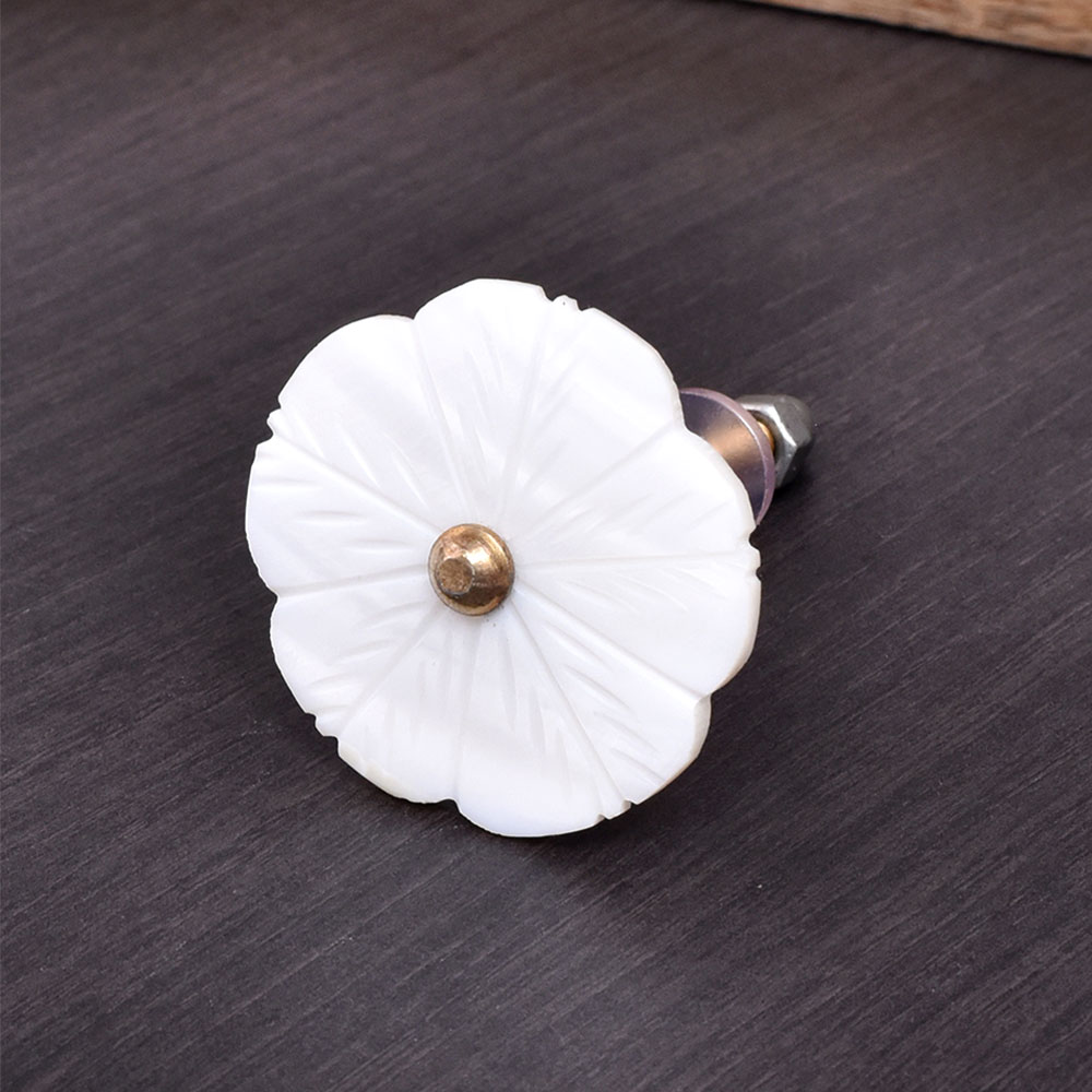 Each knob is meticulously crafted with fine attention to detail, featuring a delicately carved flower design. The smooth finish highlights the natural beauty of the mother of pearl, ensuring it stands out as a statement piece wherever it is installed.