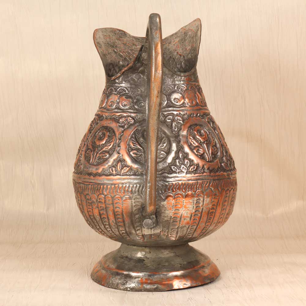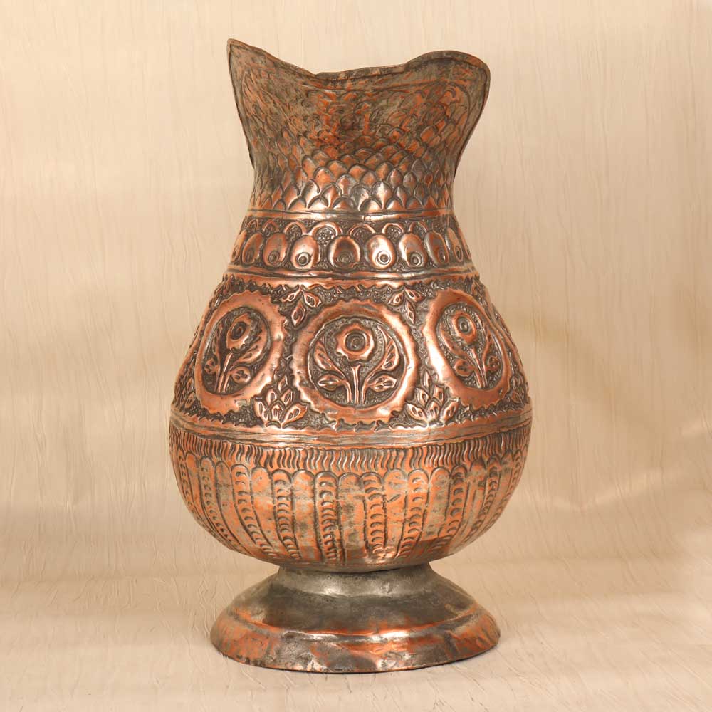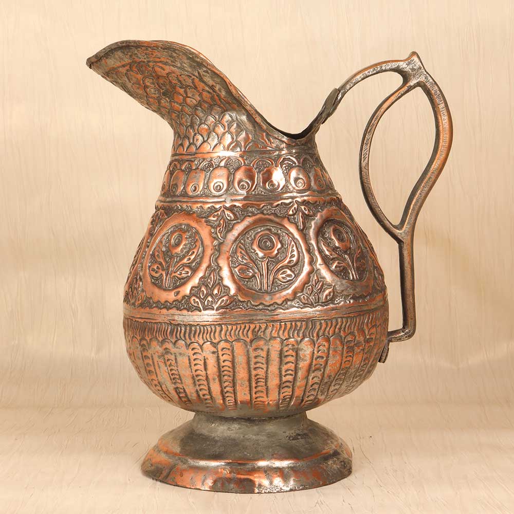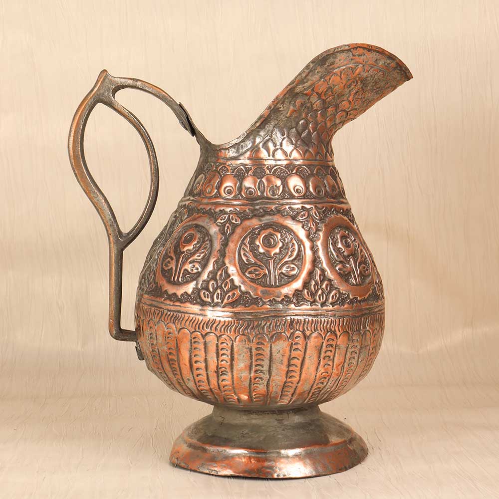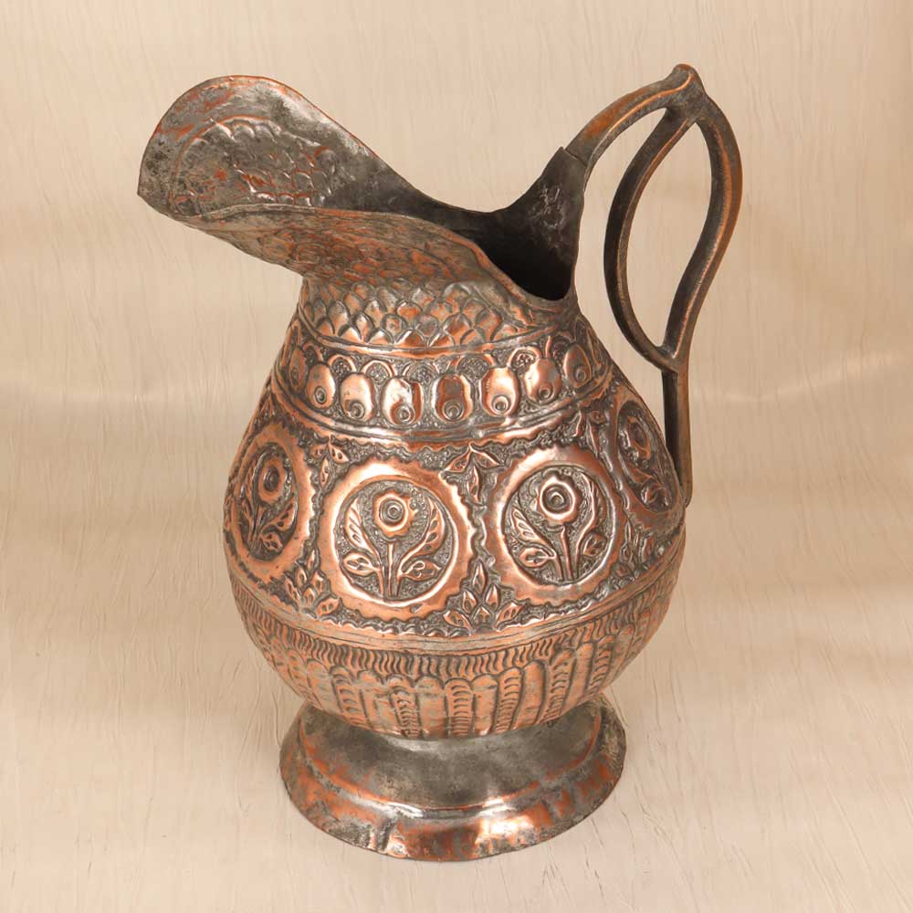 Let this hand-engraved vintage copper jug infuse your home with old-world artistry and warmth. Skilled artisans shaped the elegant form and hand-etched intricate Islamic motifs into the glowing copper using time-honored techniques. The result is a stunning work of functional art. This special jug beautifully marries form and function. Display it as an objet d'art to appreciate the detailed engraving and patina. Fill it with flowers or decor to add a touch of sophistication and artistry. However you use it, the motifs and glowing copper finish create visual interest and spark conversation. For those who appreciate Islamic designs, vintage appeal, and decorative art, this handmade engraved copper jug is a treasure. Place it in an entryway, office, dining room, or anywhere you want an instant infusion of old-world sophistication and charm.
