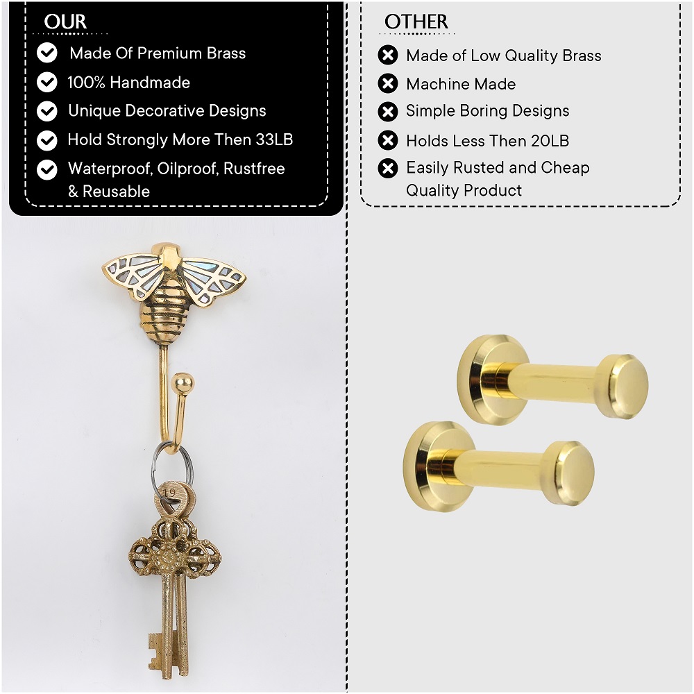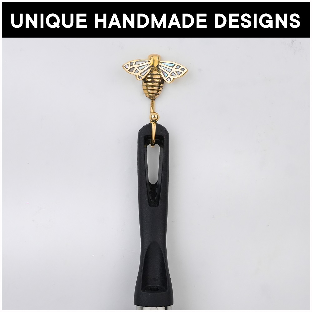 Add a touch of elegance and artistry to your walls with this Bee Design Brass & Mother of Pearl Wall Hook. Expertly handcrafted from premium brass, this charming hook features a bee-shaped design beautifully inlaid with shimmering Mother of Pearl detailing blending luxury with functionality. Perfect for hanging towels, bags, keys, or accessories, this wall hook is not just a utility piece but also a stylish dcor accent. Its sturdy construction ensures durability, while the polished golden finish and pearly highlights bring a warm, sophisticated glow to any space be it your bathroom, entryway, or bedroom.