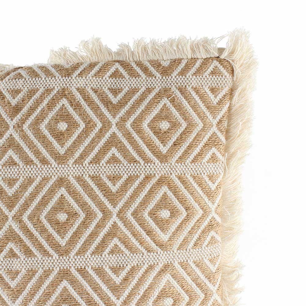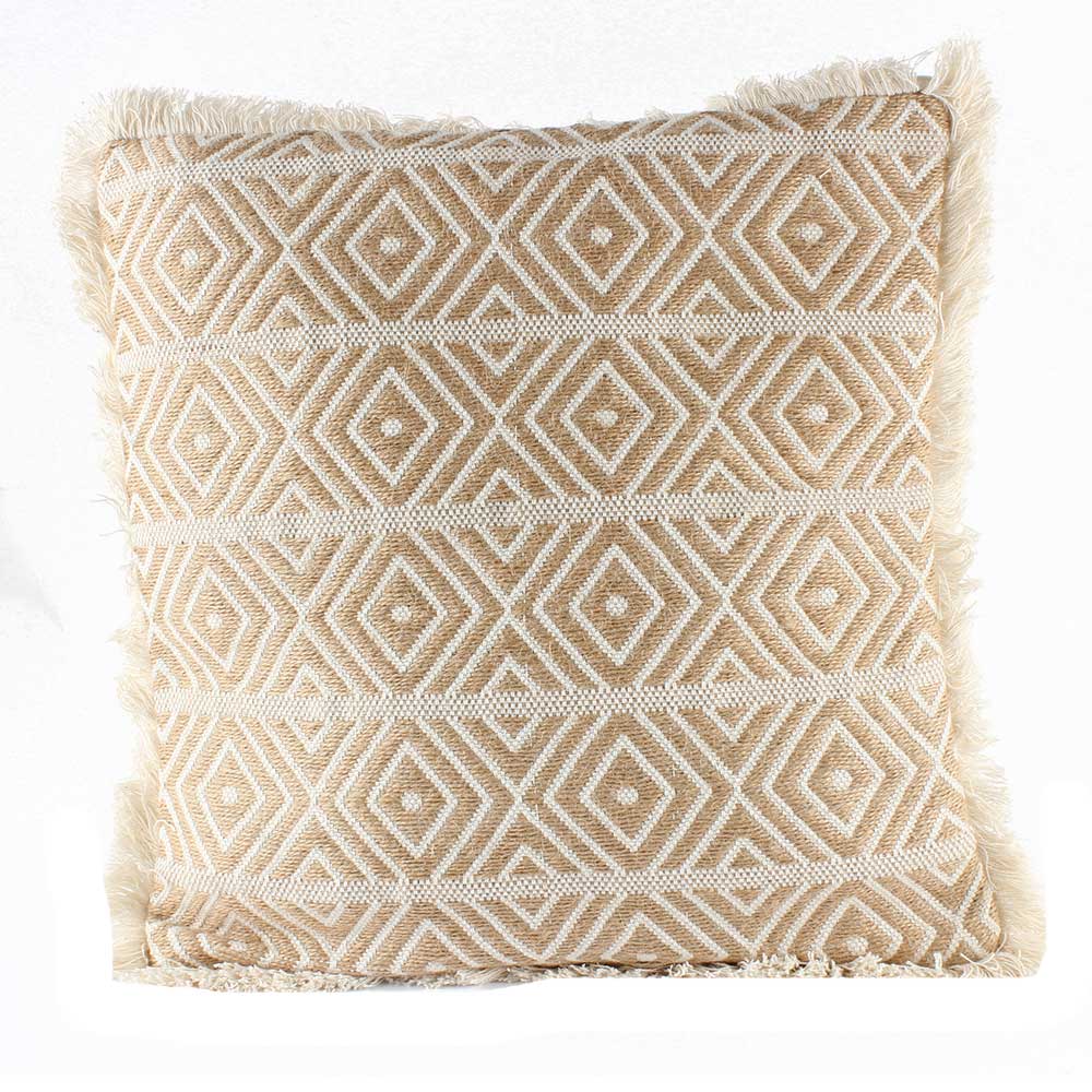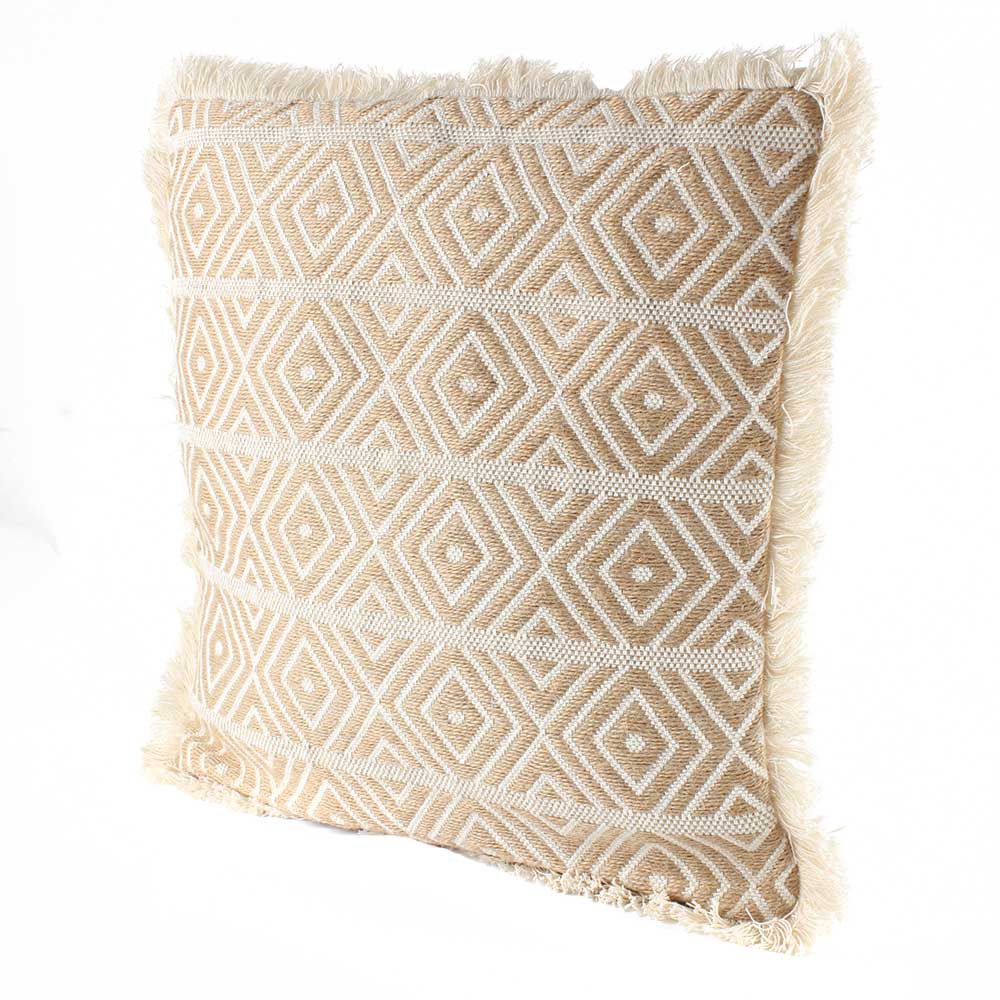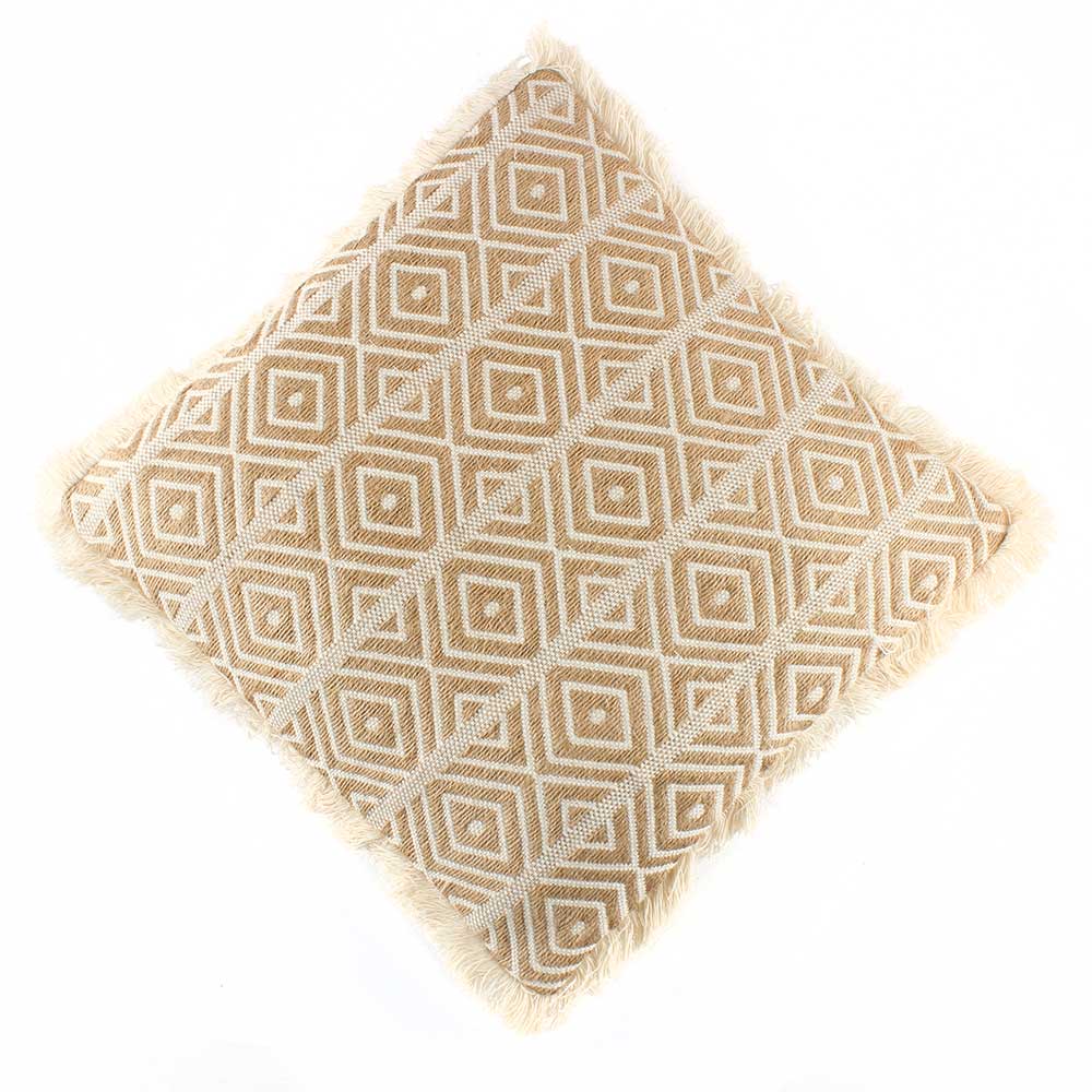 Embroidered with a wonderful fringe border covering all four sides and a stunning pattern of geometric diamond design in mild beige color. This cushion cover will look great in any situation.