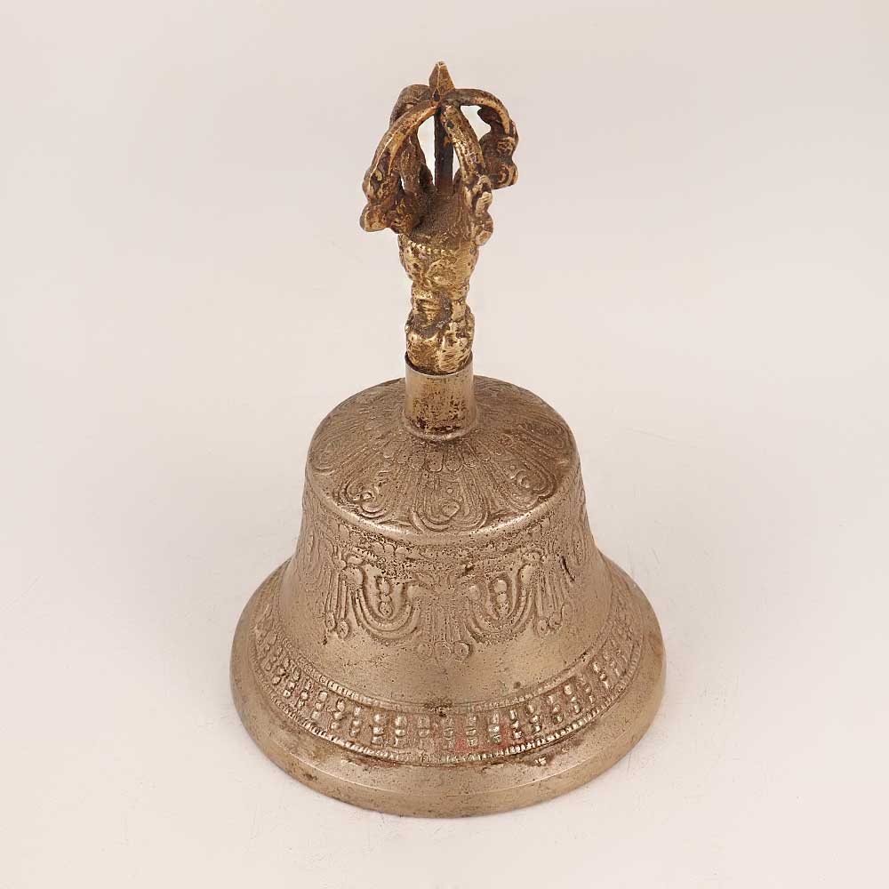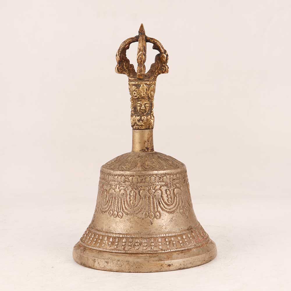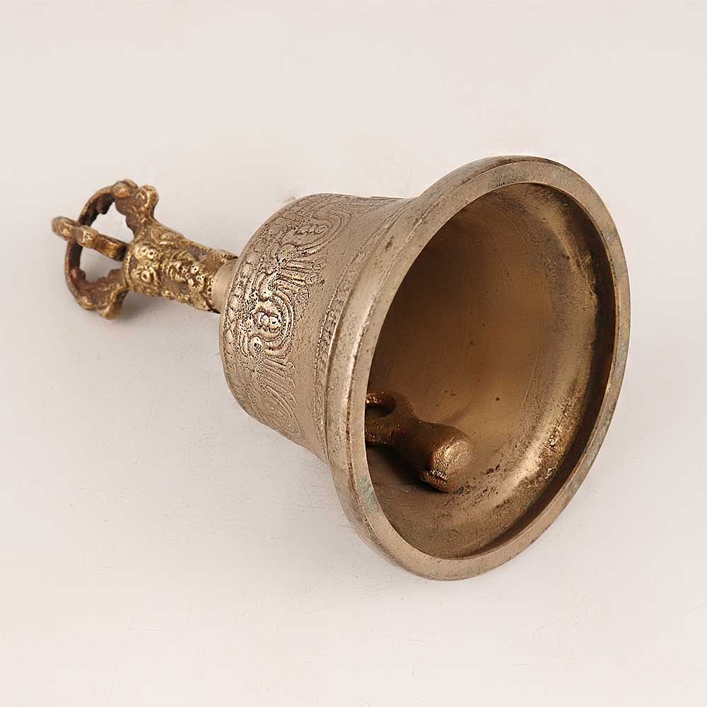 Experience the serenity of Buddhist art with our exquisite Bell Metal Temple Bell. This masterpiece boasts intricate engravings that encapsulate the essence of Buddhist spirituality. The handle features a meticulously crafted deity, adding a touch of divinity to its already captivating design. Meticulously handcrafted by skilled craftsmen, this bell is made from high-quality bell metal, ensuring its durability and resonance. Its antique brown finish exudes an old-world charm, making it a timeless addition to any space. Perfectly versatile, this bell fits seamlessly into various settings – be it your home, office, restaurant, hotel, or cafe's prayer room. Its soothing chime makes it ideal for morning and evening prayers, bringing a sense of tranquillity to your surroundings. Beyond its spiritual significance, this bell doubles as a captivating display piece, suitable for exhibitions or vintage collections. It's a thoughtful gift option for your family, friends or relatives on special, festive, or auspicious occasions, carrying not just the physical beauty, but also a sense of spiritual connection and positive energy.