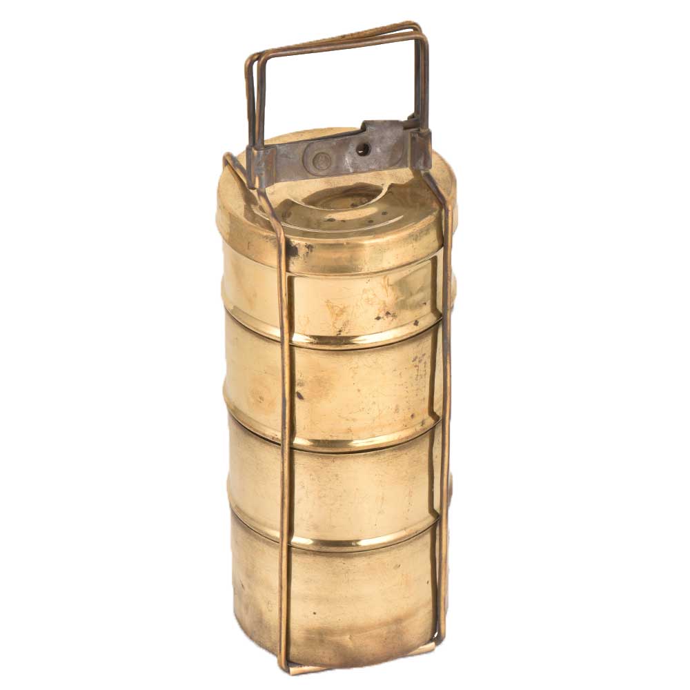 This is a very popular brass Tiffin box design that has four round containers and a brass strap frame that holds the container s together. It comes with lovely golden polish and is often used as a home decoration product, gift for friends and relatives, for presentation of food and table decoration product.