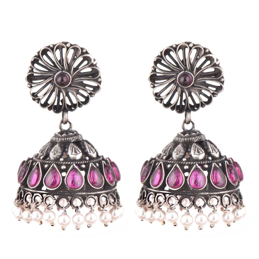 Big floral stud made in 92.5 Sterling silver jhumki with amethyst stones on the jhumki with pearl beads tassels. Wear it at party, engagement ceremony, daily wear, office wear and birthday party . Gift it to yourself or your near and dear ones.