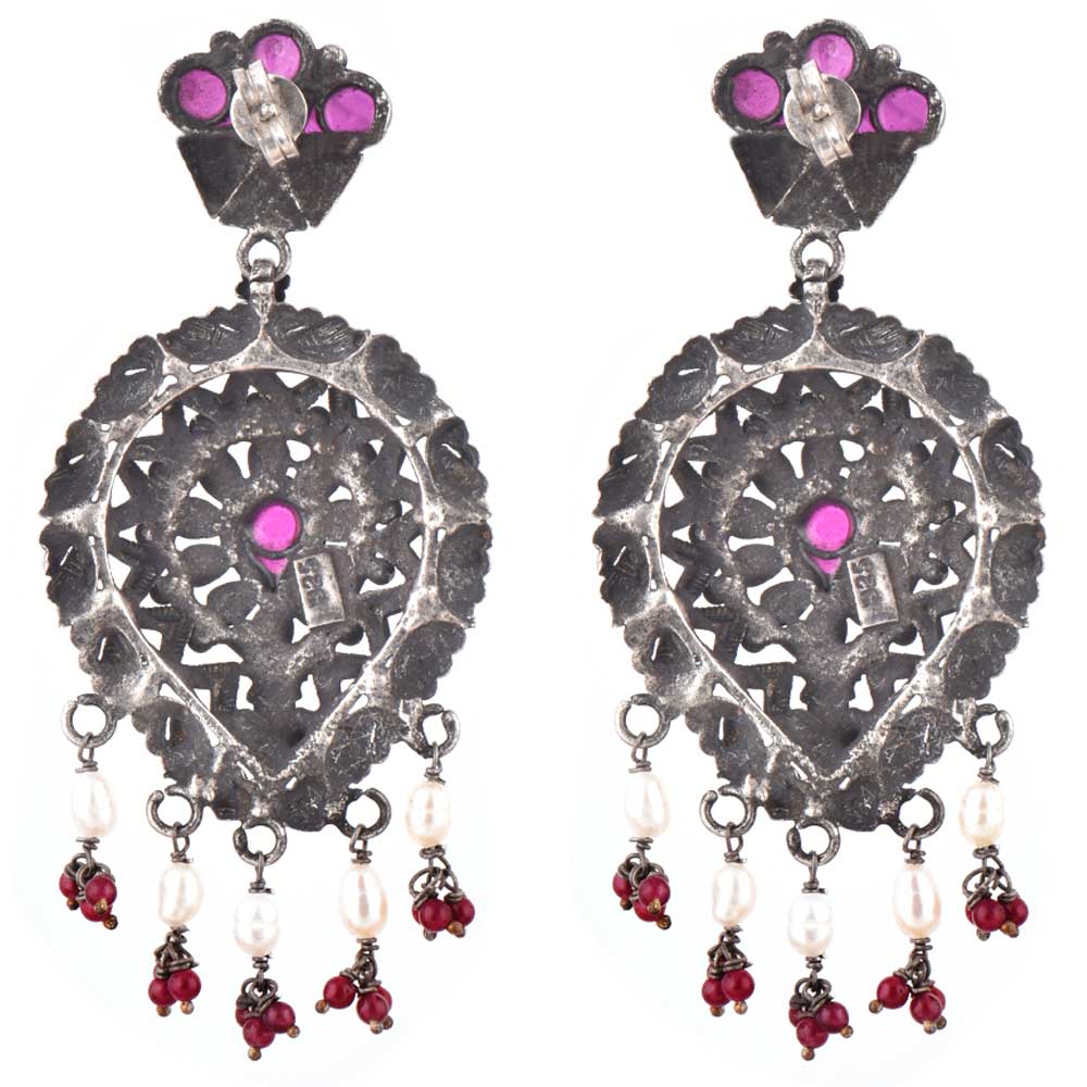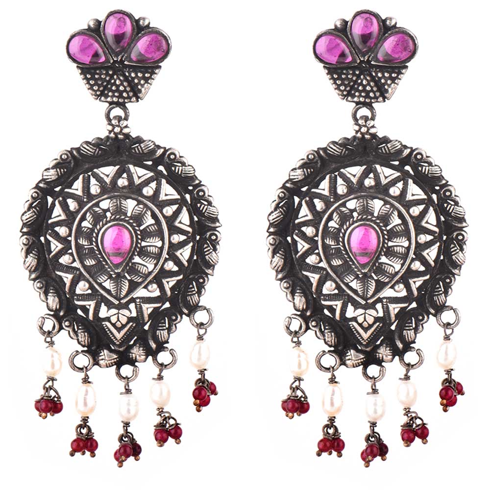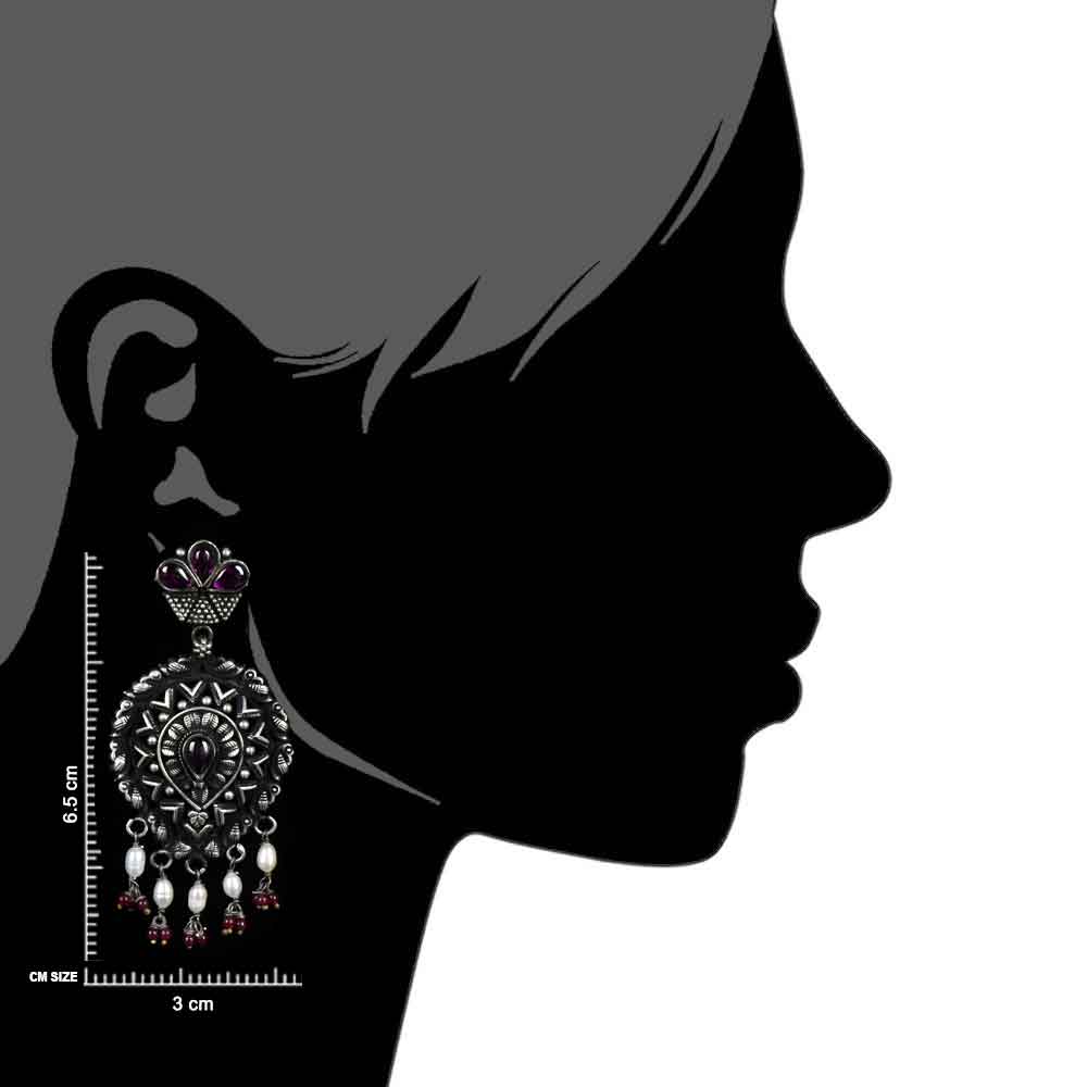 Big Danglers made in 92.5 Sterling silver earrings with engraved floral and triangular flower pattern with amethyst red coral And pearl stone studded tassel earring for women. Team it up with your favorite sari, suit , palazzos or other forma functions.