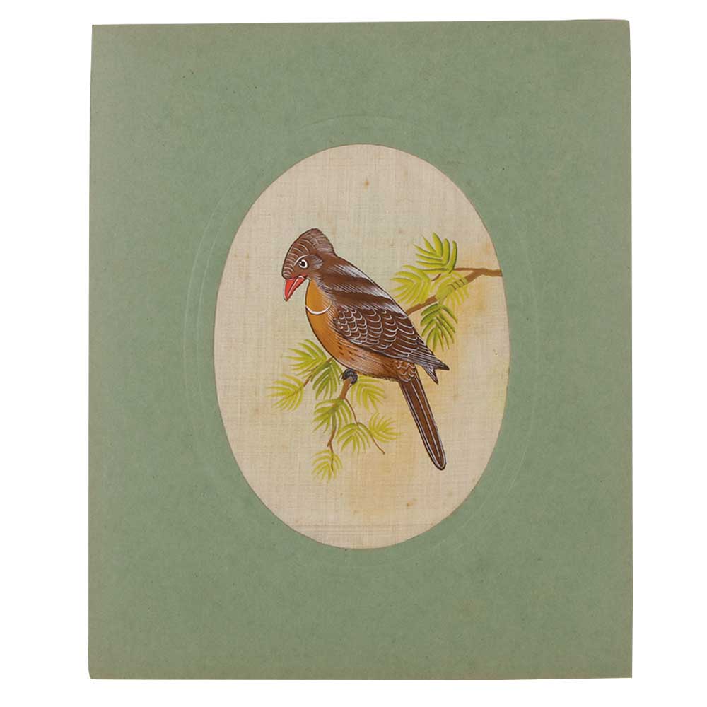Fabric is used as a base for the painting. Working over it with thick layerd materials, leaving bits open, showing the bird or other parts of the fabric.