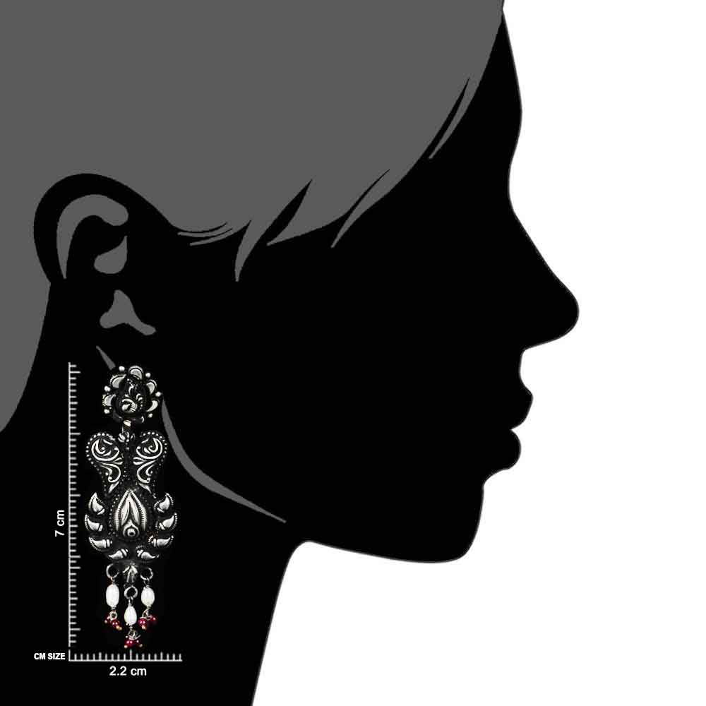 A very unusual 92.5 sterling silver earrings black oxidized color Floral pattern on the stud and conch motifs on the dangler added color with red coral bead hanging on the bottom. Wear it yourself or gift to your near and dear ones on cocktail, reception, baby shower or birthday.