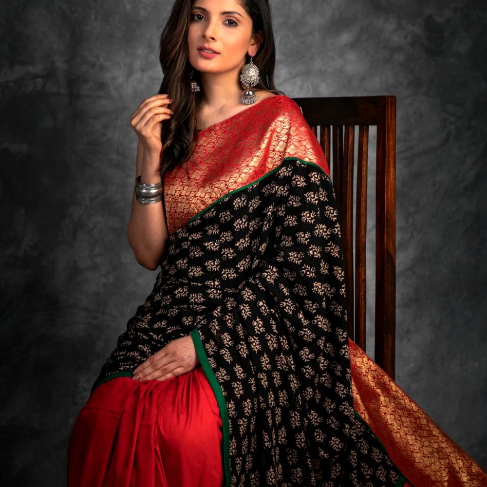This stunning saree is a graceful blend of heritage and elegance, featuring pure Ajrak hand-block printed cotton paired with a rich Banarasi silk pallu and border. The black body is adorned with traditional Ajrak motifs using natural dyes, showcasing the intricate craftsmanship rooted in centuries-old textile traditions. The vibrant red Banarasi silk border and pallu are woven with fine golden zari and framed with a striking green piping, adding a bold yet refined contrast. Lightweight and breathable, the cotton fabric ensures comfort for all-day wear, while the Banarasi silk lends a regal finish, making it ideal for festive occasions, cultural celebrations, or elegant evening affairs.