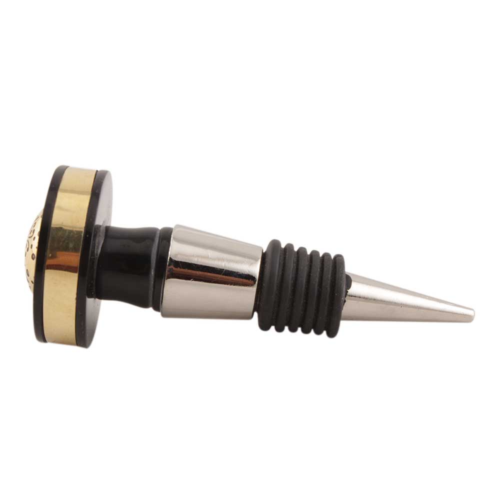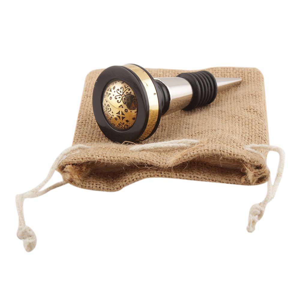 Black And Golden Brass Tiny Flower Resin Wine Stopper. Zinc Alloy Wine Bottle Stopper with Attractive Jute Bag Packaging.