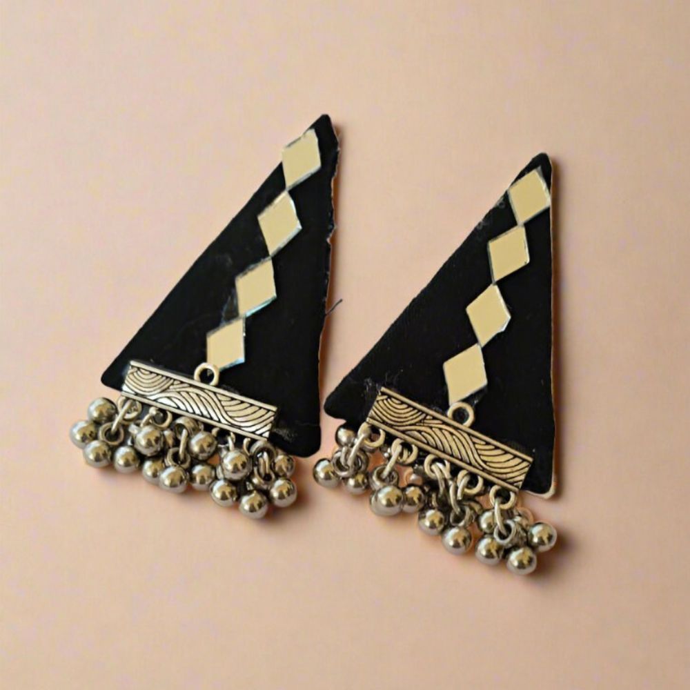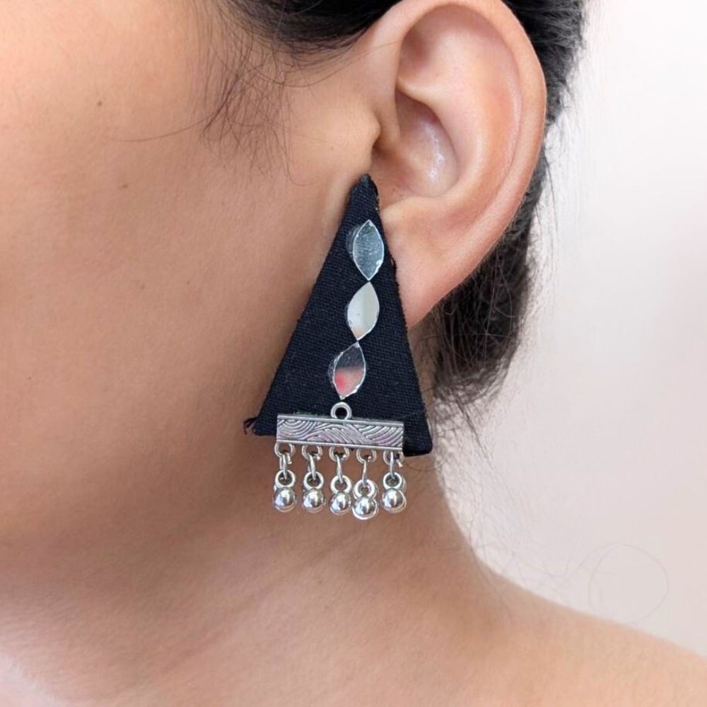 The Black and Silver Mirror Triangular Studs Earrings for Women are a bold expression of modern form blended with handcrafted detail. Crafted on a fabric base, the deep black surface creates a striking backdrop for silver-toned mirror accents that reflect light with subtle intensity. The triangular silhouette adds a contemporary edge, making these studs visually strong yet easy to wear. Designed for comfort and statement appeal, they transition seamlessly from everyday looks to festive styling.