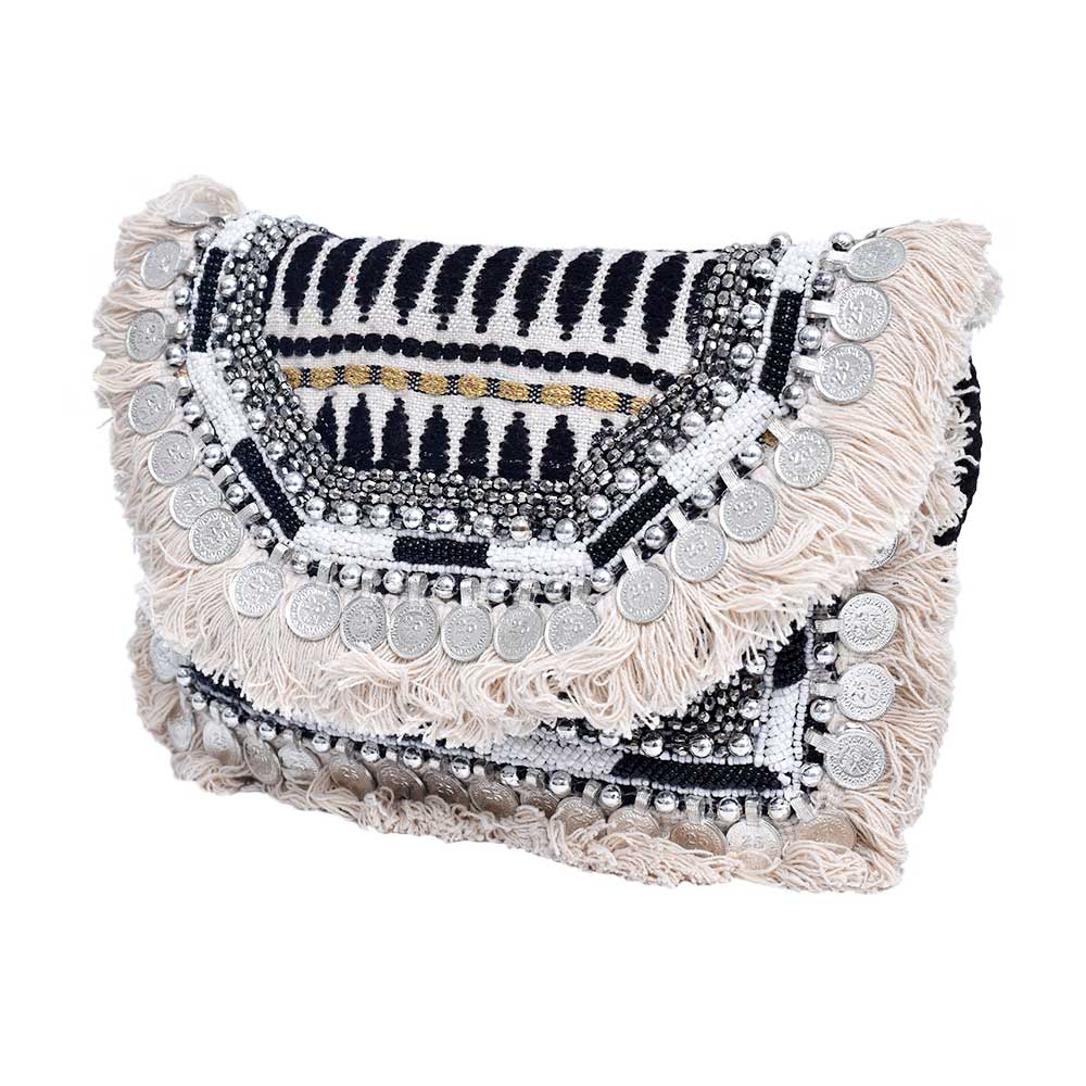 This handcrafted Boho bag is the ideal arm candy and looks stylish when worn with both western and ethnic festive outfits. With metallic beads, coins, thread tassels, and fringe detail on the sides, this timeless black handbag with a sling is hand embroidered. The bag has a magnetic snap button and a flap. With these as a clutch or cross body bags with your modern outfits for a fun Boho vibe, spice up your festive look.
