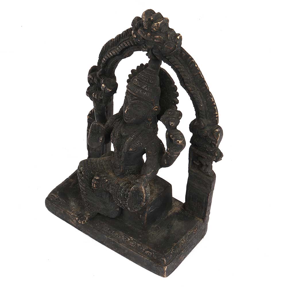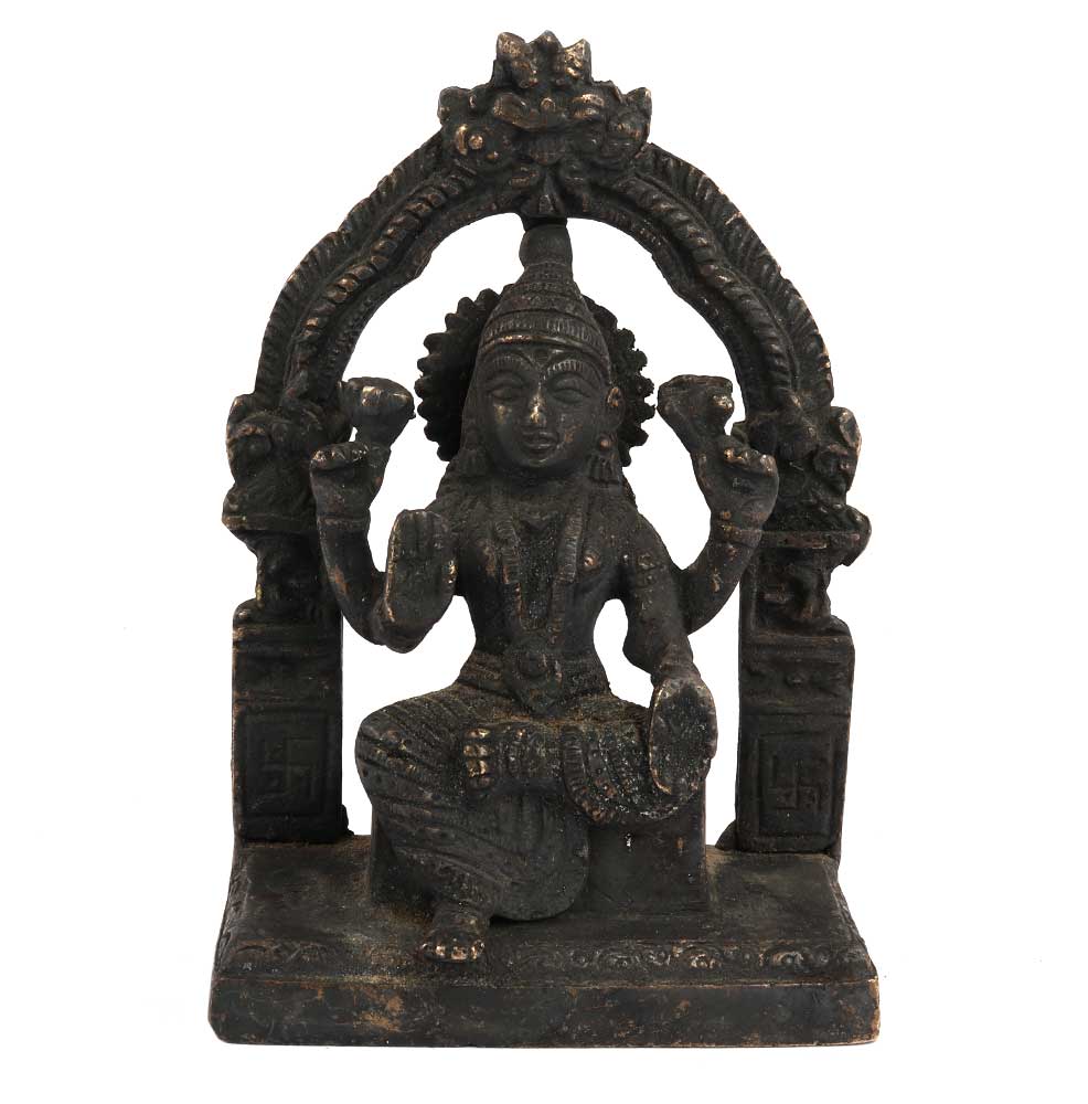 Black Brass Goddess Laxmi Statue On Chowki And Prabhavali .The Goddess Lakshmi is Shown Having Four Arms and Sometimes Standing on a Blooming Lotus Flower and used for worship ,House warming , Office / Shop Inauguration gift,Grah pravesh and Corporate Gifts.