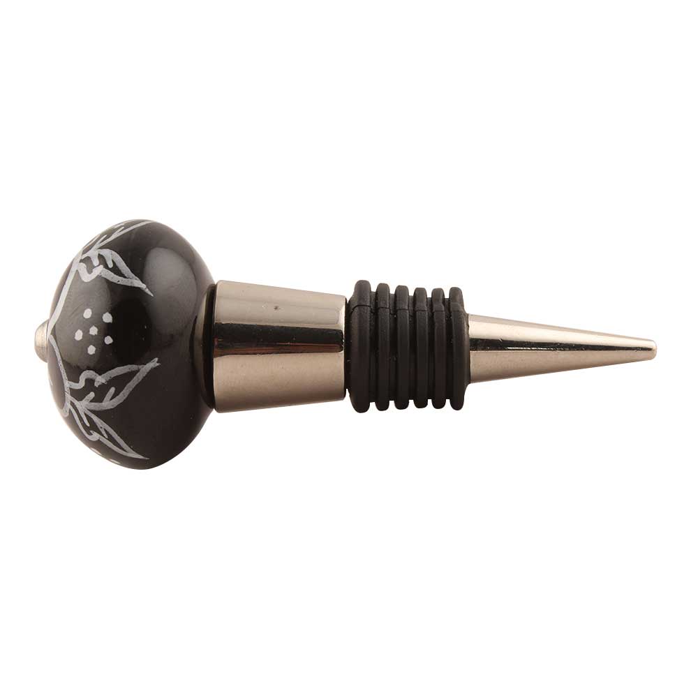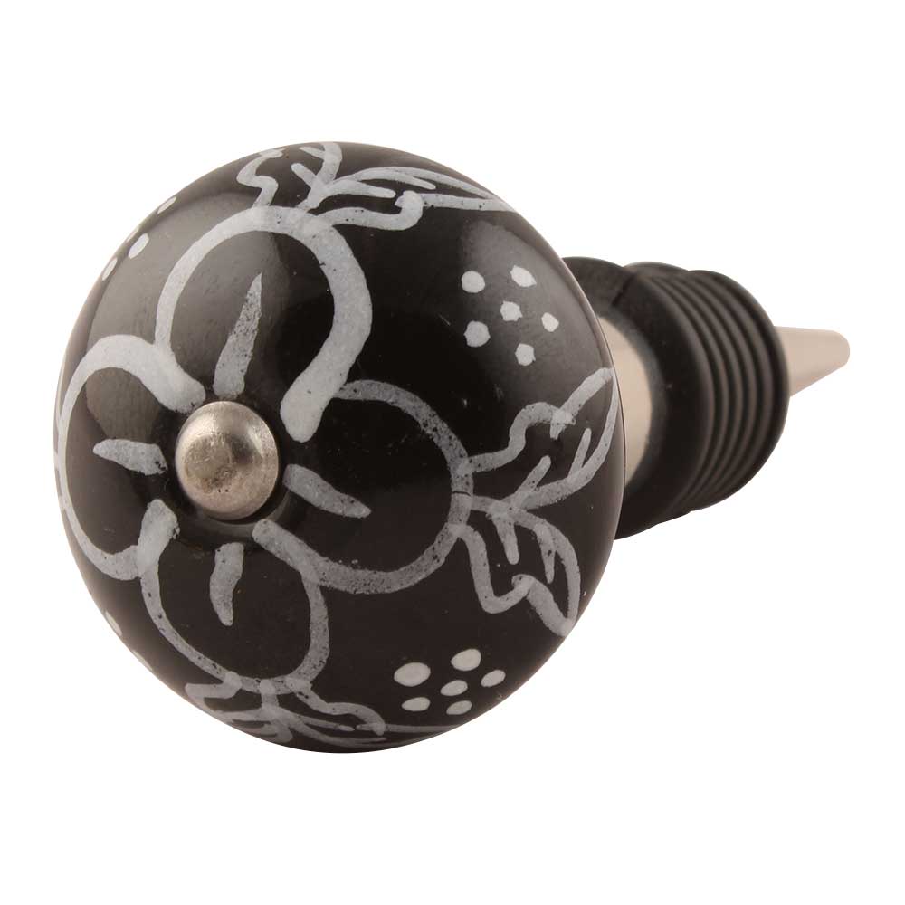 Black Ceramic Floral Wine Stopper. Zinc Alloy Wine Bottle Stopper with Attractive Jute Bag Packaging.