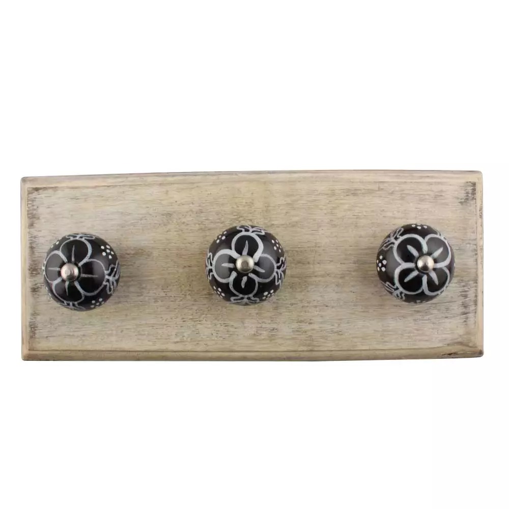 Material: Solid Natural wood base with hand-painted ceramic knob Finish: Glossy black glaze with floral detailing; sealed natural wood Installation: Hidden screw mount with included anchors and hardware